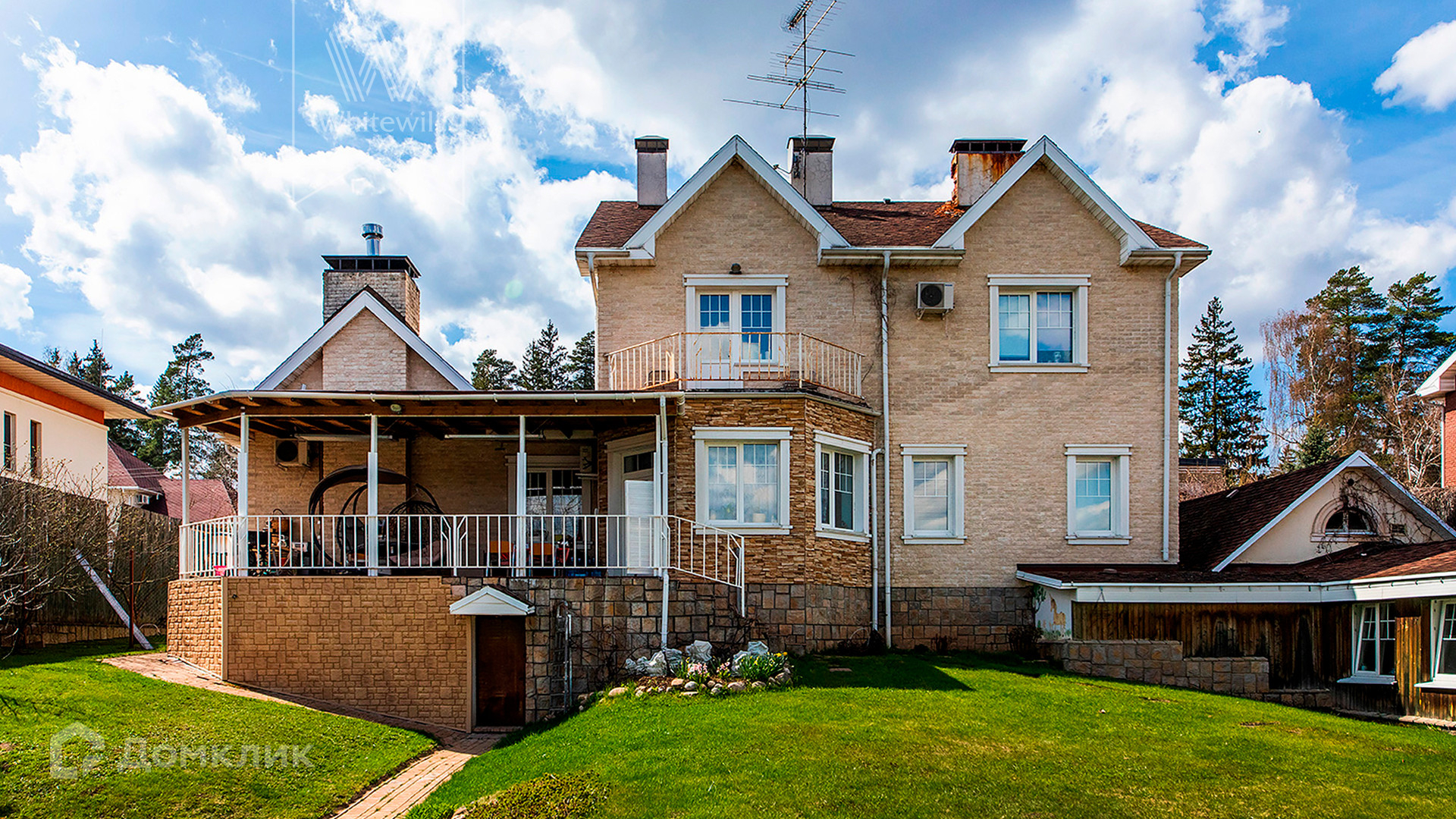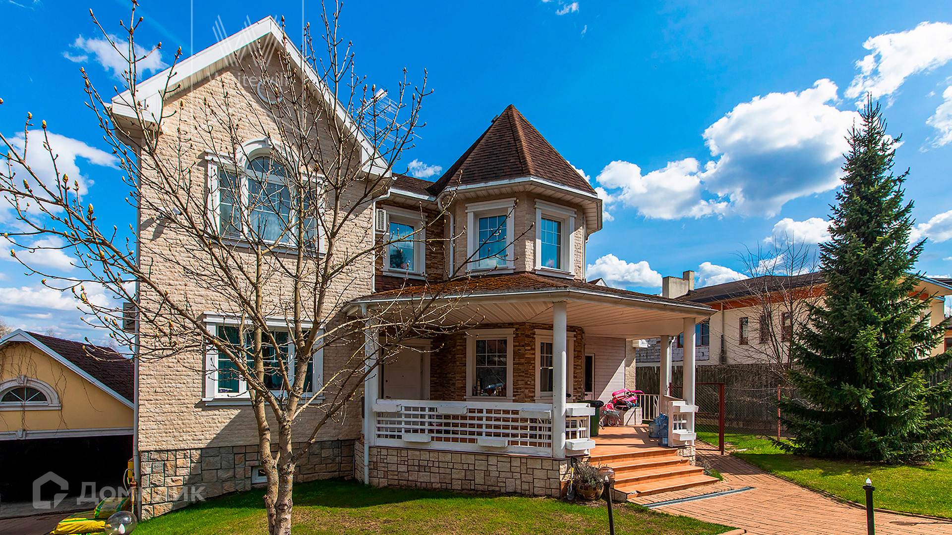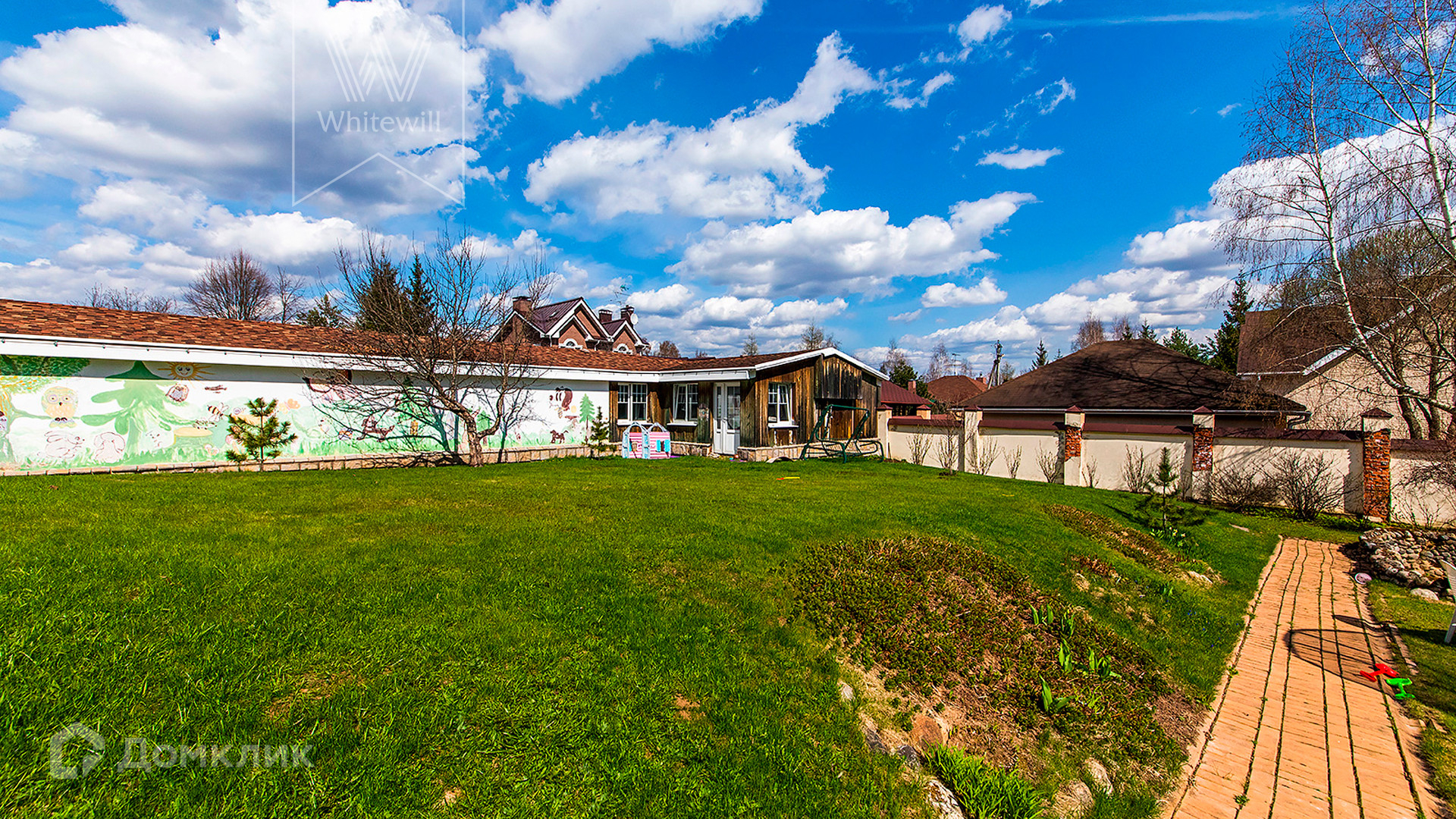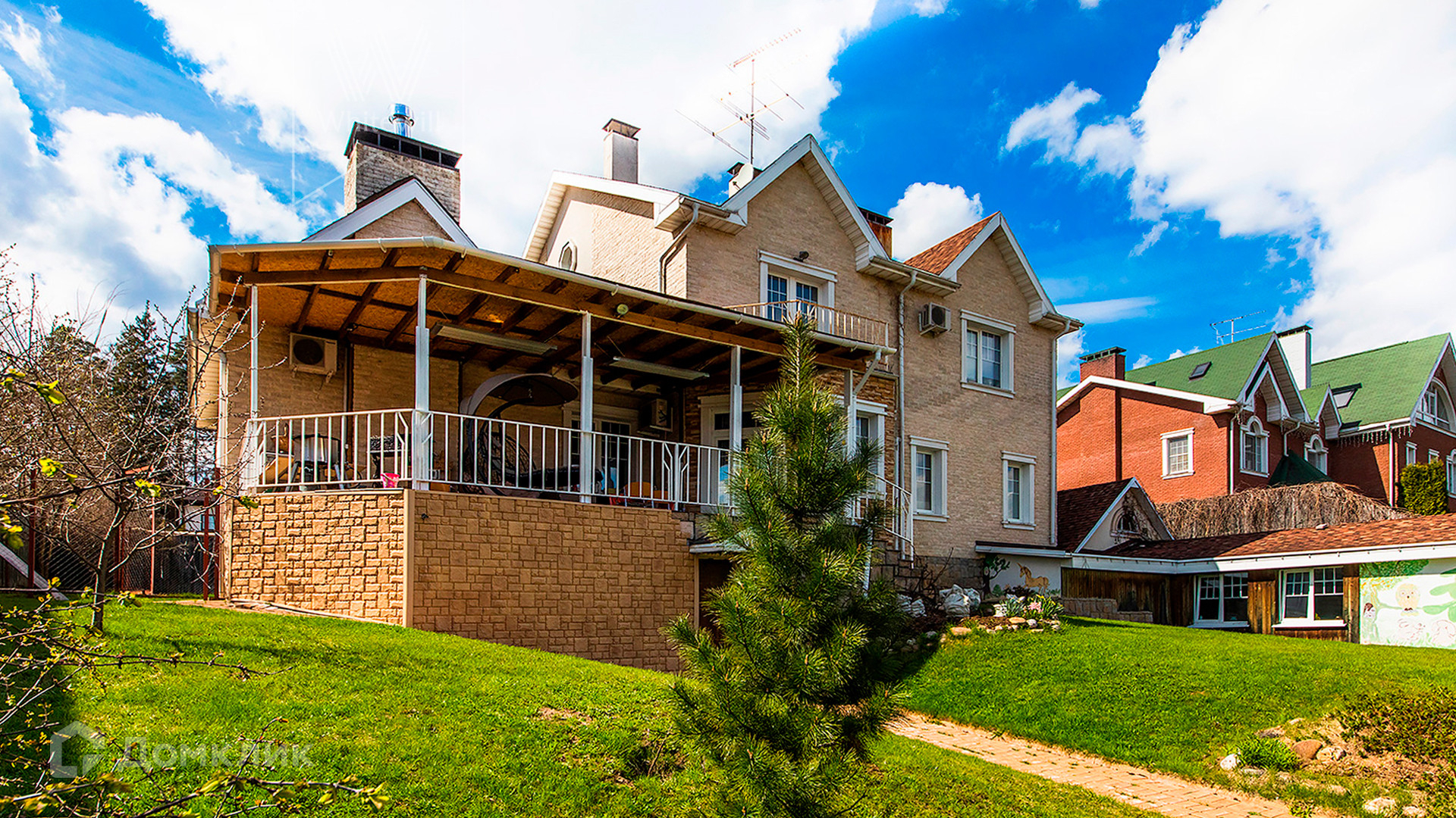 ID 10 330. Новорижский (Борки-3). Загородный дом площадью 650 м² расположен на участке 15 соток с рельефом. Фасад в европейском стиле облицован бежевой клинкерной плиткой разных оттенков. Интерьер наполнен красками и яркими акцентами. Коттедж полностью меблирован, установлена бытовая техника. Внутри спланировали 8 спален, гостиную с камином, кухню с барной стойкой, кабинет, винную комнату, бассейн длиной 25 метров, сауну и гараж на 2 машины. На участке выполнен ландшафтный дизайн, обустроен пруд, высажены декоративные и плодовые деревья, кустарники.