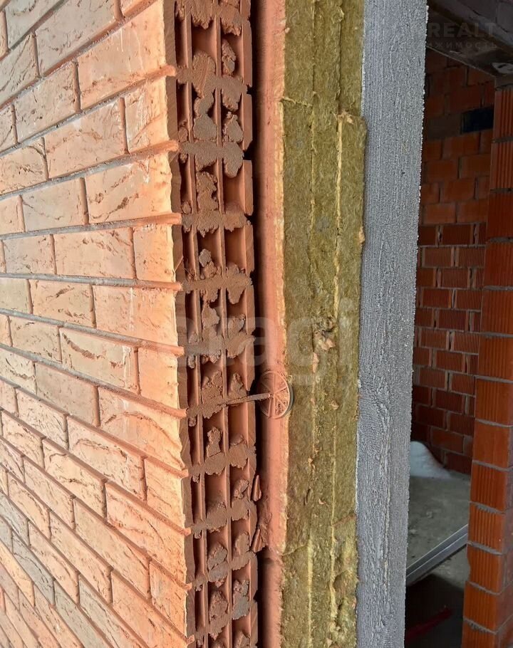 Дом возведен по монолитной технологии с усиленной теплоизоляцией: наружные стены состоят из лицевого кирпича (120 мм), воздушной прослойки (30 мм), жестких минераловатных плит (150 мм) и монолитного железобетона (150 мм), что гарантирует прочность и энергоэффективность.