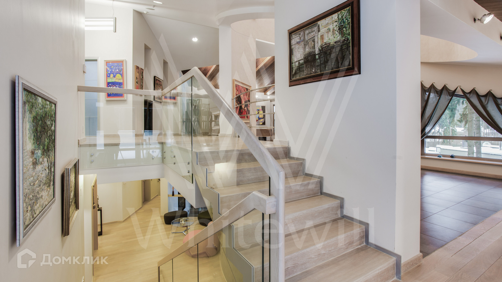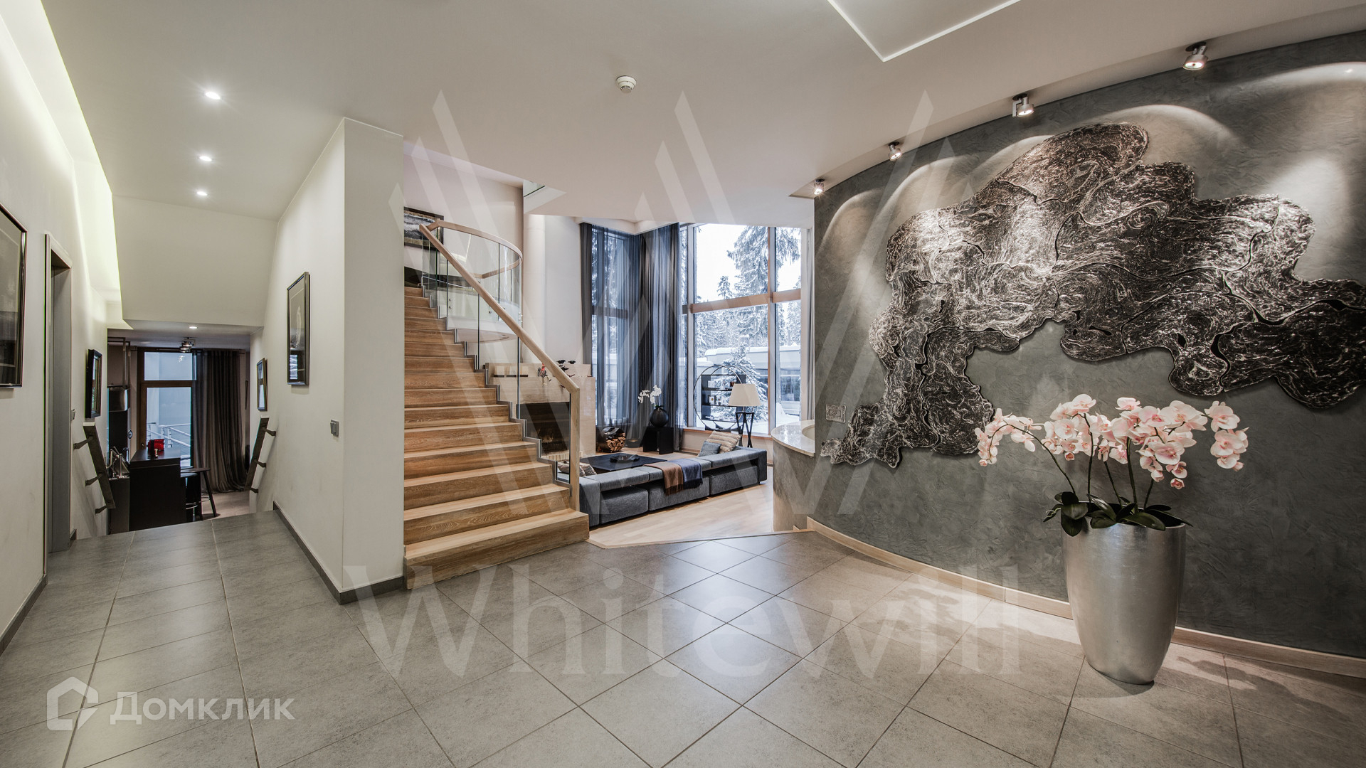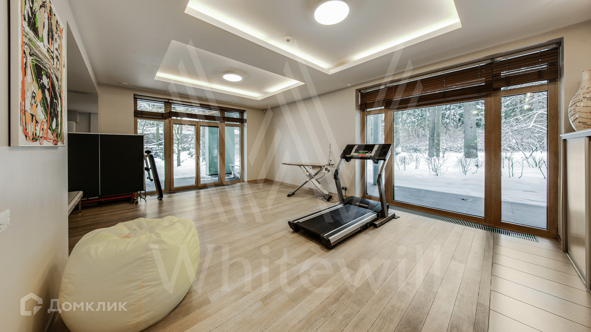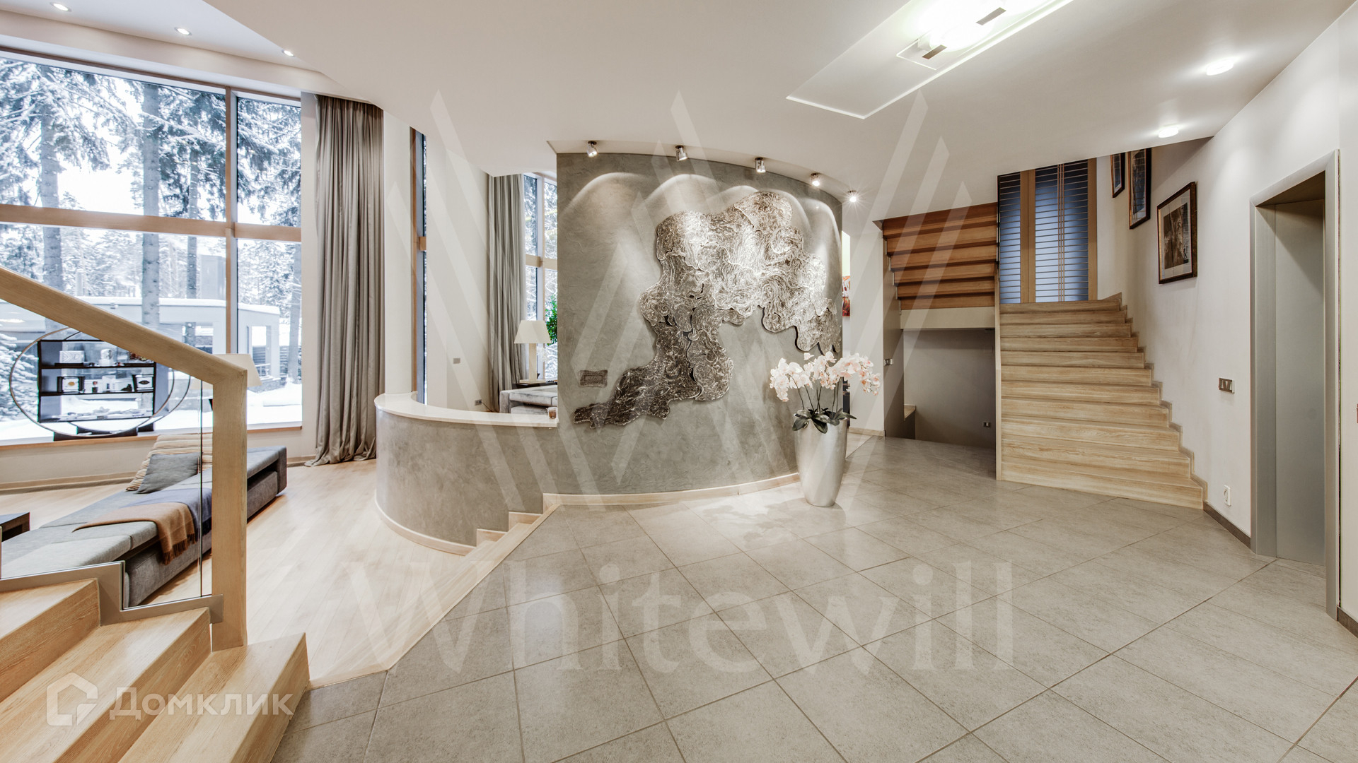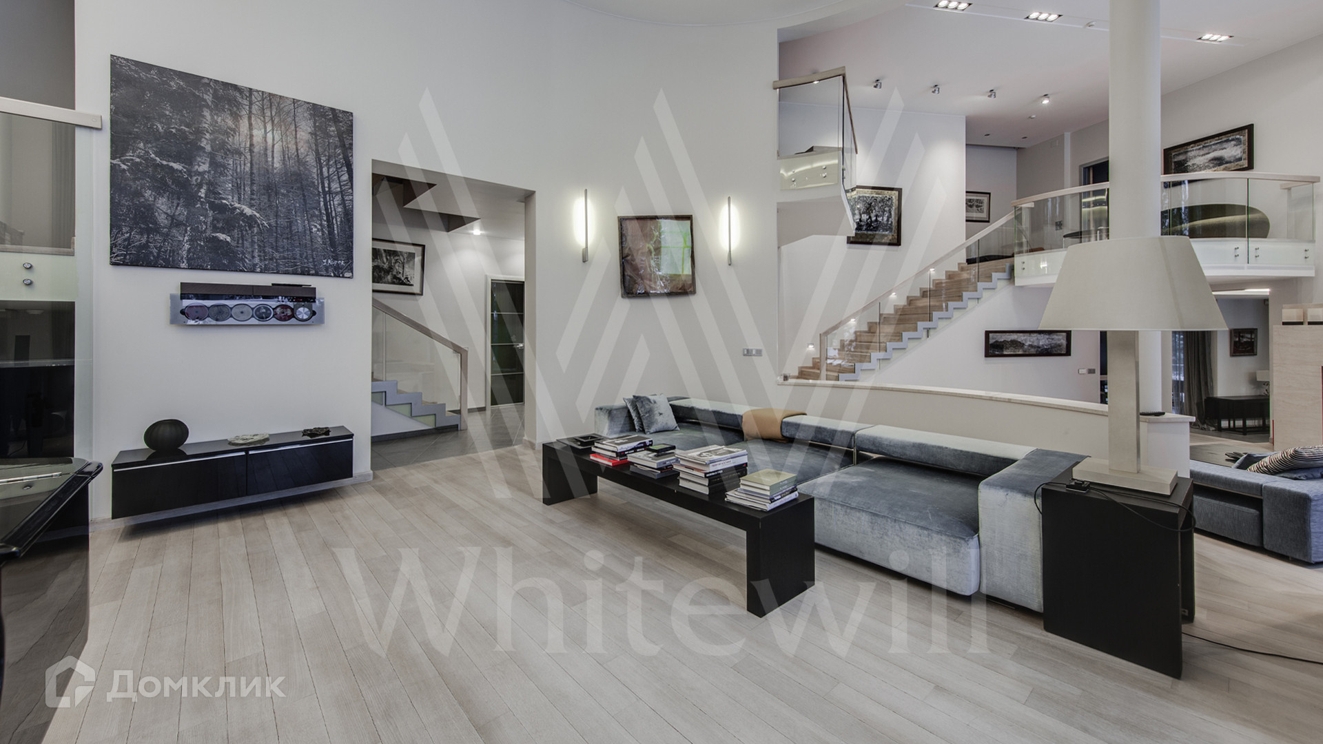 ID 11 695. Грибово. Большая загородная резиденция площадью 900 м² расположена на большом лесном участке 1,5 гектара. Внутри выполнена отделка в современном стиле в светлых тонах. На большом диване можно послушать рояль и полюбоваться просторной двухсветной гостиной с камином и угловым панорамным остеклением. Из окон открывается вид на ухоженный участок. В доме 5 спален с ванными и гардеробными комнатами, 2 кабинета, тренажёрный зал с сауной и хамамом.
