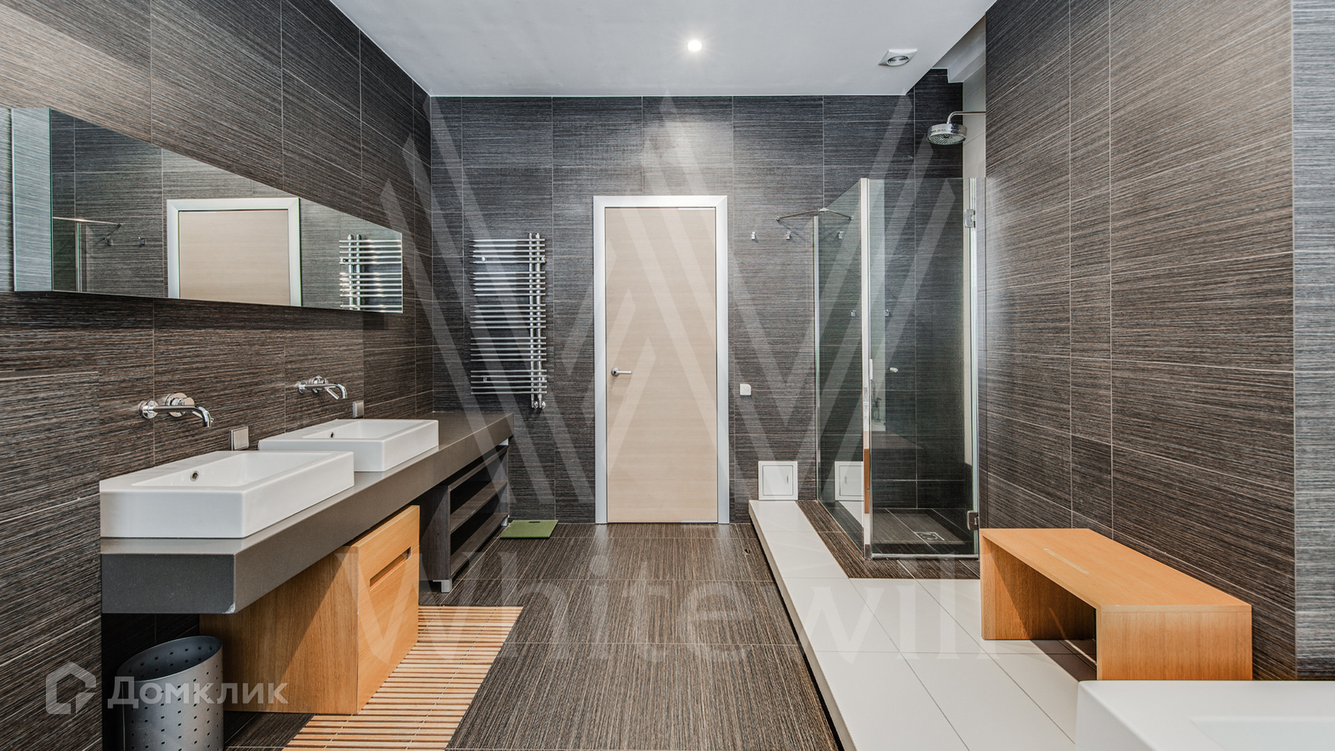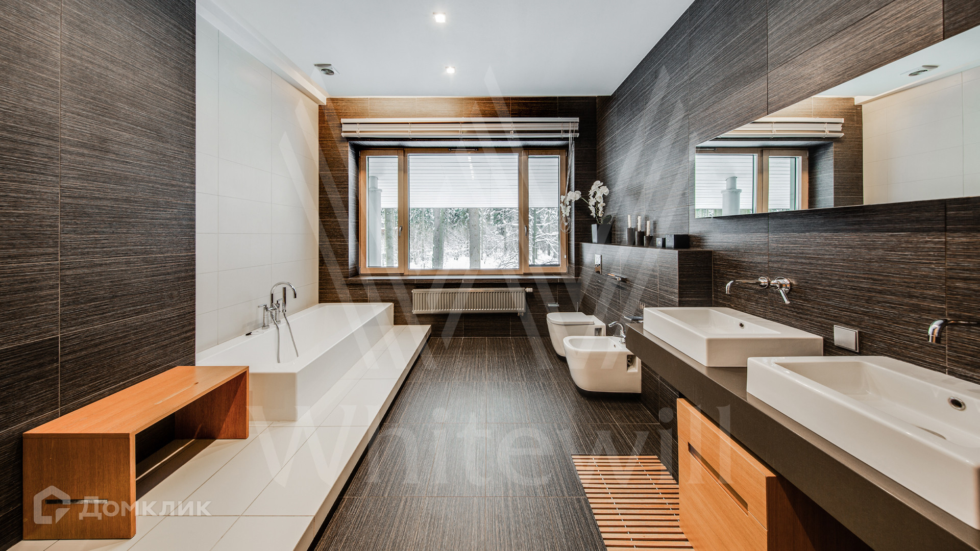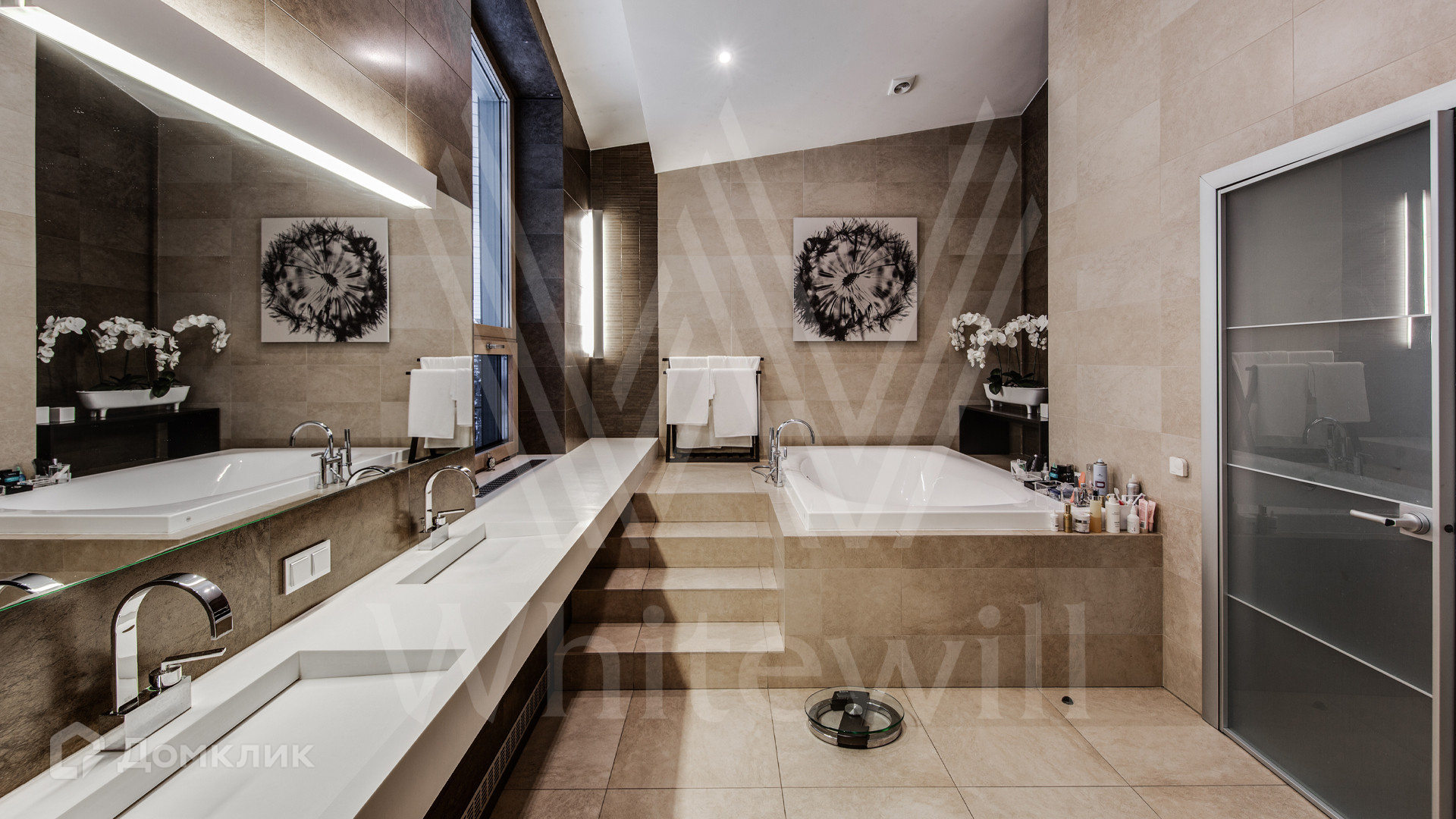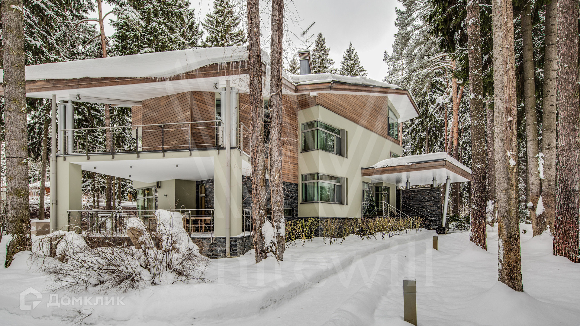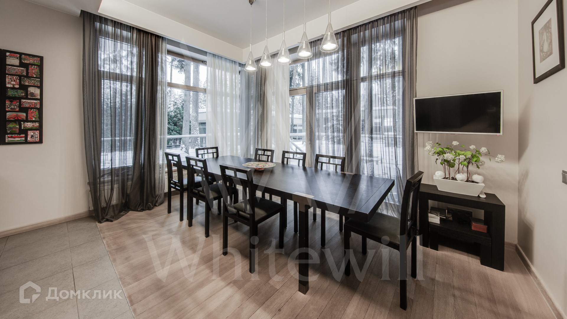 ID 11 695. Грибово. Большая загородная резиденция площадью 900 м² расположена на большом лесном участке 1,5 гектара. Внутри выполнена отделка в современном стиле в светлых тонах. На большом диване можно послушать рояль и полюбоваться просторной двухсветной гостиной с камином и угловым панорамным остеклением. Из окон открывается вид на ухоженный участок. В доме 5 спален с ванными и гардеробными комнатами, 2 кабинета, тренажёрный зал с сауной и хамамом.