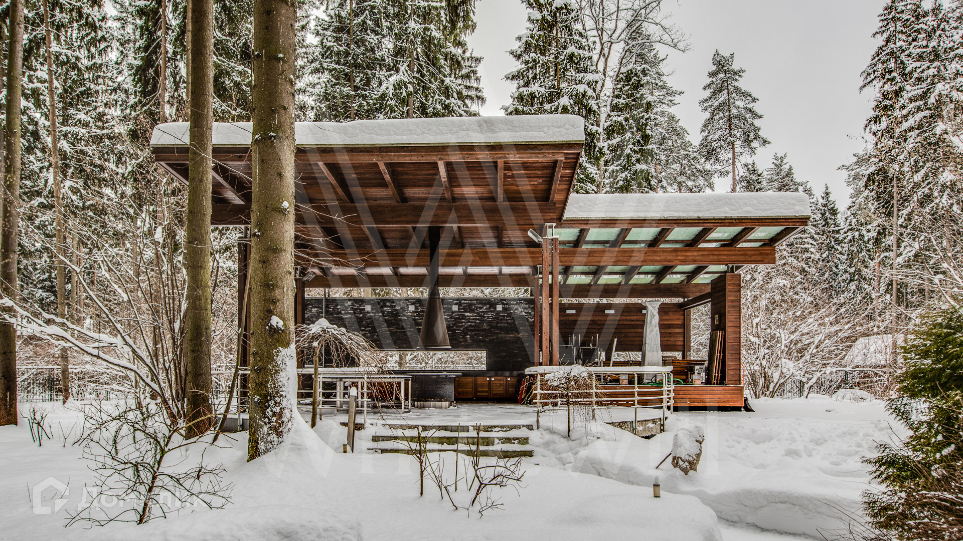 Участок с ландшафтным дизайном и высокими соснами расположен в приватной части поселка. На участке — SPA-комплекс с профессиональным бассейном и дом для персонала с гаражом на 2 машины.