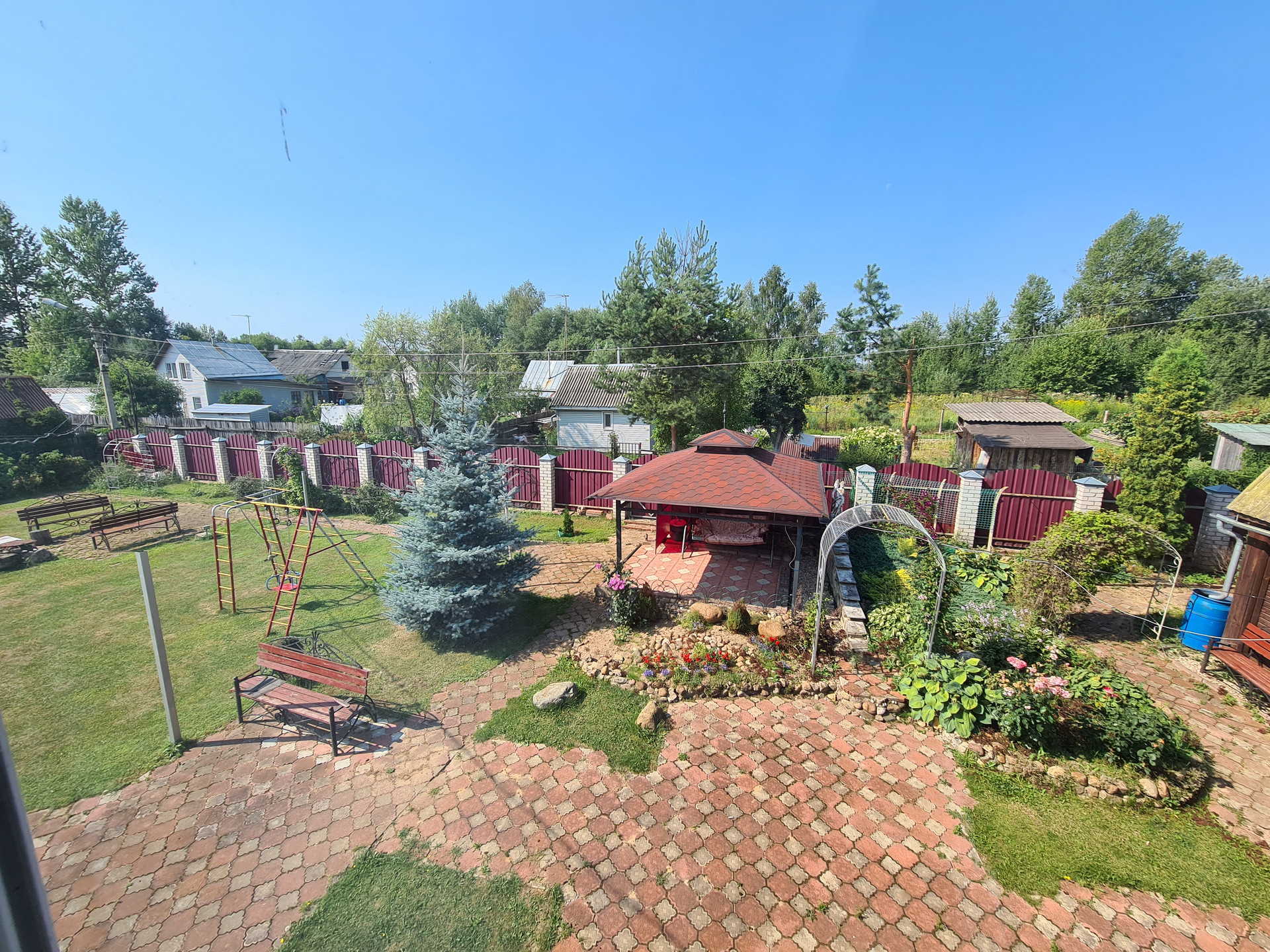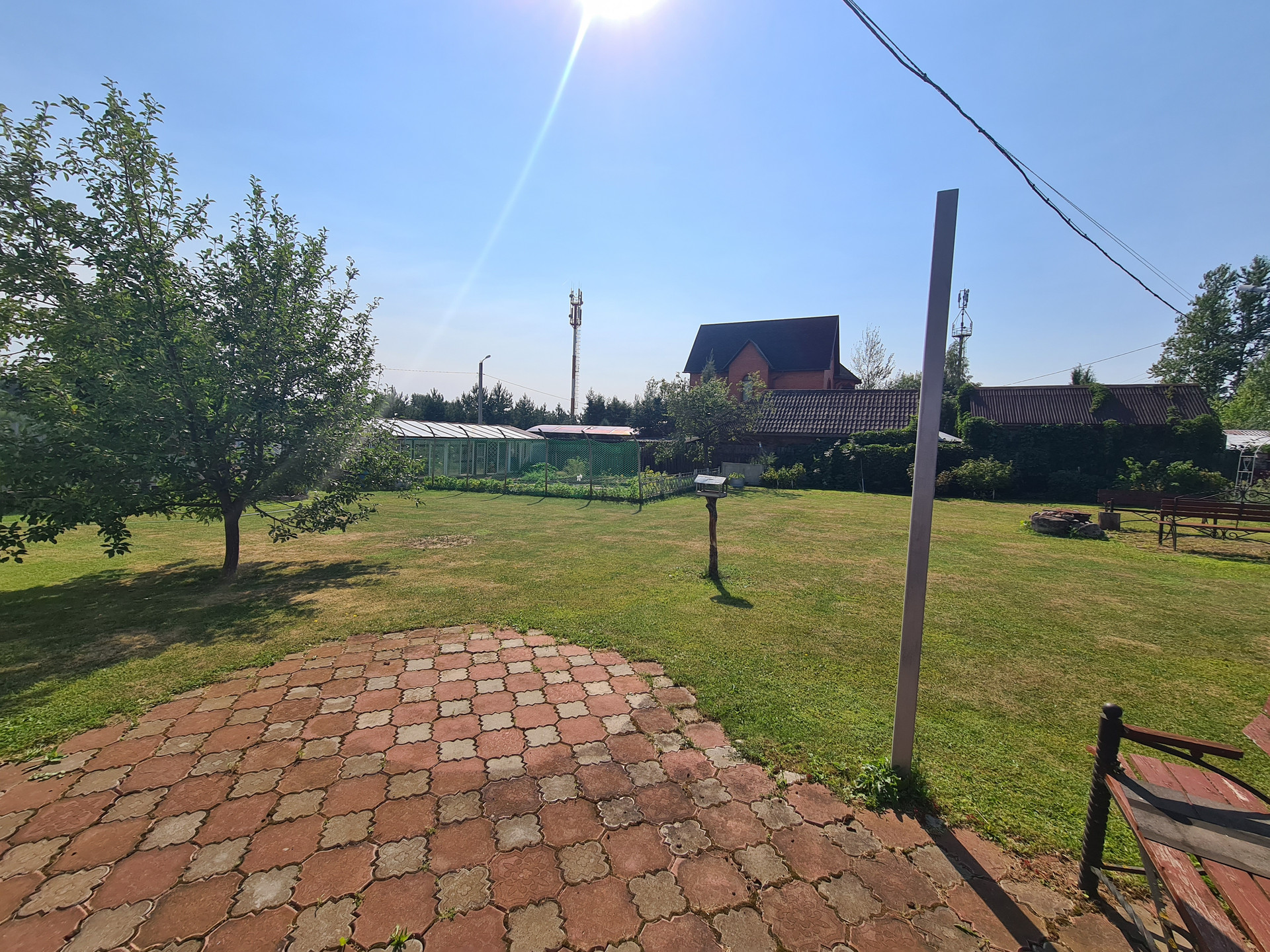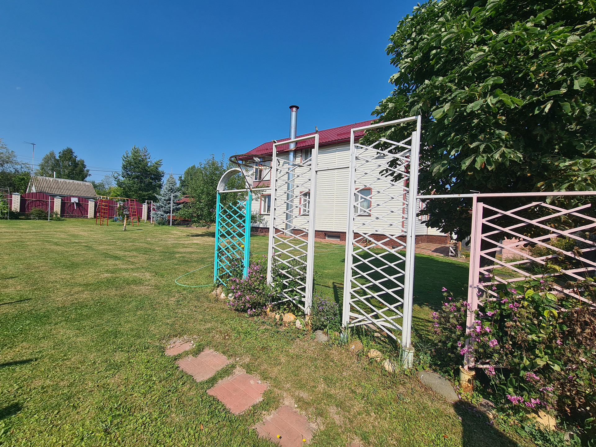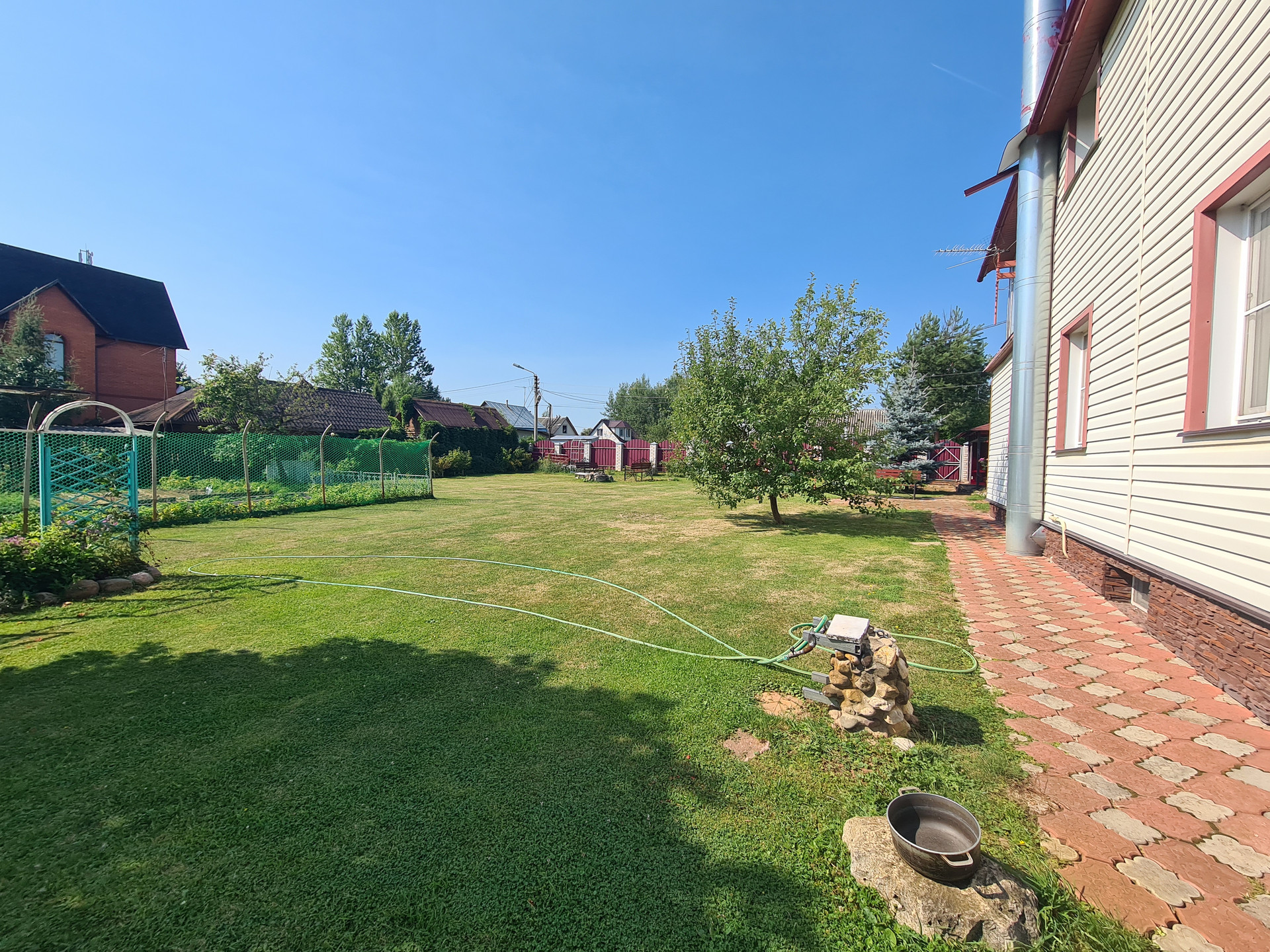 Участок ровный, сухой, ухоженный, огорожен хорошим забором ( кирпичные столбы и металлопрофиль), выложены дорожки из плитки, засеян газоном, много плодовых и ягодных деревьев и кустарников, имеется теплица с грядками.