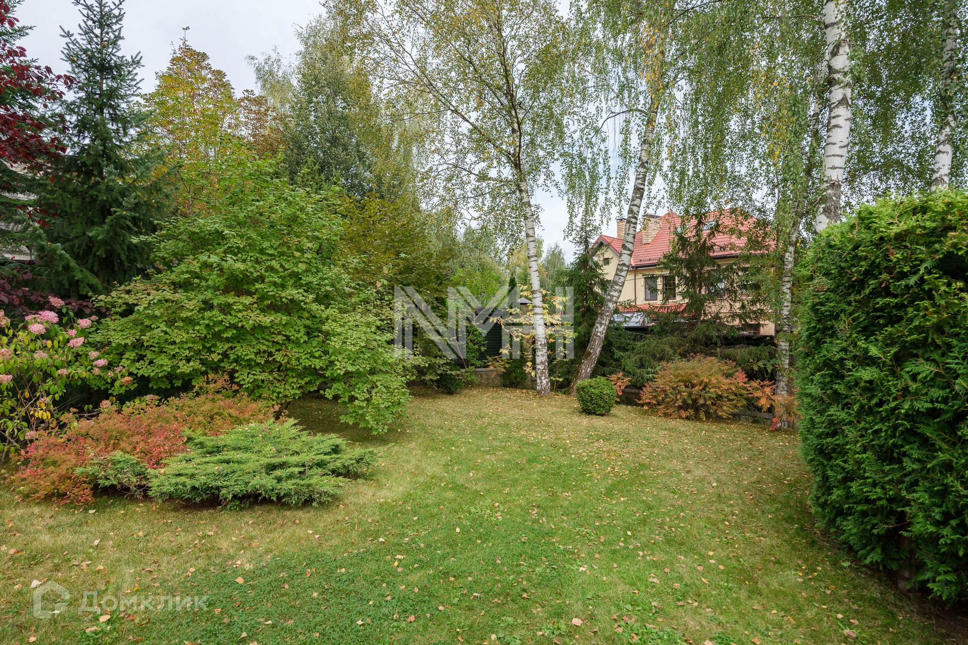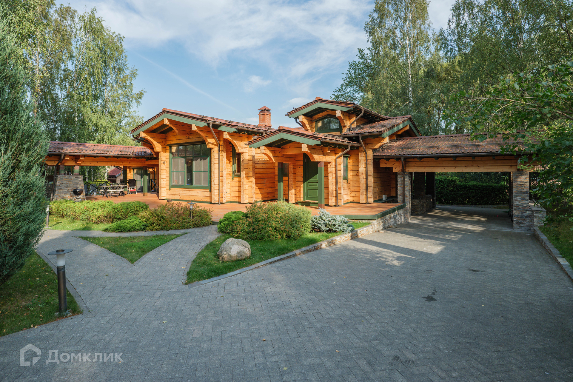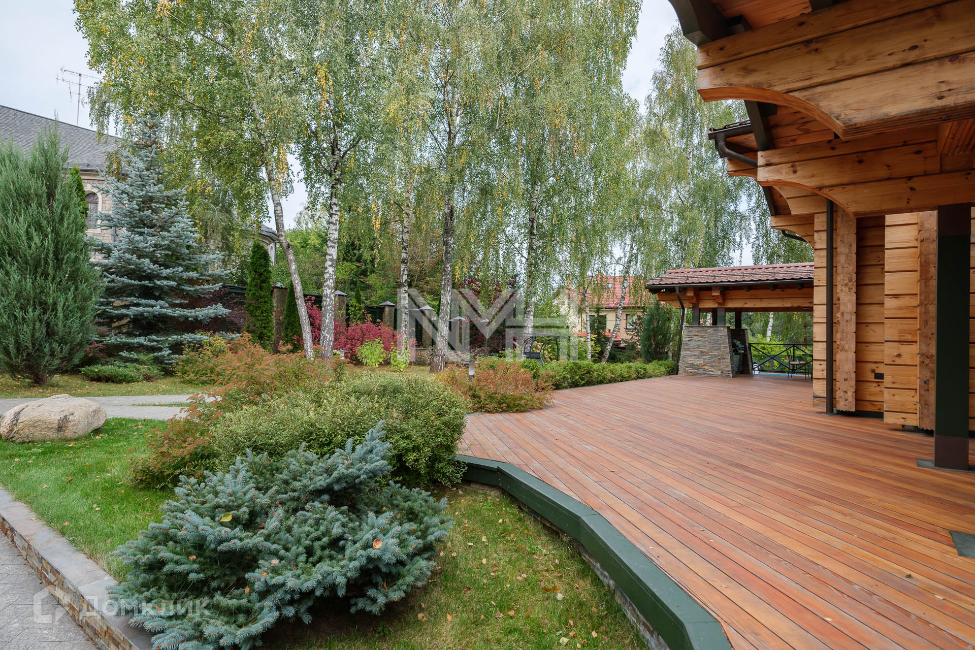 Участок 14 соток с ландшафтным дизайном. На участке лесные и декоративные деревья и кустарники; вымощены дорожки, установлено фонарное освещение. Вместительная парковка и 2 машиноместа под навесом.