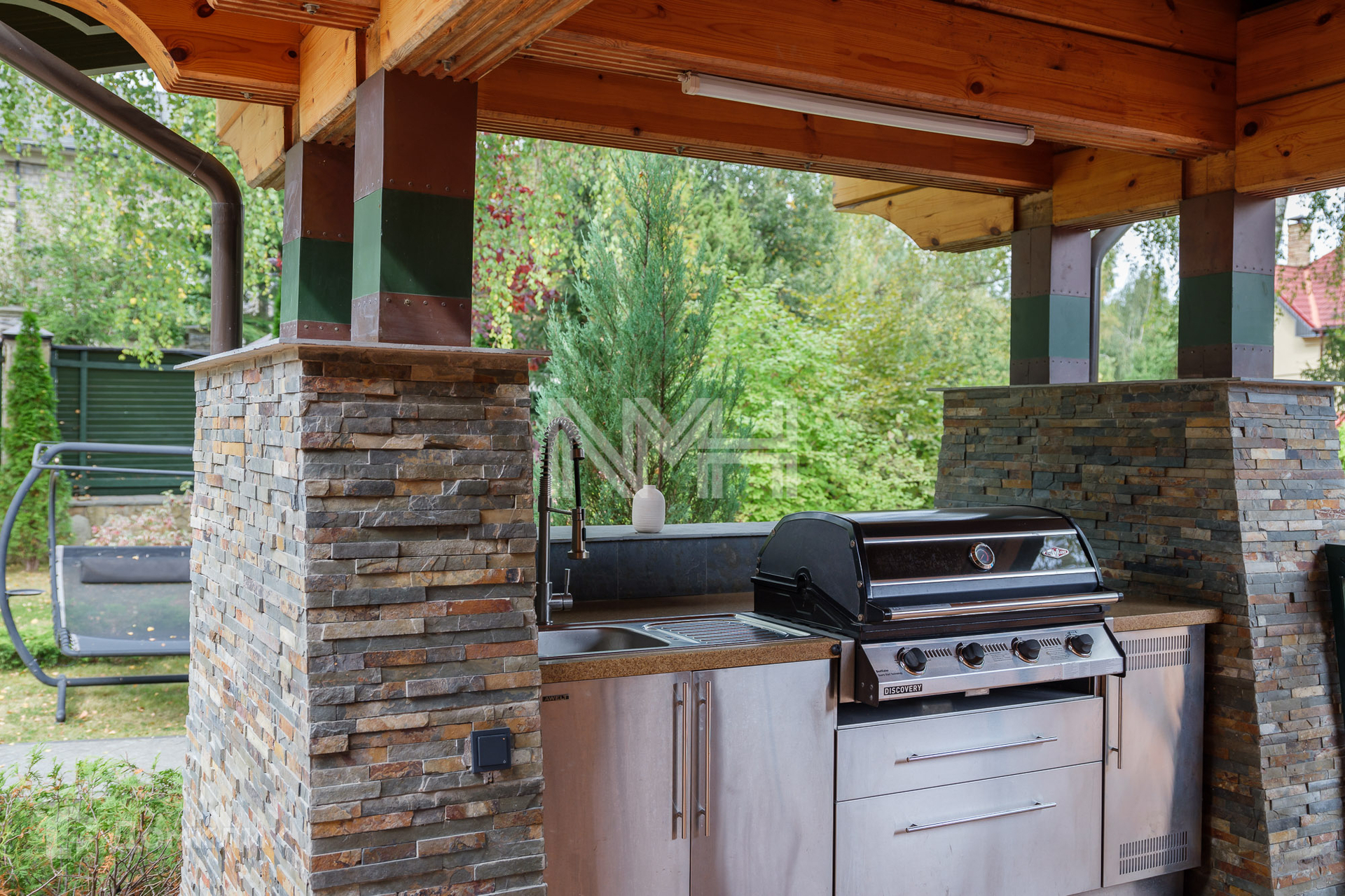 К дому примыкает деревянная терраса со встроенным бассейном, под навесом обустроена кухня с мойкой и зоной барбекю.