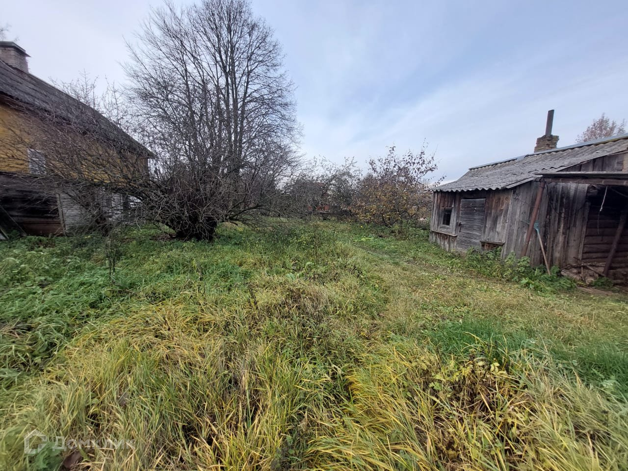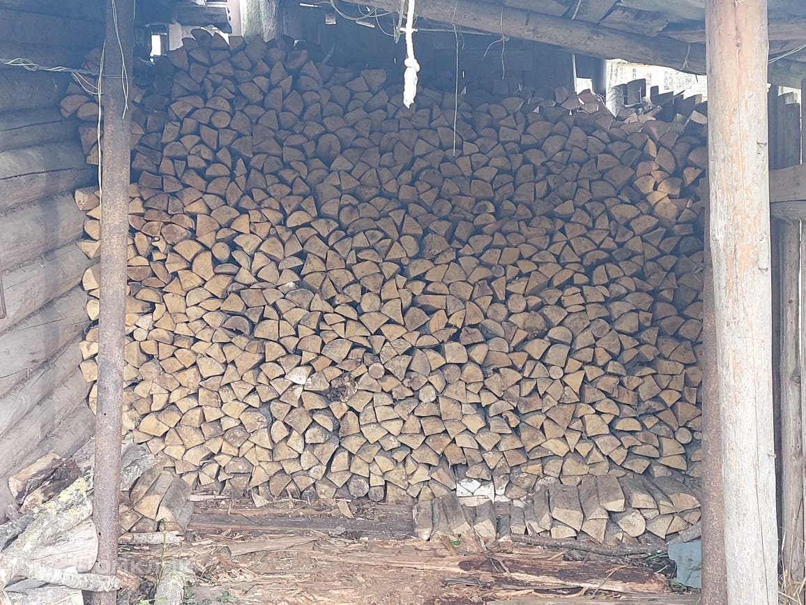 На участке построена банька из бревна с дровенником.