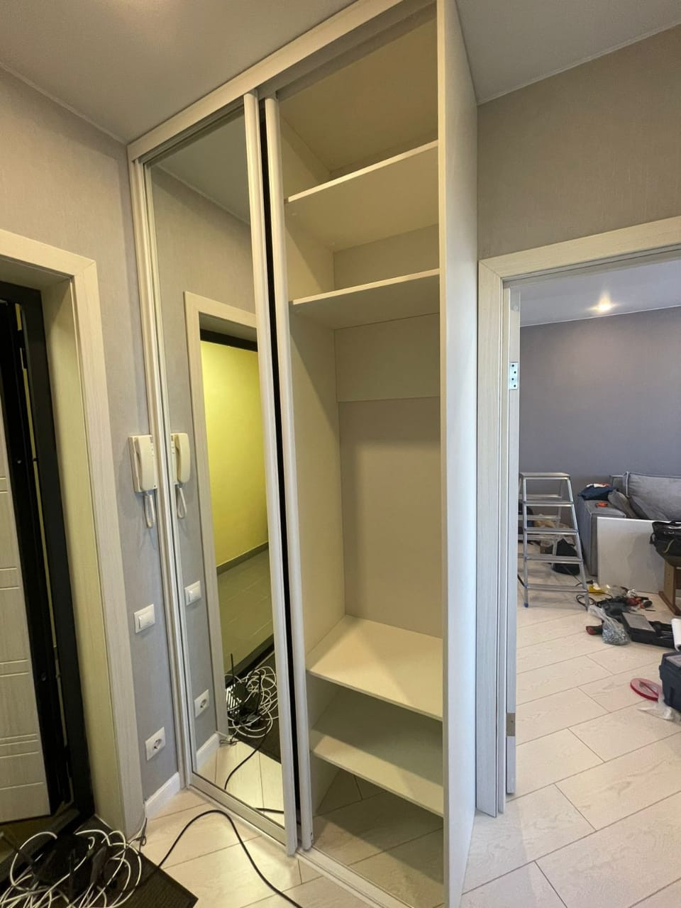 Остается дорогая встроенная кухня с техникой: варочная панель, духовой шкаф, вытяжка, посудомоечная машина, стол со стульями, шкафы купе в комнате и прихожей