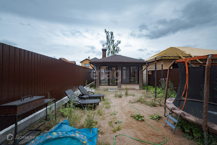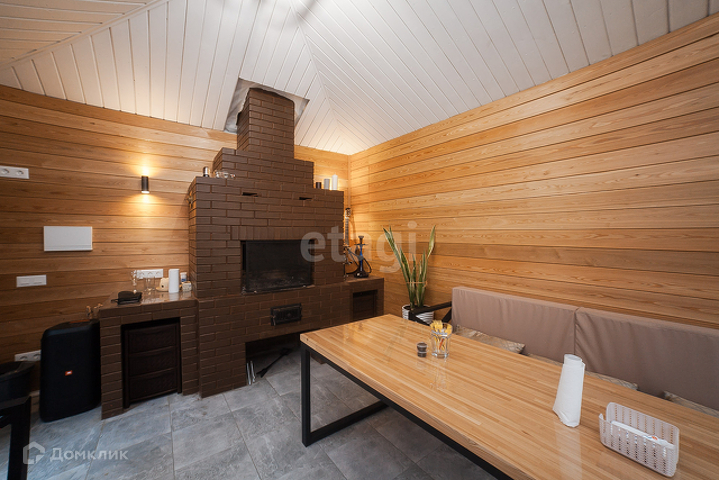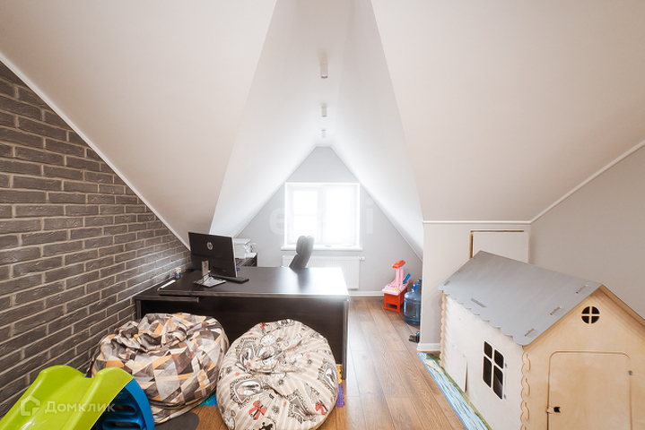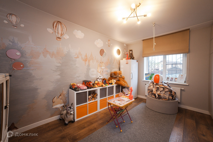 На первом этаже расположена прихожая, гардеробная, детская игровая, кухня-гостиная, санузел. С гостиной есть выход во двор, где располагается крытая зона барбекю.