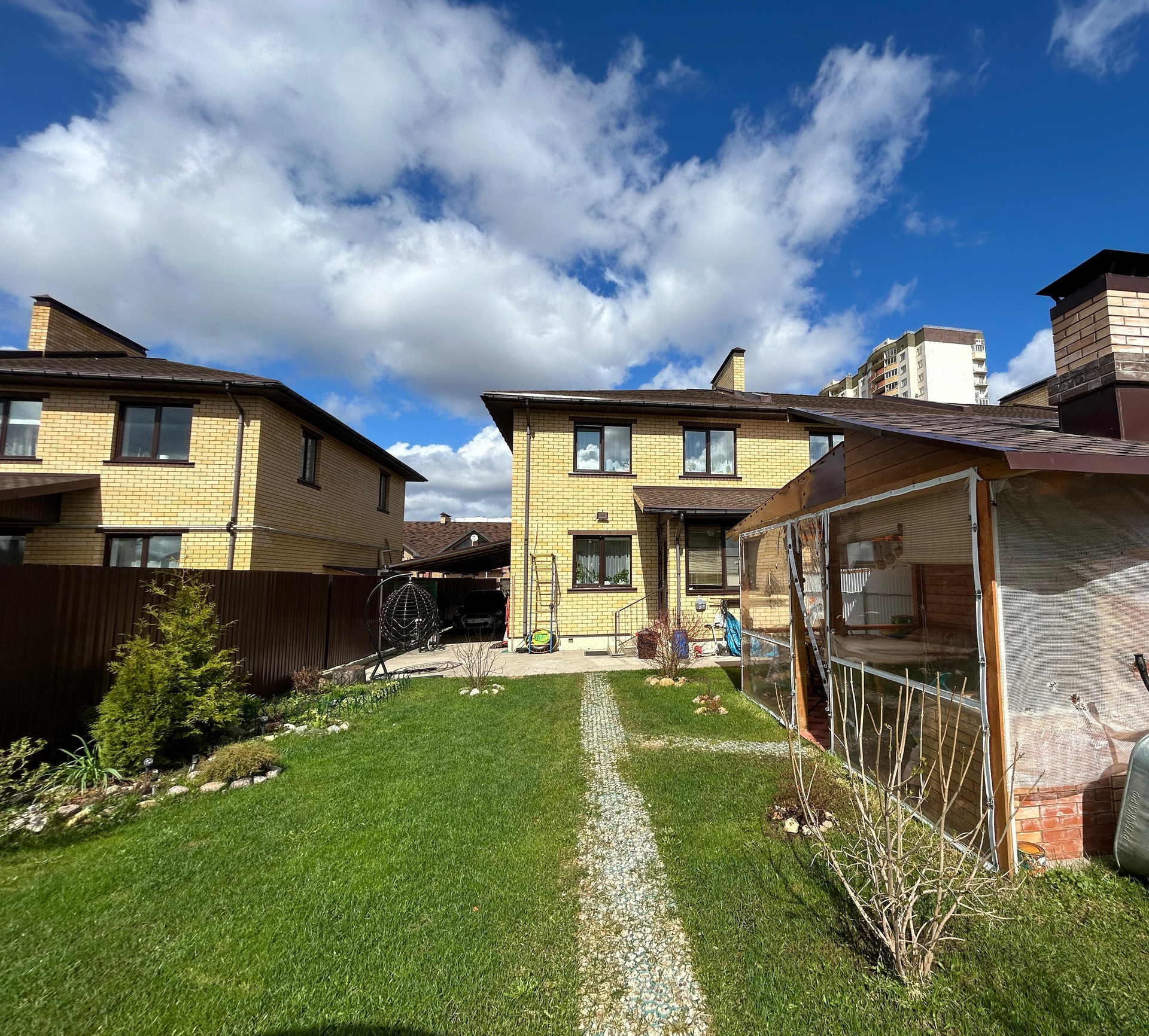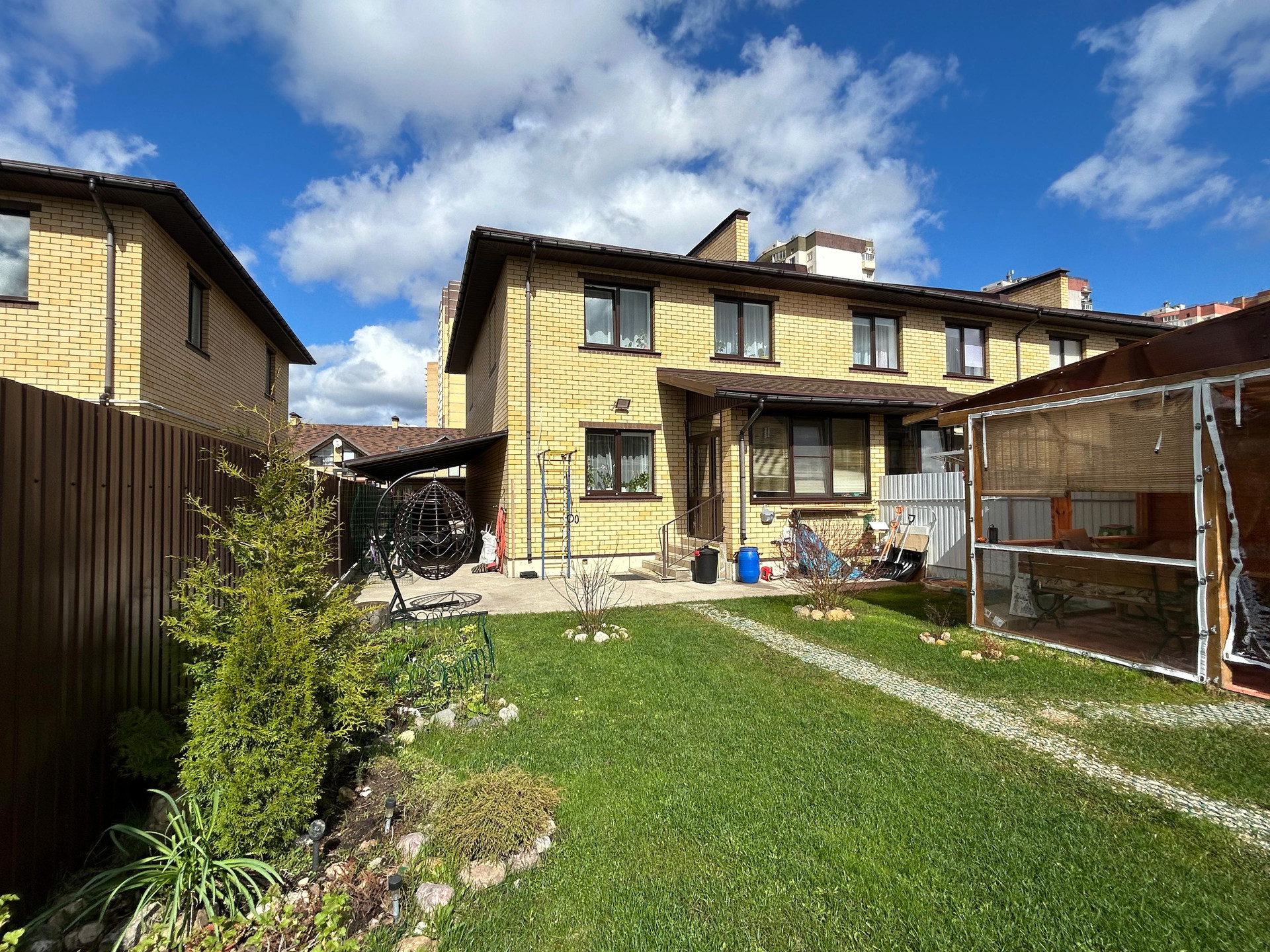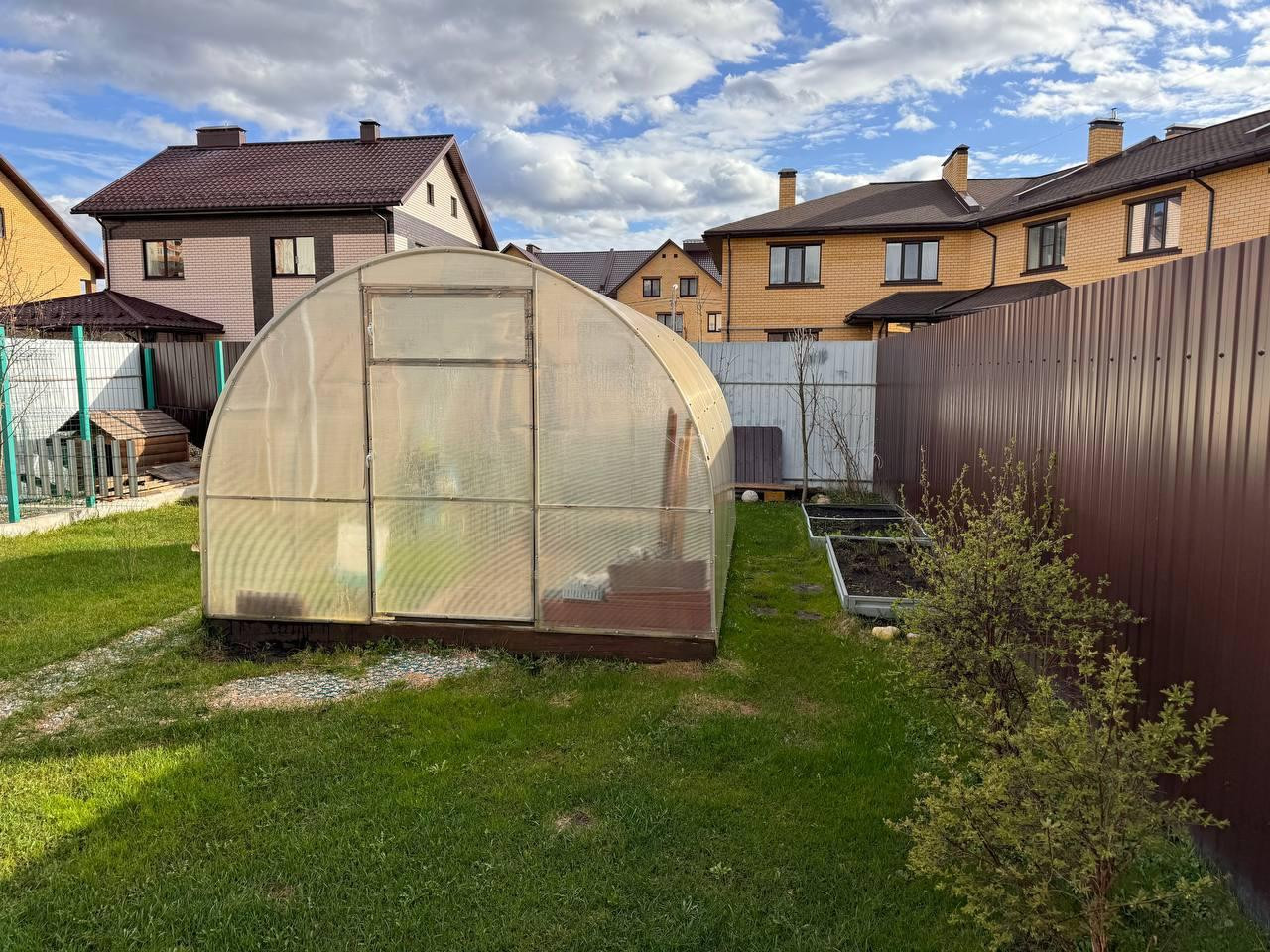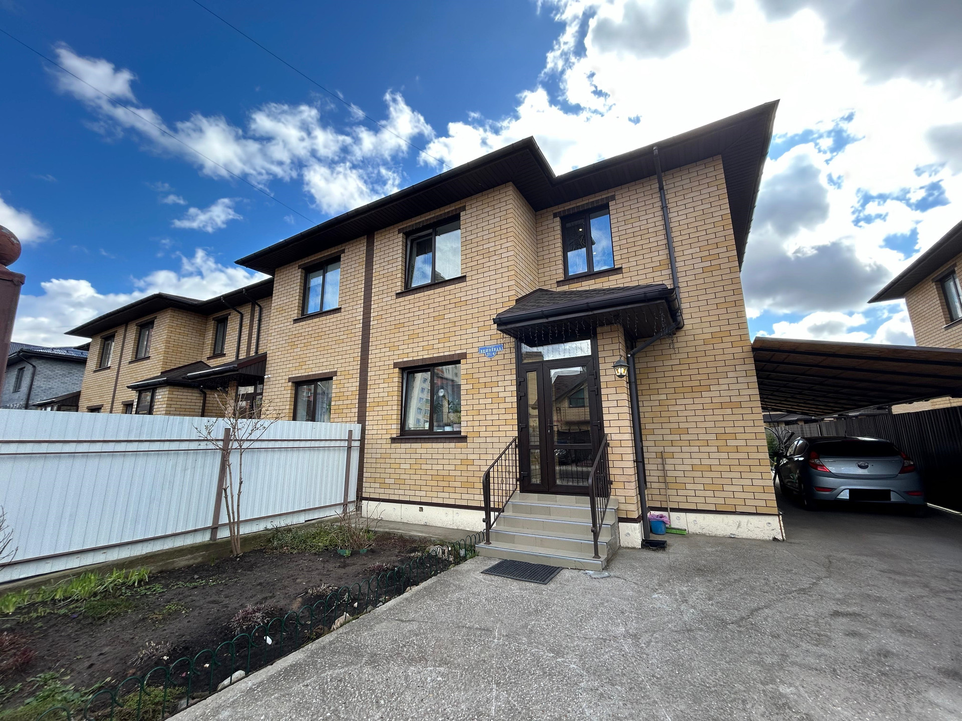 Площадь таунхауса: 134,5 кв.м.. Площадь участка 4,11 соток, огорожен по периметру. Высокий, отсыпанный. На участке плодовые кустарники. Парник. Навес для 2 автомобилей.