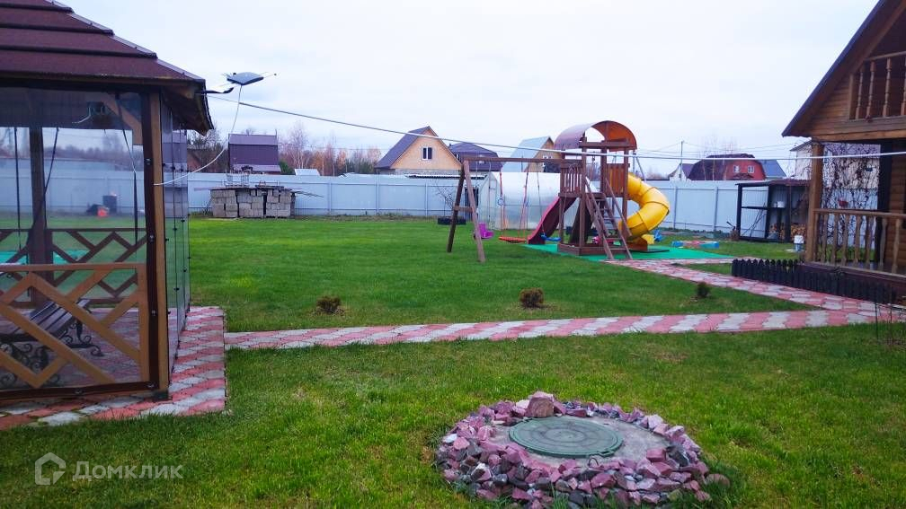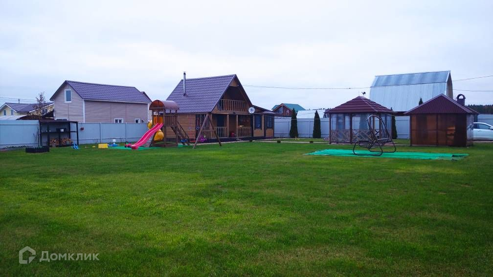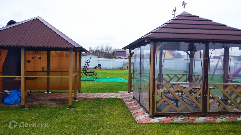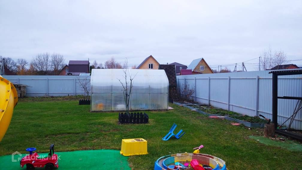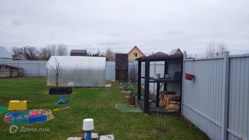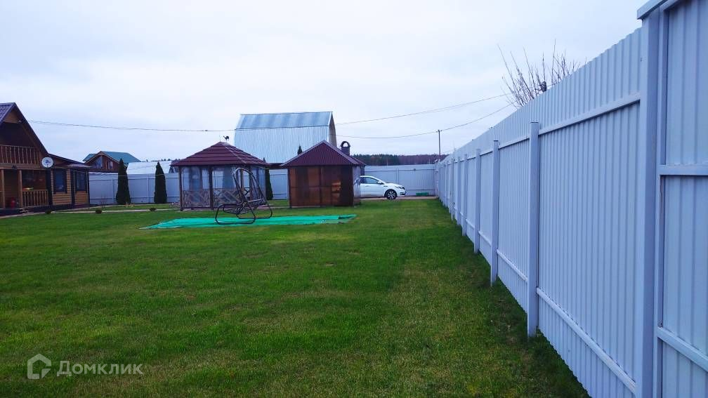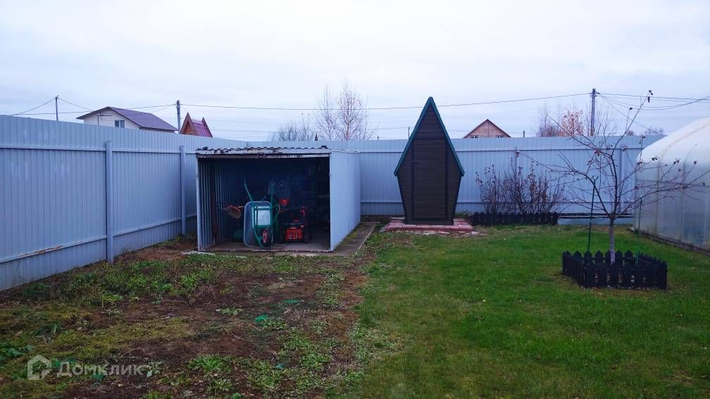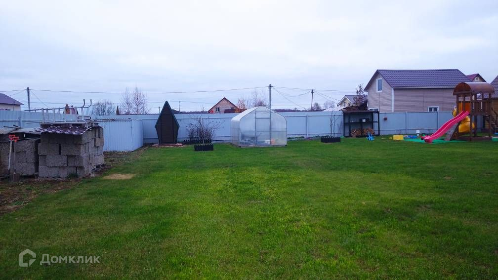 Участок засеян газонной травой, огорожен металлическим забором, есть парковка на две машины, беседка, мангальная зона, детская игровая площадка, теплица, гараж-ракушка, также есть блоки для строительства капитального гаража.