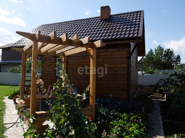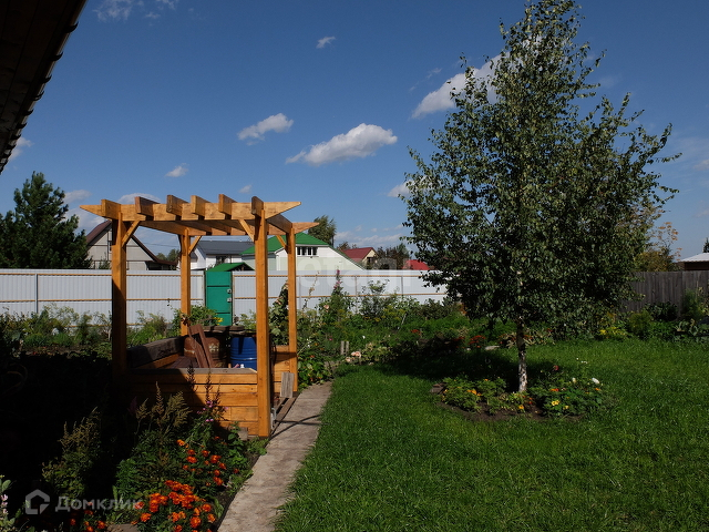 Территория облагорожена: клумбы с цветами, насаждения. Есть зона мангала, дровяник для бани. Большая часть территории просто для отдыха.