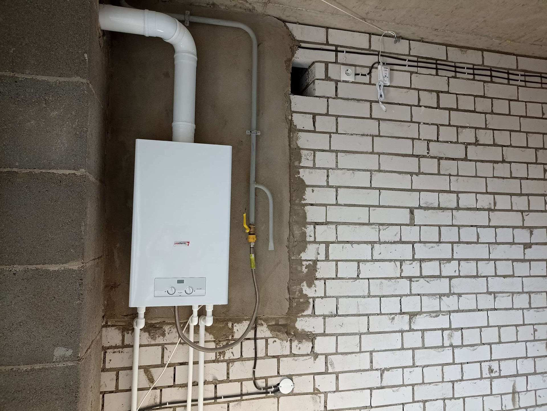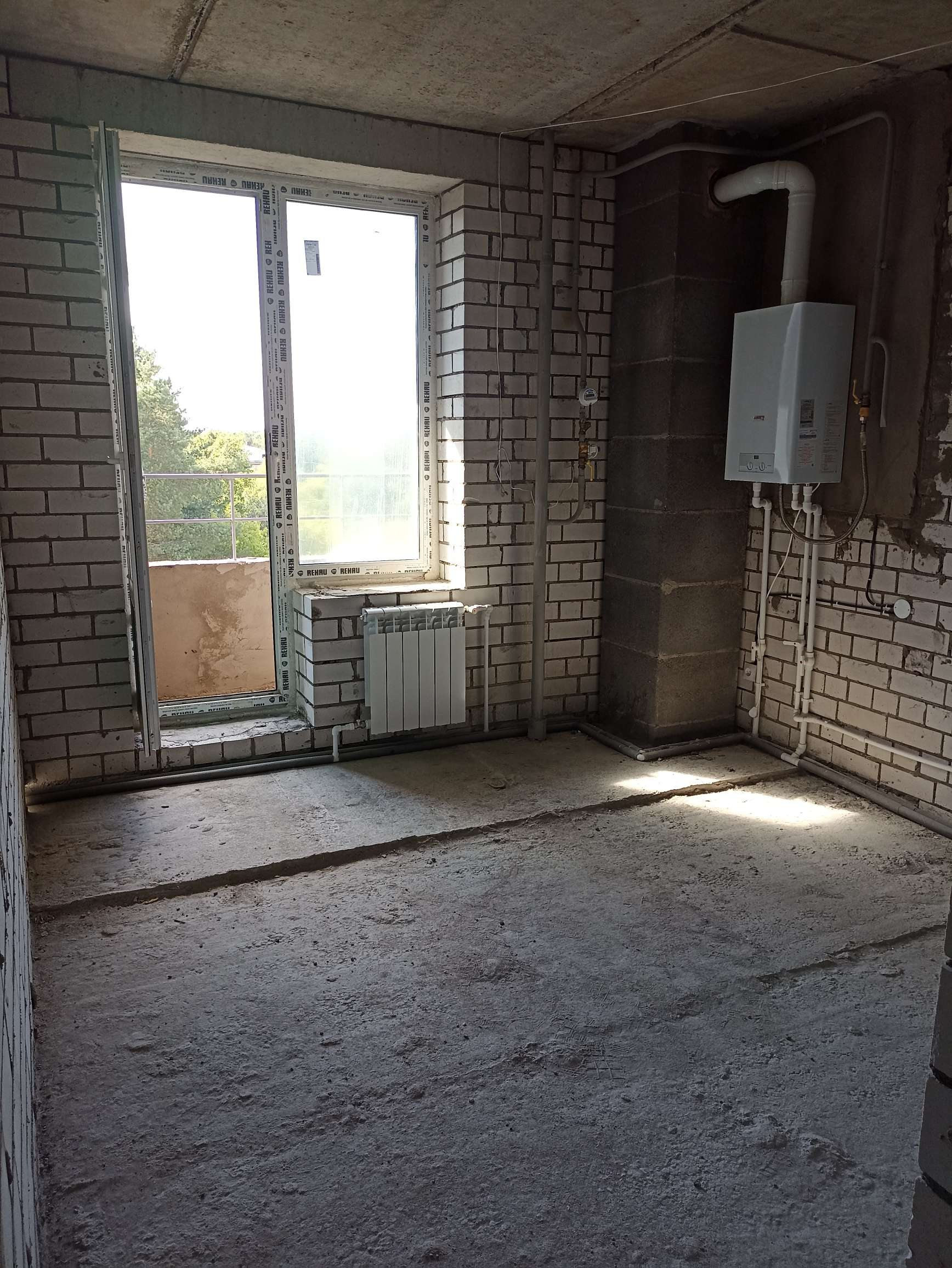 Не угловая, газовый котел. В комнате выполнена штукатурка стен. Извините,фото летние