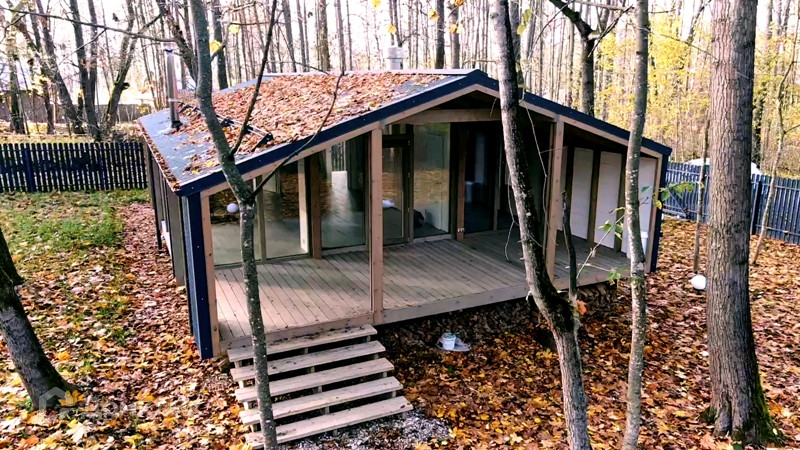 Арт. 34369455 Новый модульный дом от компании DUBLDOM с ремонтом "под ключ" и с пятилетней гарантией, на участке газон с уличной подсветкой.