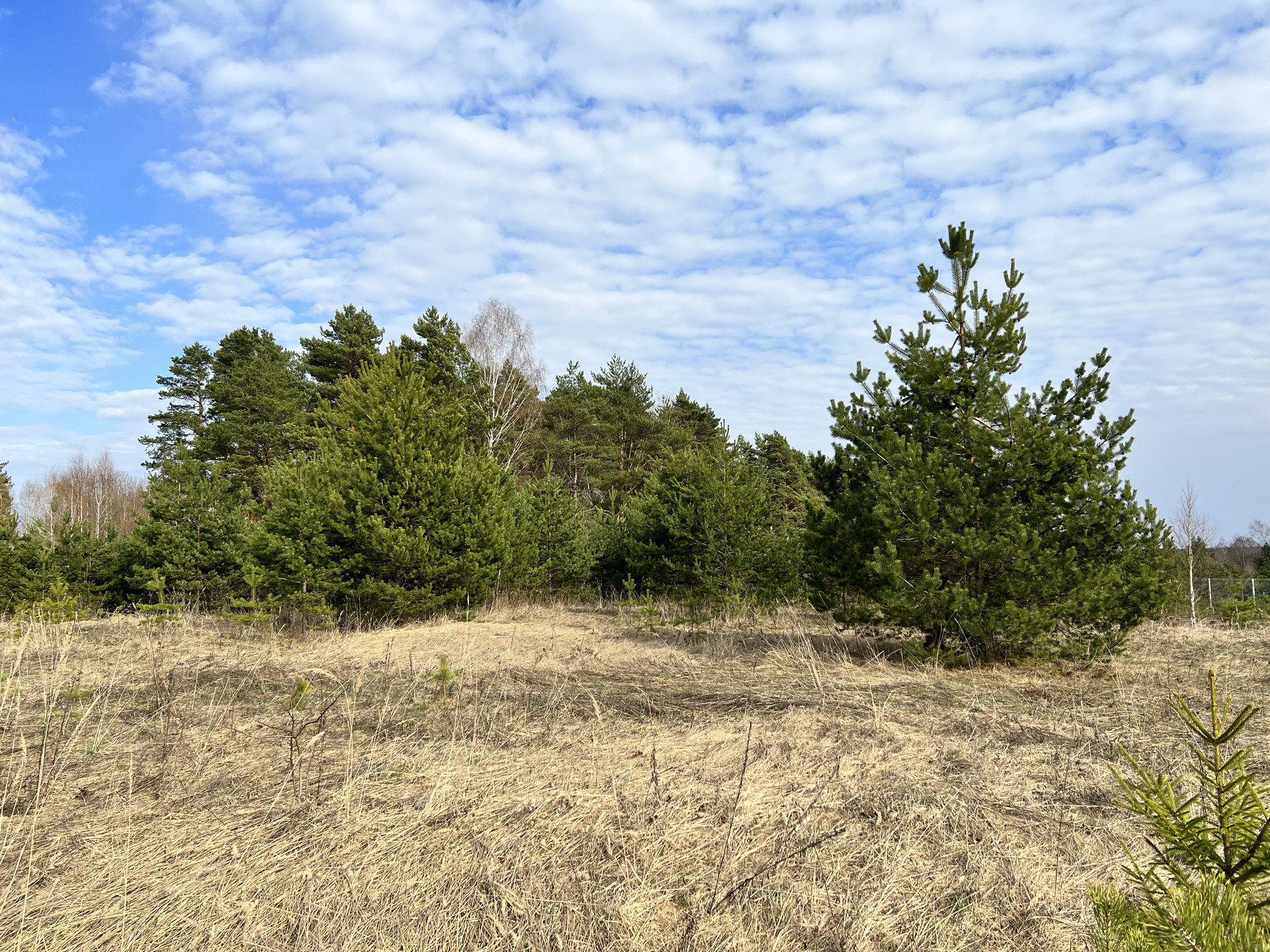 На участке растут очень красивые хвойные деревья (ели и сосны).