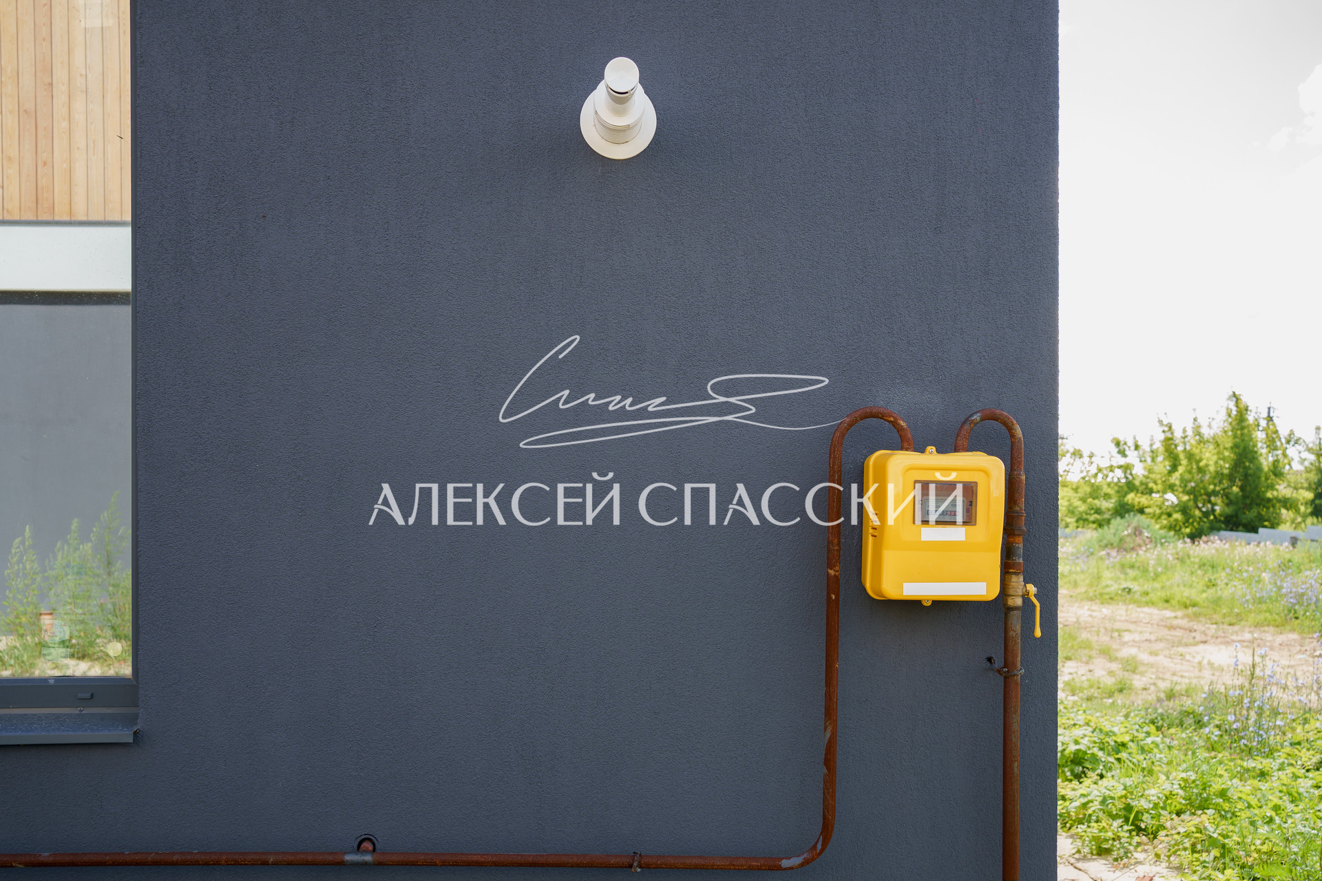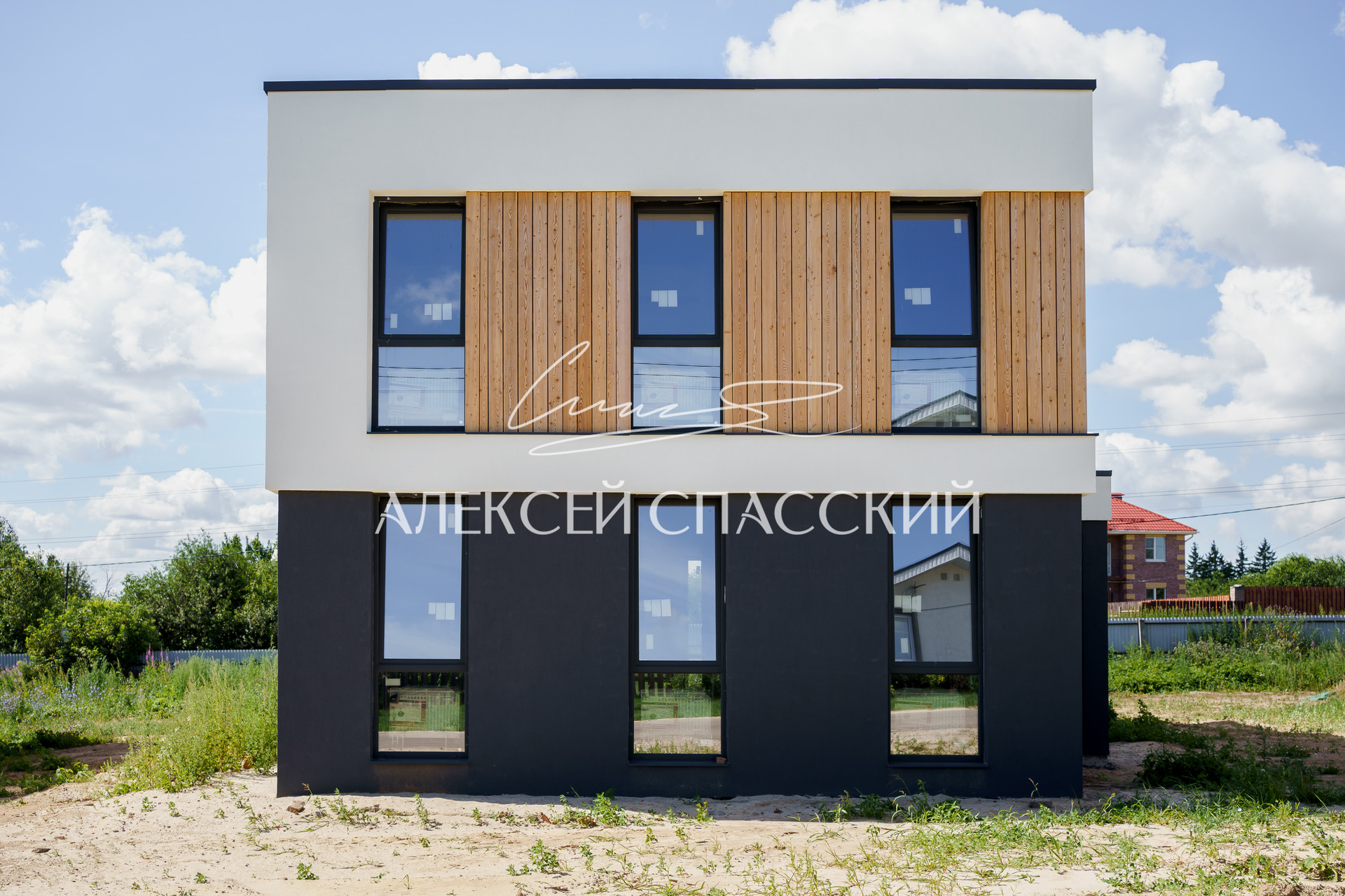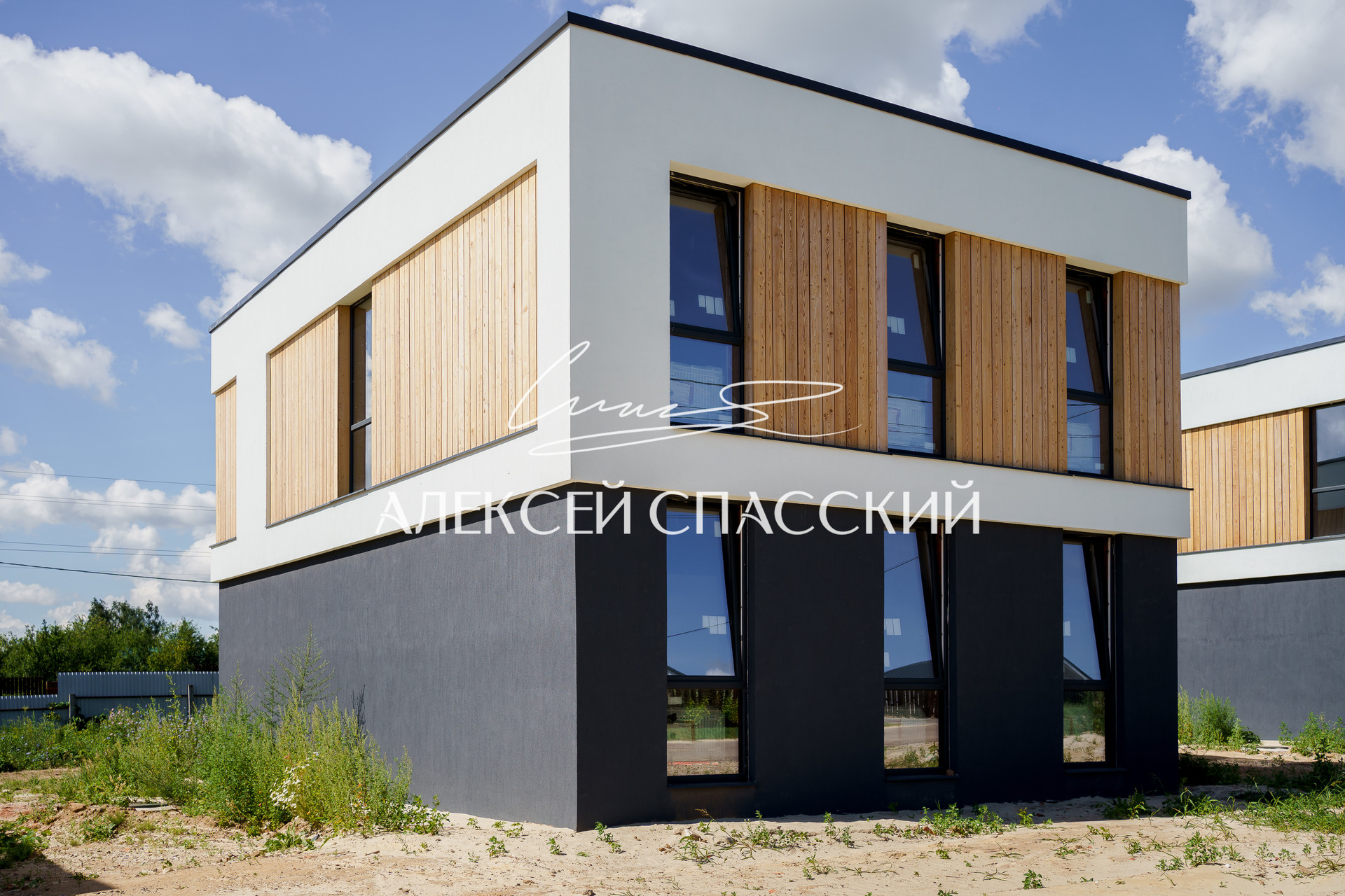 Фасад, комбинированный из силиконовой штукатурки quiсk-miх, колерованной в массе и планкена из лиственницы сорта А, отшлифованного и покрашенного в условиях столярного производства.