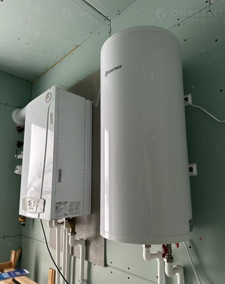 В котельной для горячей воды установлен бойлер на 50 л и газовый котёл. Газ заведён в дом, осталось только врезаться и подключиться, материалы для этого уже все проложены.