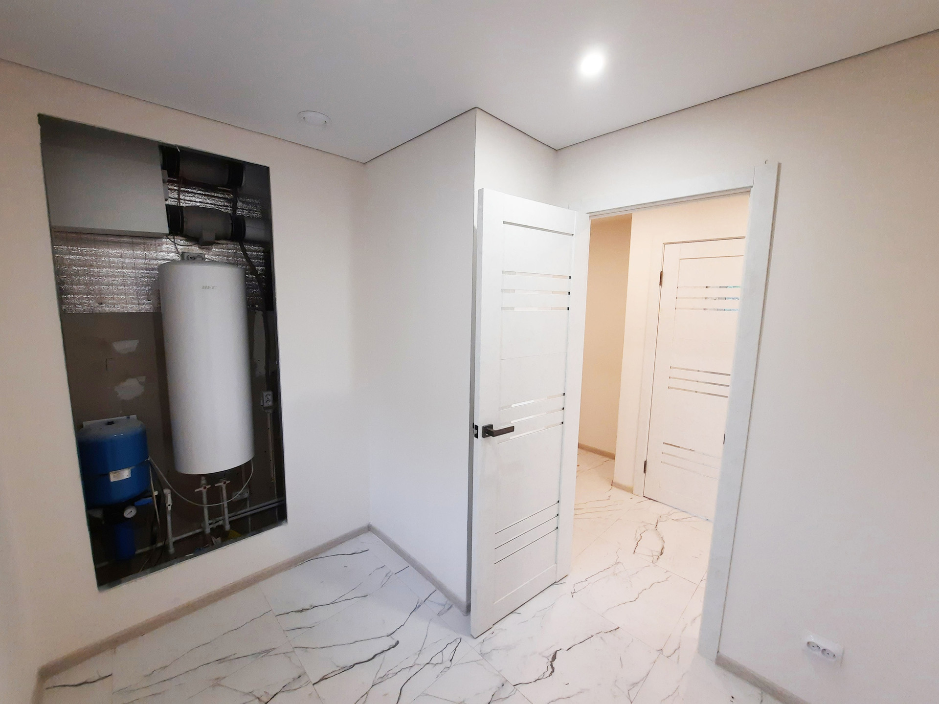 Белые стены, ламинат 33 класса, керамогранит в санузлах, добротные межкомнатные двери, натяжные потолки.
