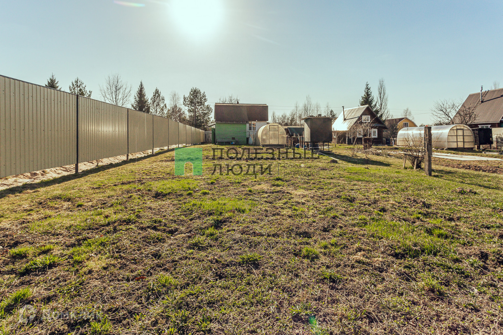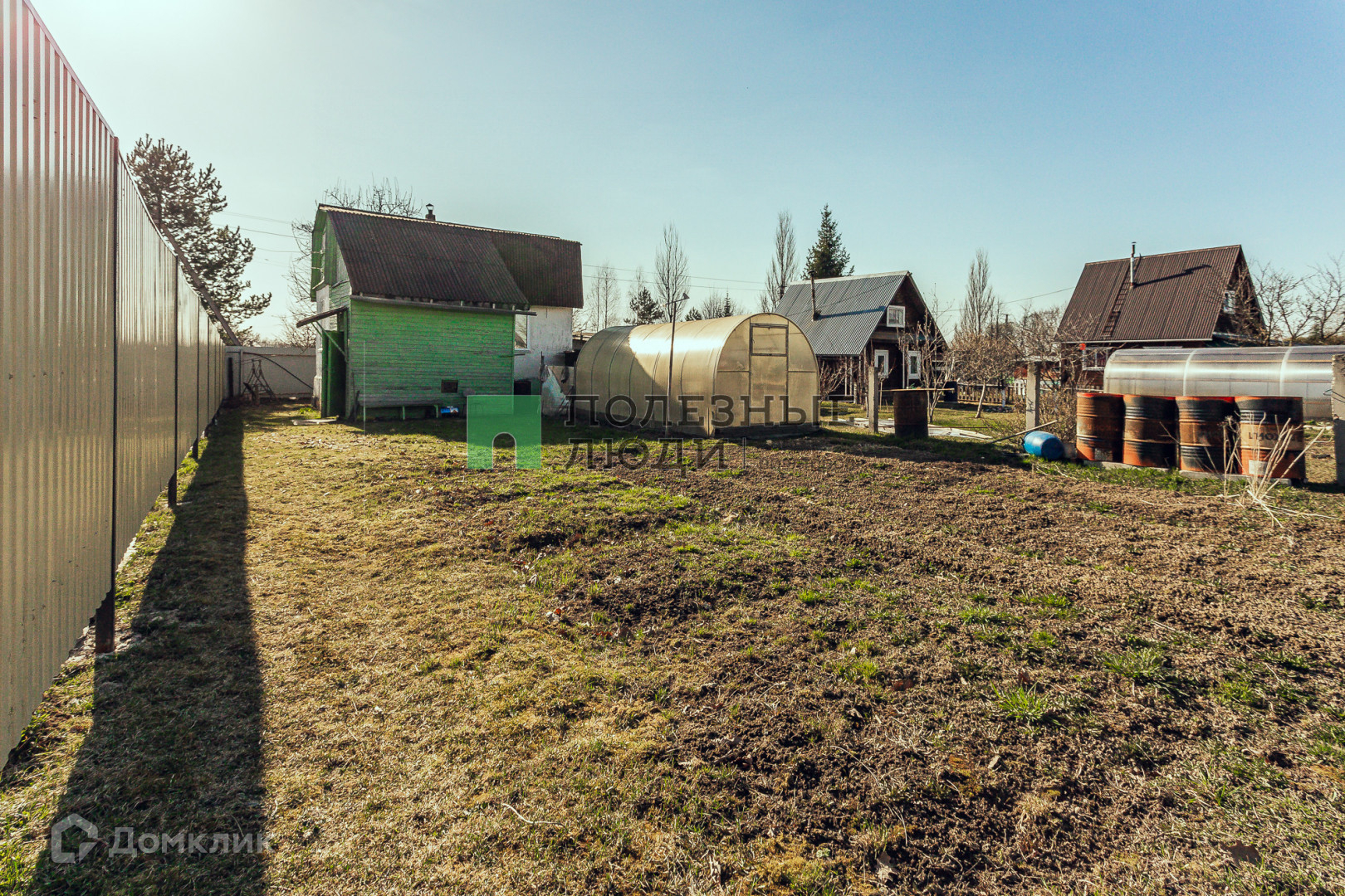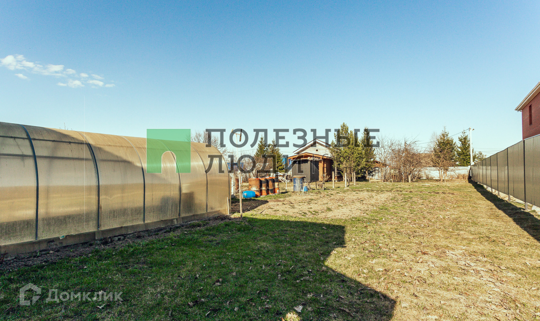 На участке: теплица, колодец, баня, различные плодово-ягодные растения.