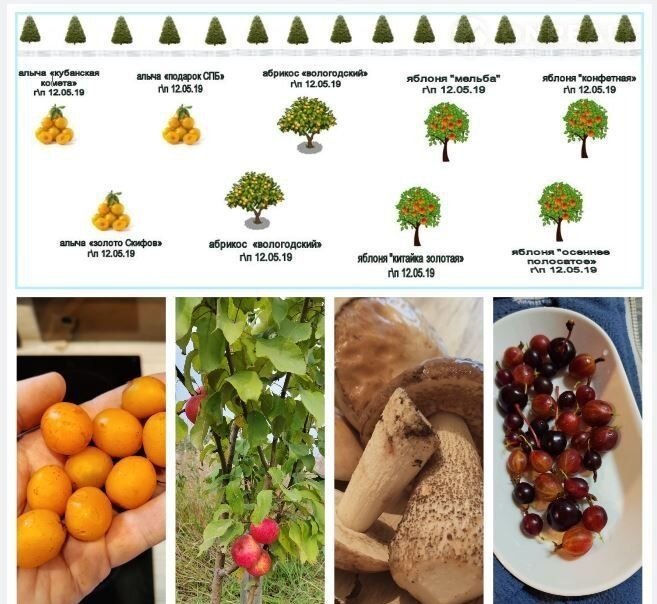 На территории посажены взрослые, плодоносящие деревья: абрикос Вологодский - 2 шт, алыча - 2 шт, яблоня - 4 шт, груша - 4 шт, вишня - 2 шт, черешня - 2 шт.