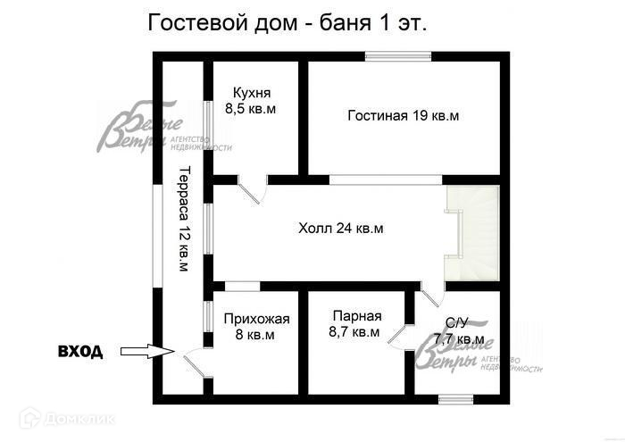 1-ый этаж: терраса-крыльцо 12 кв.м, прихожая 8 кв.м, холл 24 кв.м, гостиная 19 кв.м, кухня 8.5 кв.м, санузел-котельная 7.7 кв.м (с душевой кабиной).