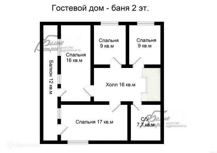 2-ой этаж: холл 16 кв.м, спальня 17 кв.м с выходом на балкон 12 кв.м, спальня 16 кв.м с выходом на балкон, спальня 9 кв.м, спальня 9 кв.м, санузел 7.7 кв.м (с душевой кабиной).