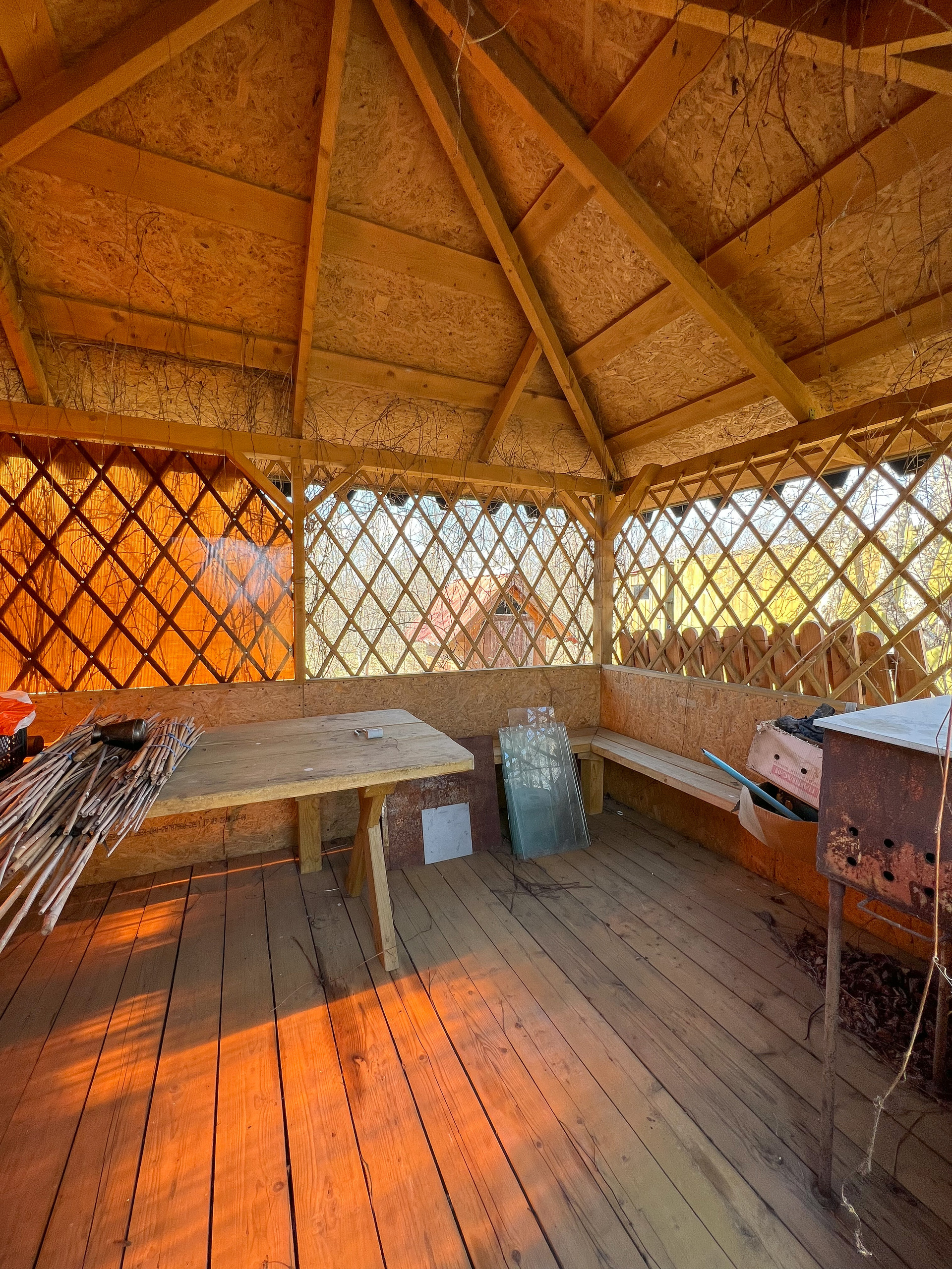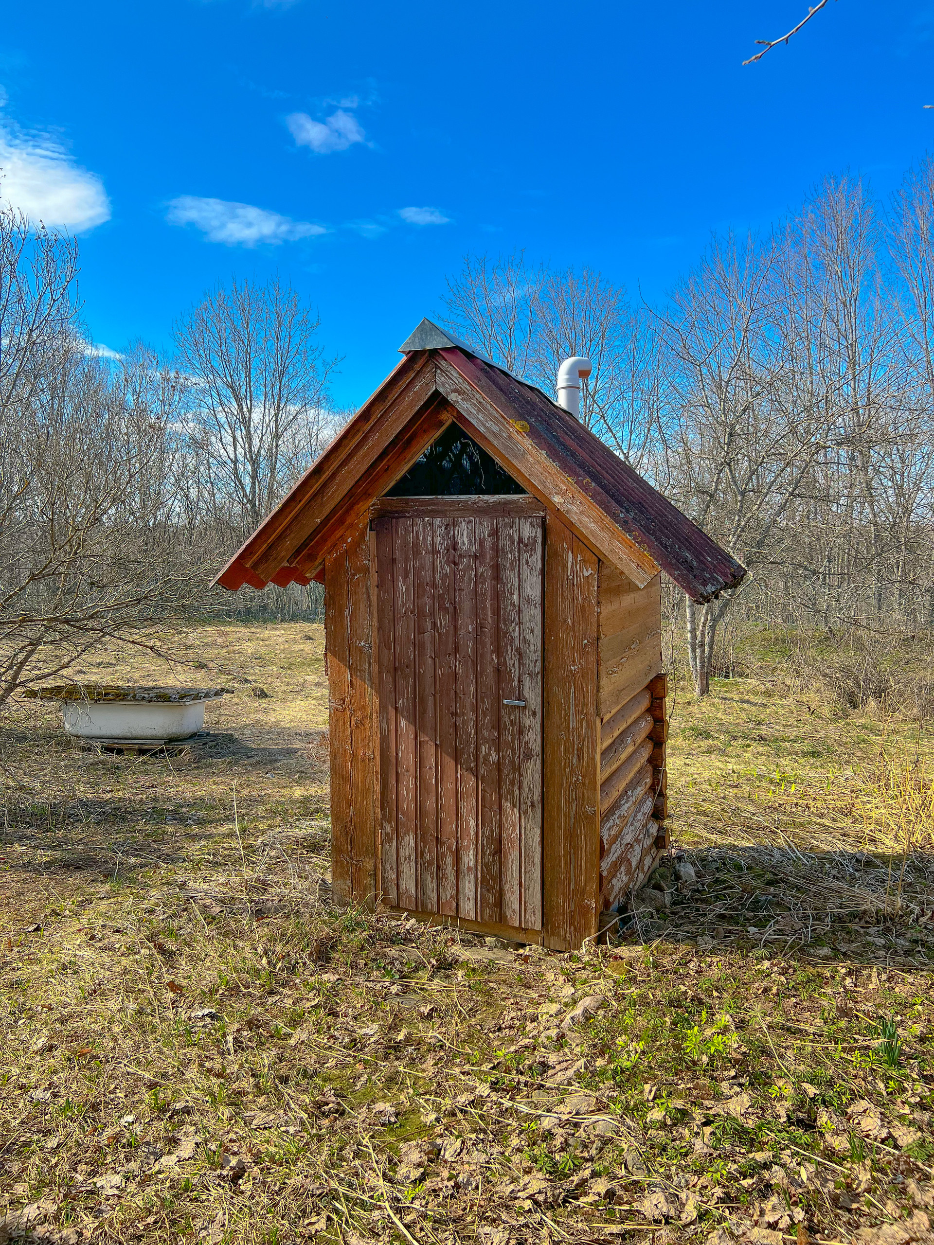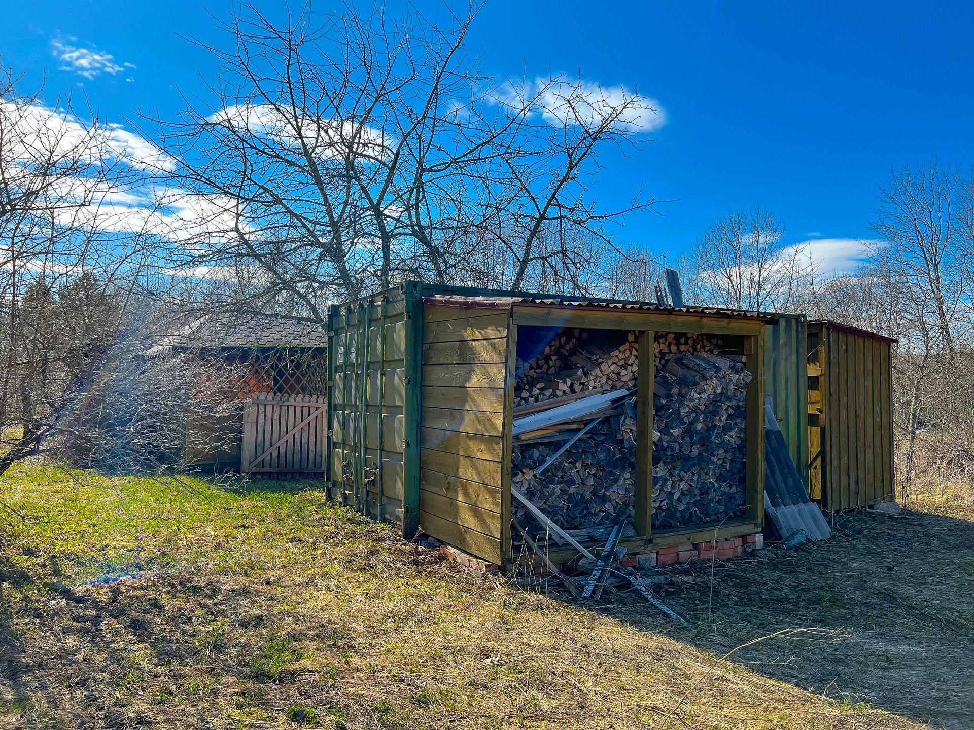На участке имеется беседка, хозяйственный блок (контейнер), дровник и уличный туалет.