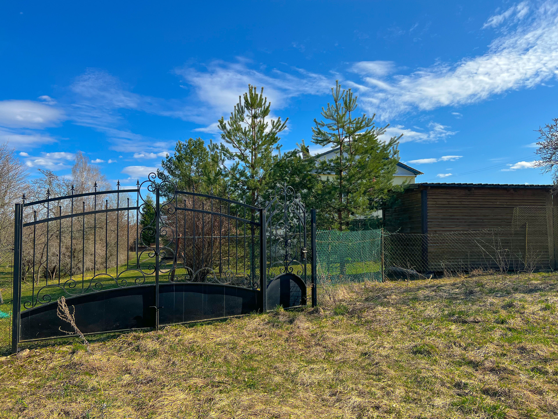 Земельный участок со всех сторон огорожен забором (сетка рабица), имеется кованые, распашные ворота для заезда авто. Участок ровный и сухой, прямоугольной формы. Есть посадки плодовых деревьев и кустарников, а также шикарные, высокие туи.