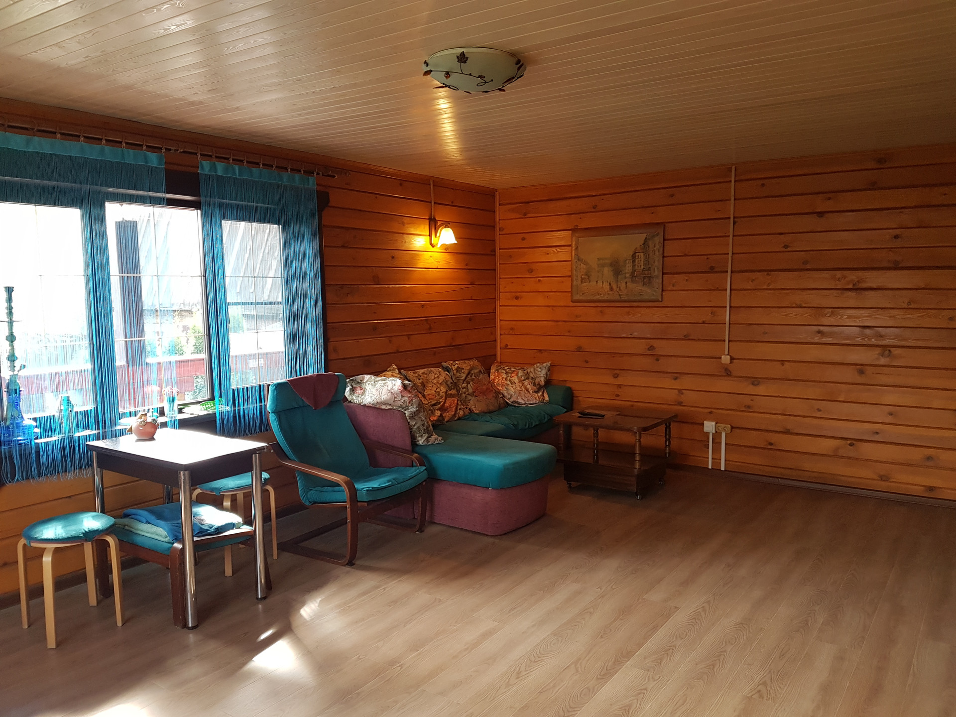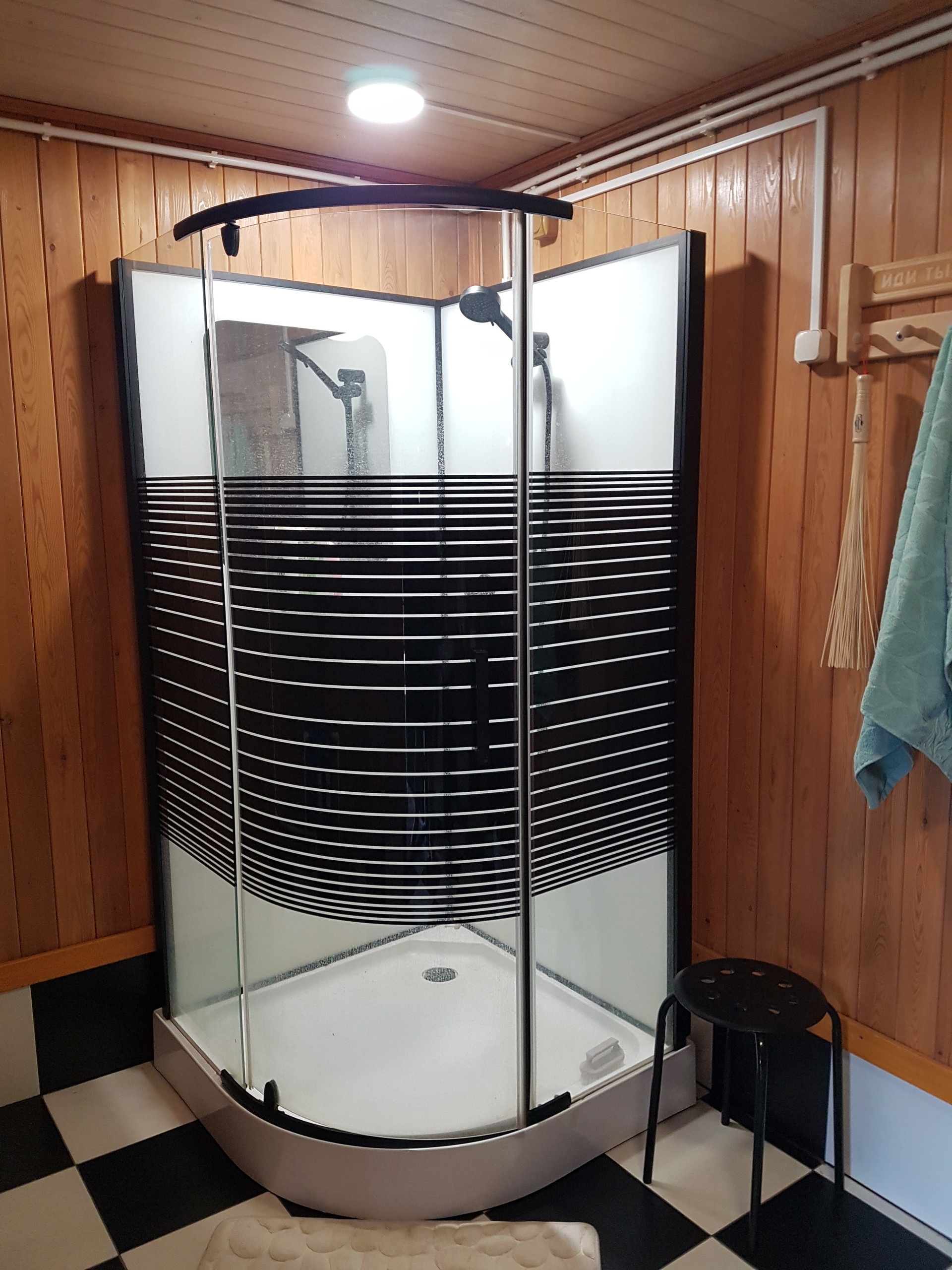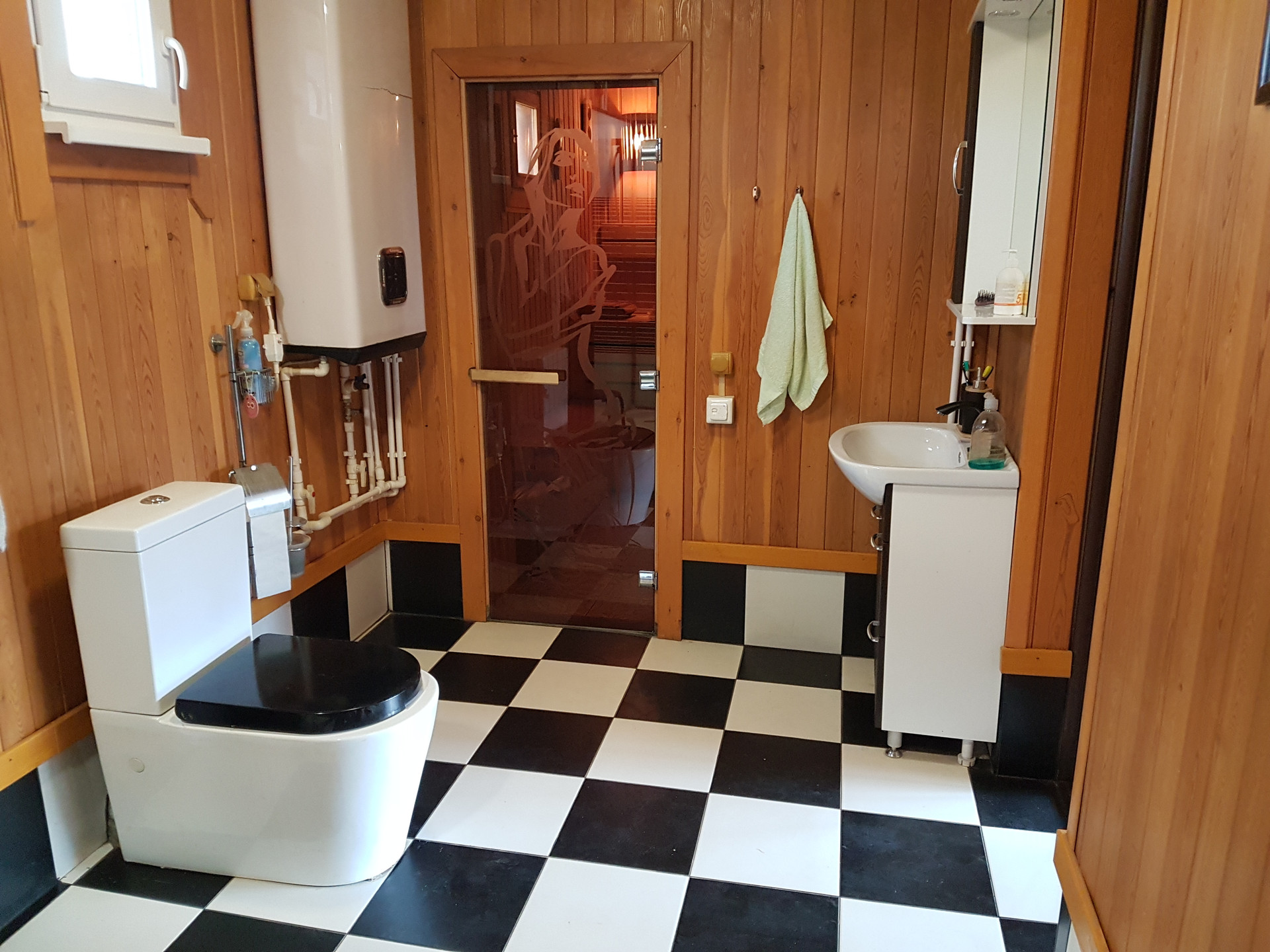 - Баня (служит и гостевым домом) из бруса, большая комната отдыха 28м (теплые полы Тhеrmоmаt), парилка 5,5м, с/у 7,5м (душевая кабина Grоssmаn), веранда 12м.