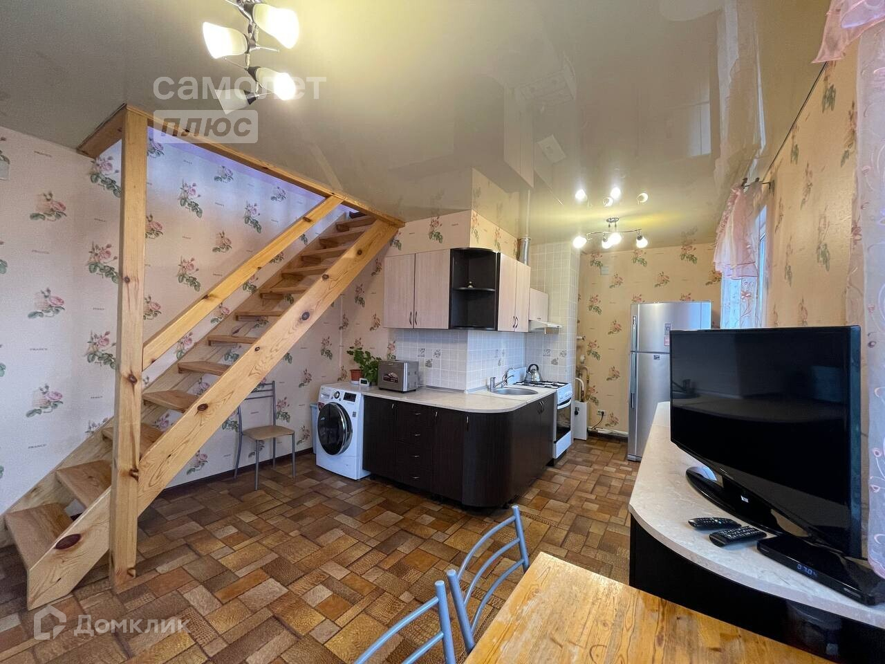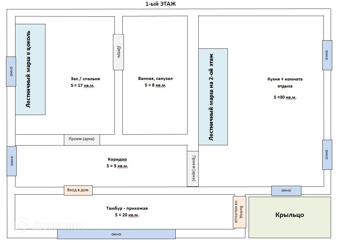 На первом этаже находятся прихожая, гостиная, кухня, санузел и отдельный выход на участок через металлическое крыльцо.