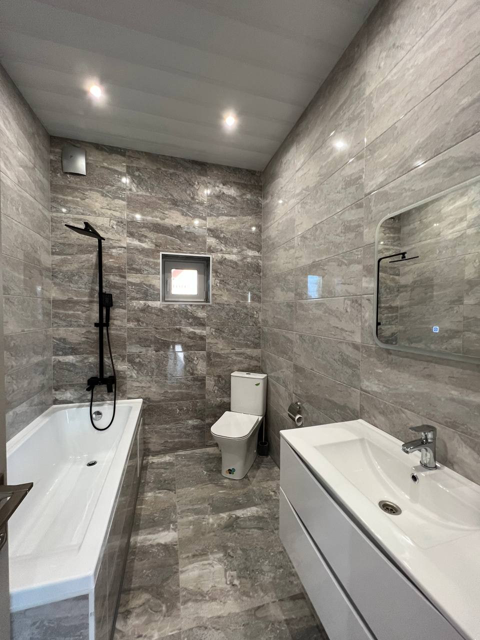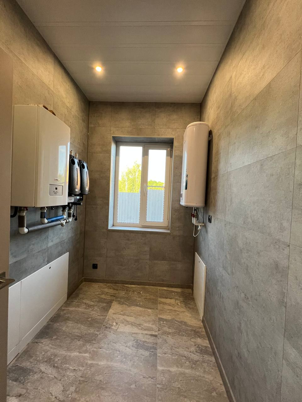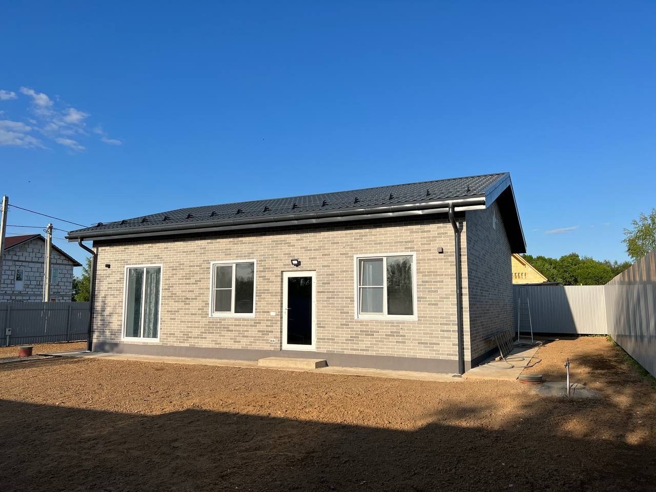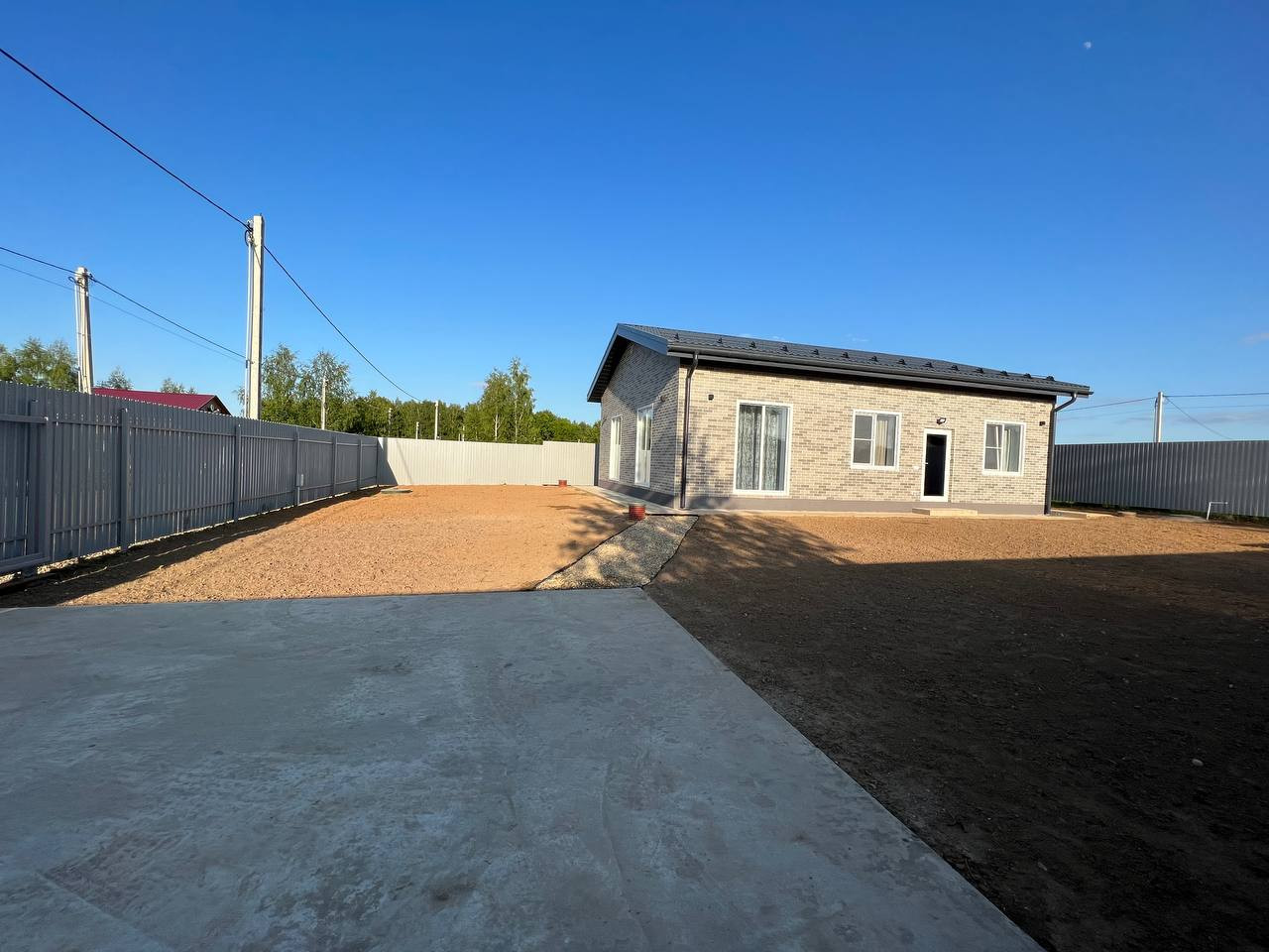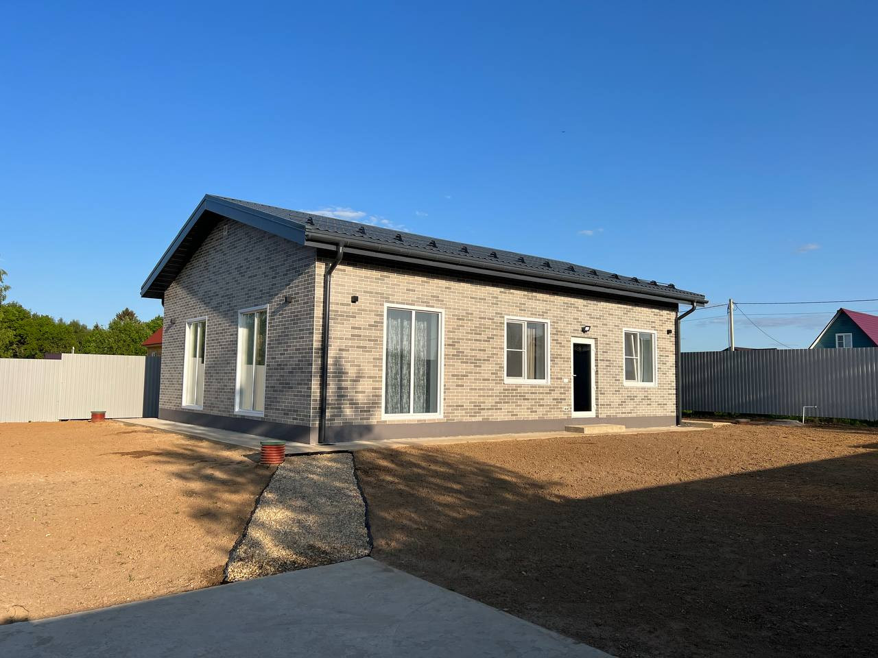 Дом 93.8 кв.м. построенный из Пено блока 400 мм. на монолитном фундаменте. Наружная отделка – АМК, крыша – металлочерепица, дренаж вокруг дома.
