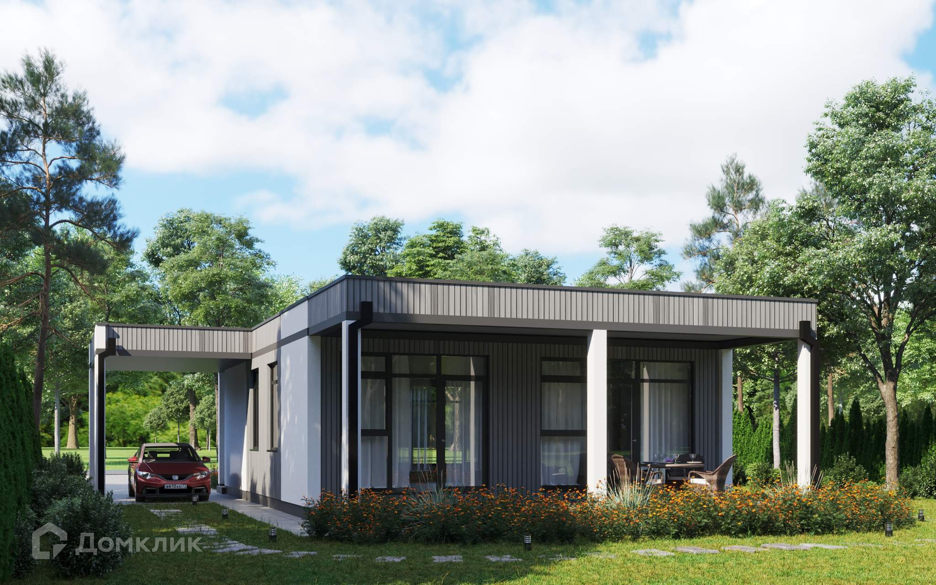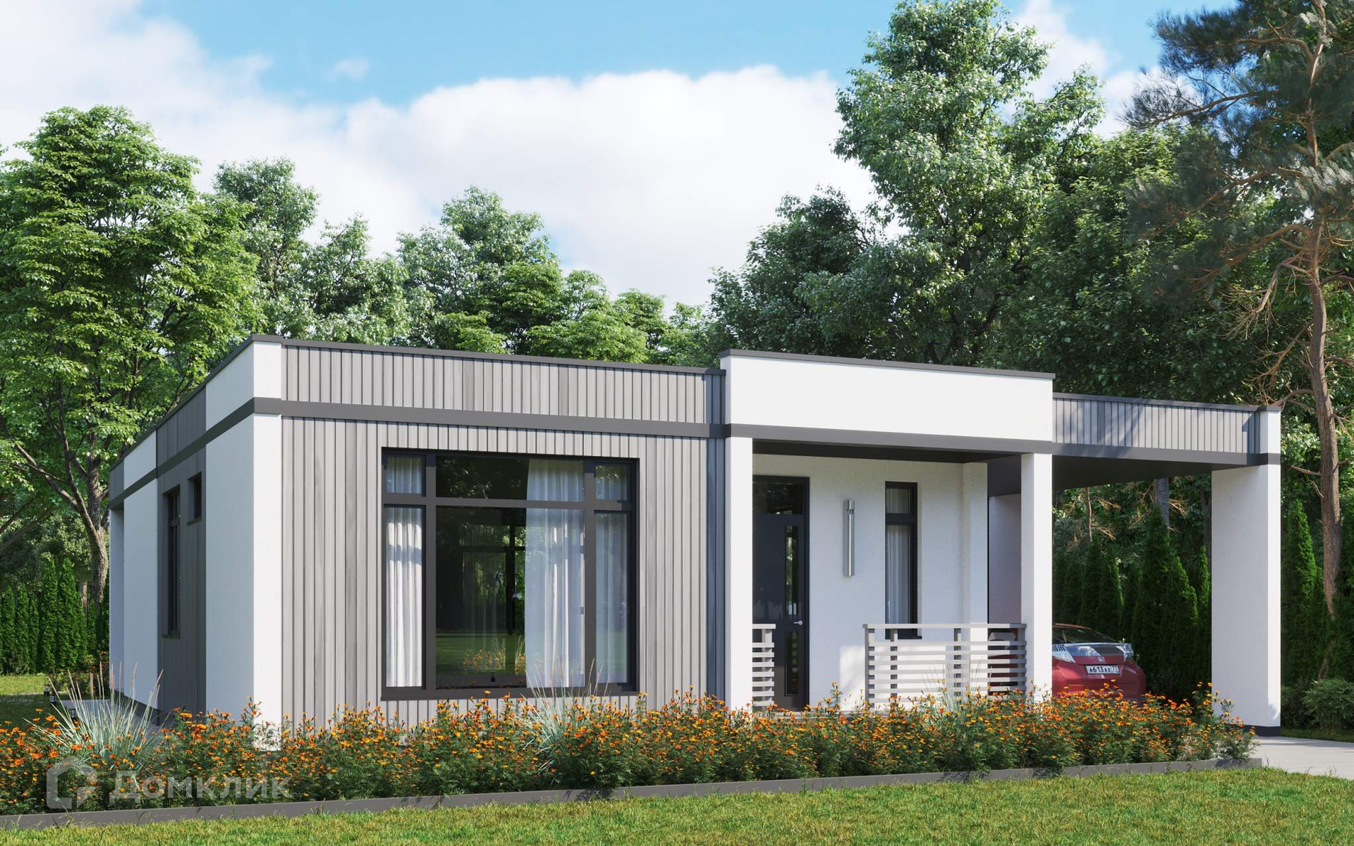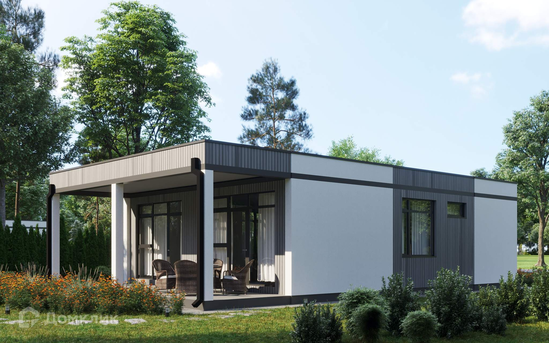 Коттедж одноэтажный, в скандинавском стиле, изготовлен по передовой технологии из долговечных трехслойных железобетонных панелей, предназначен для постоянного (круглогодичного) проживания. Износостойкий фасад с применение композитного планкена подчеркнет современный стиль вашего дома, а качественный фундамент (монолитная плита 300мм) обеспечит надежность и долговечность дома на долгие годы. Благодаря большим панорамным стеклопакетам Rehau (2-ух камерный стеклопакет, 70 профиль)  и стеклянным дверям в доме много естественного света.