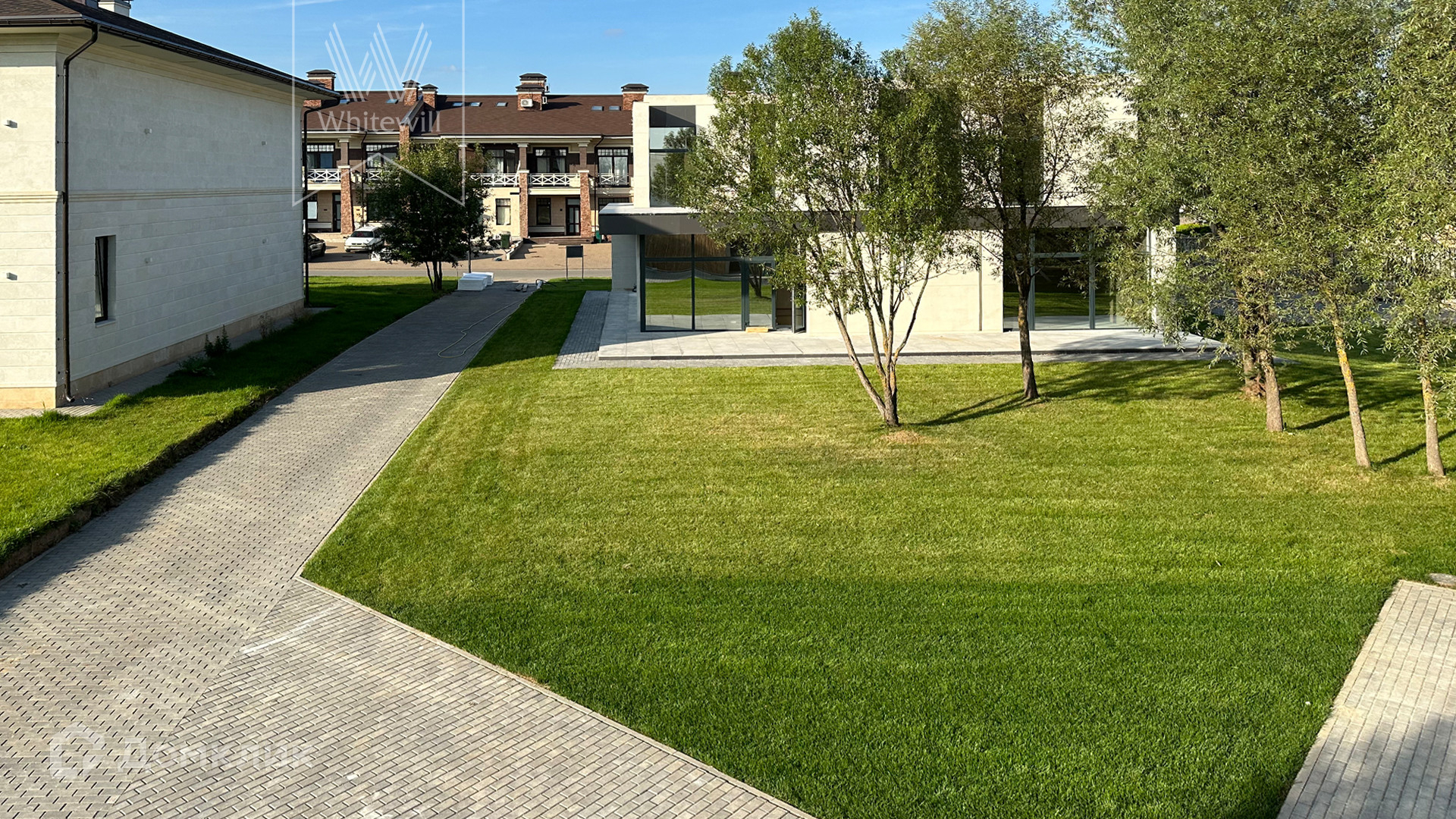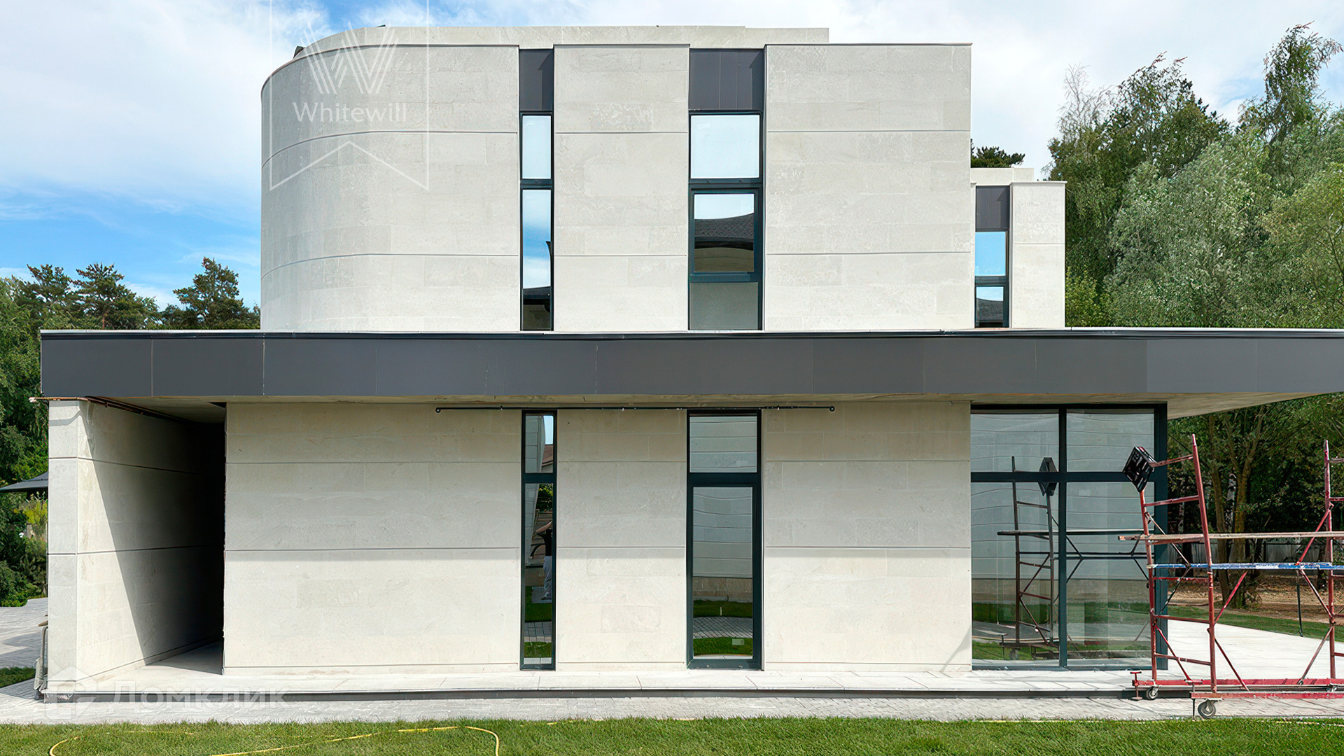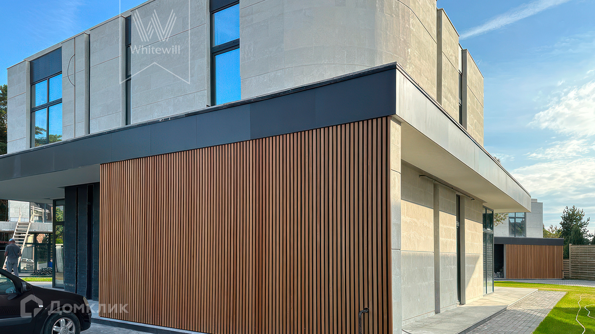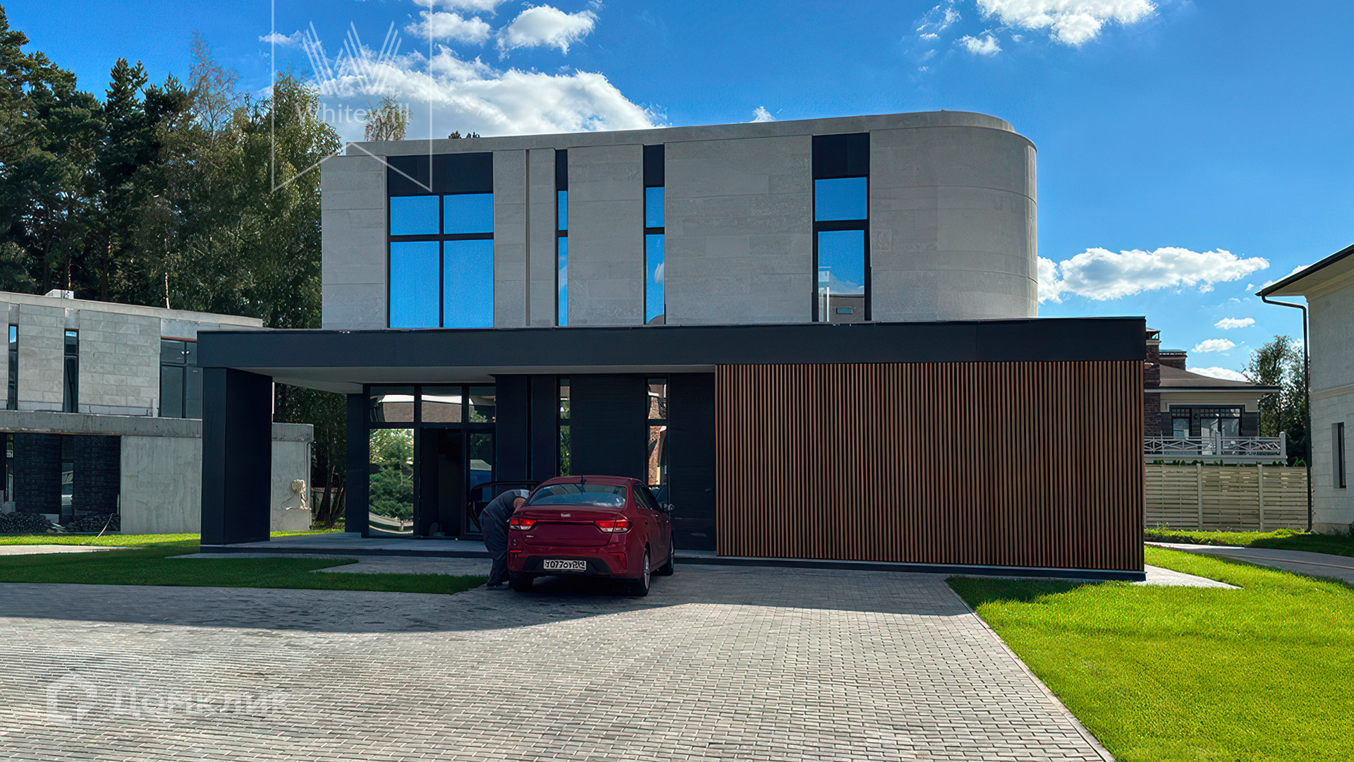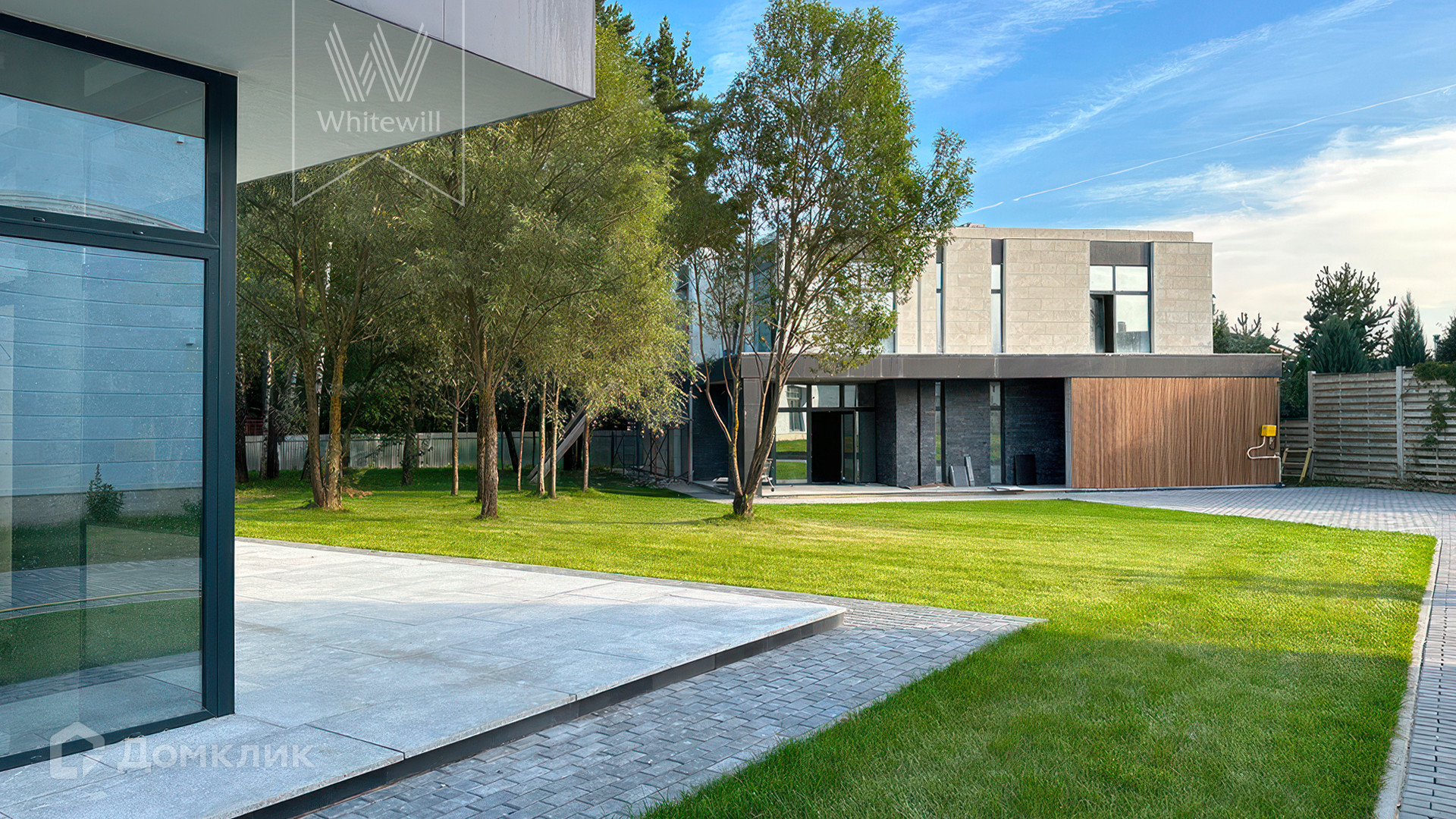 ID 12 105. Прозорово. Загородный дом площадью 309 м² построен на полевом участке 8,5 сотки. Фасад здания с большими окнами выдержан в современном стиле, облицован под светлый камень и декорирован вставками с фактурой дерева. В интерьере с отделкой whitebox осталось лишь выбрать финишные покрытия и установить мебель с бытовой техникой. Планировкой предусмотрены 4 спальни, кухня-столовая и кабинет. На участке вымощены дорожки, засеян газон и растут взрослые деревья.