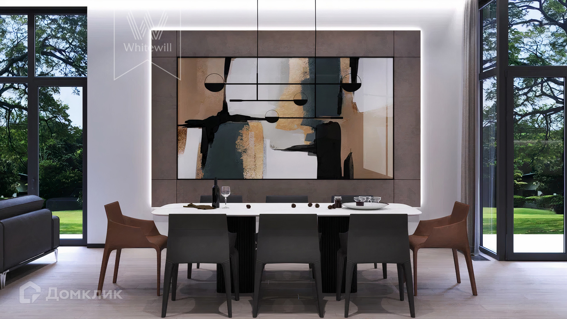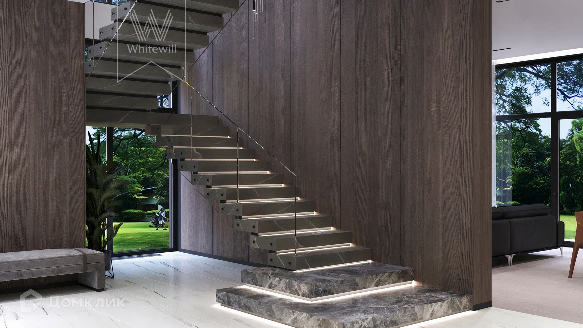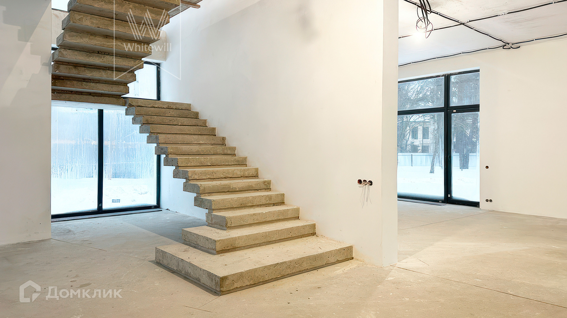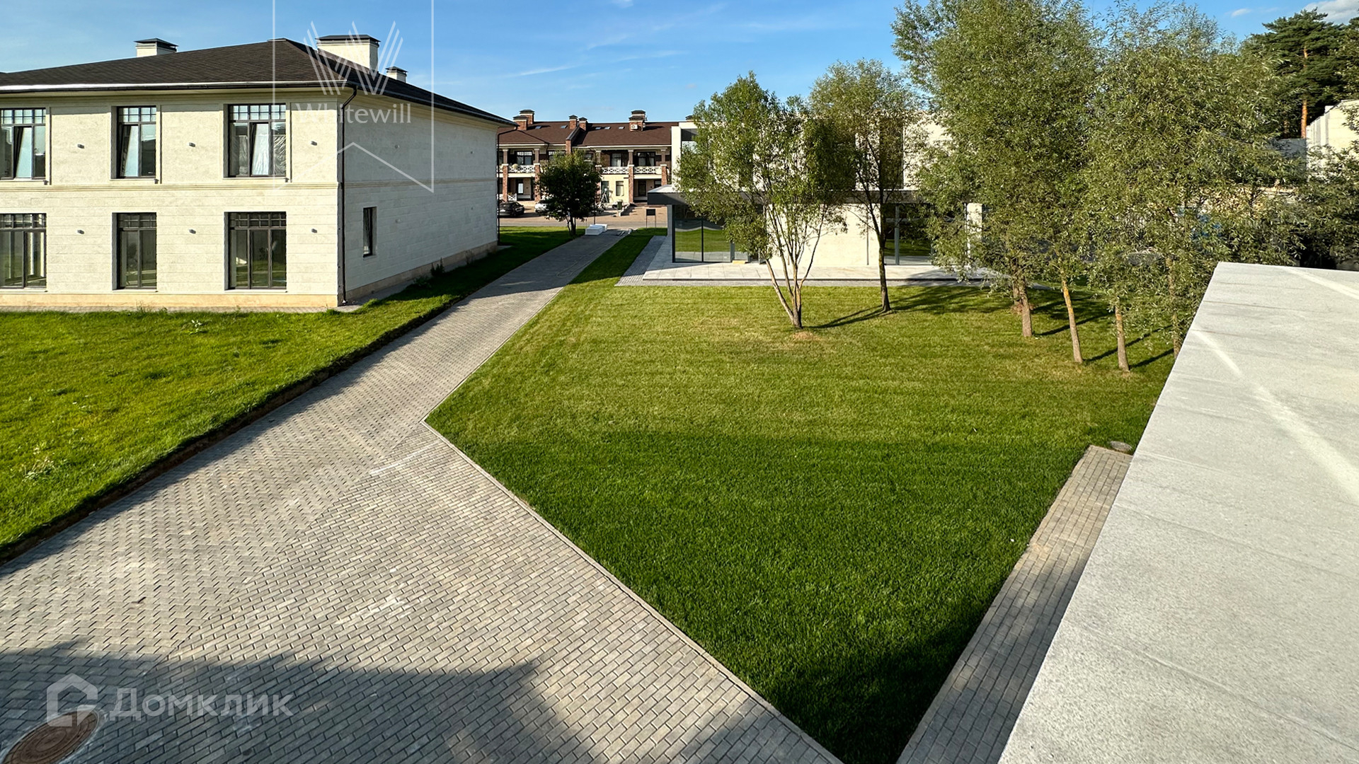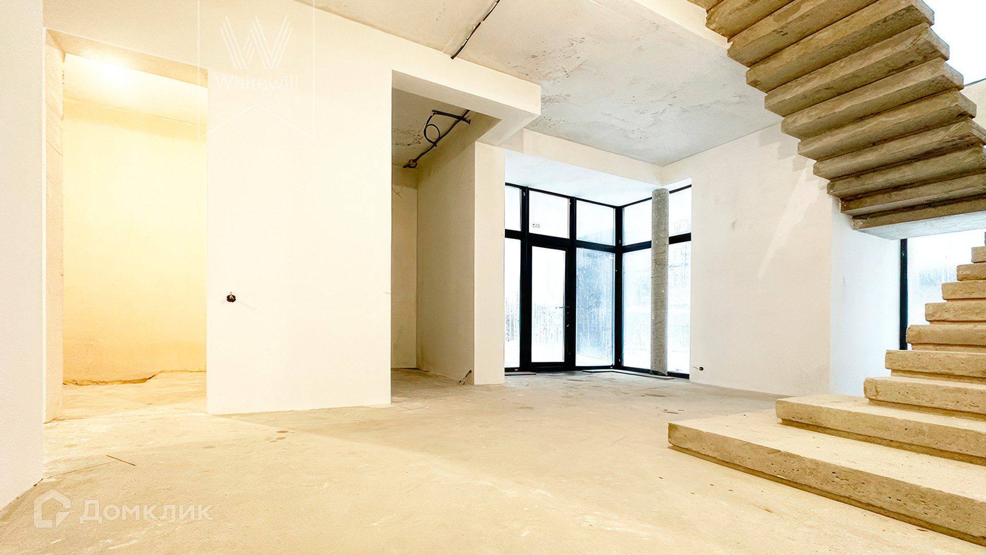ID 12 105. Прозорово. Загородный дом площадью 309 м² построен на полевом участке 8,5 сотки. Фасад здания с большими окнами выдержан в современном стиле, облицован под светлый камень и декорирован вставками с фактурой дерева. В интерьере с отделкой whitebox осталось лишь выбрать финишные покрытия и установить мебель с бытовой техникой. Планировкой предусмотрены 4 спальни, кухня-столовая и кабинет. На участке вымощены дорожки, засеян газон и растут взрослые деревья.