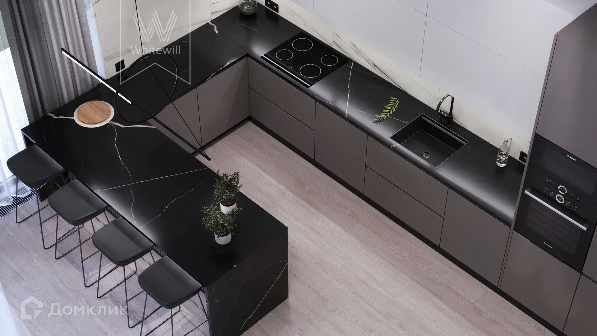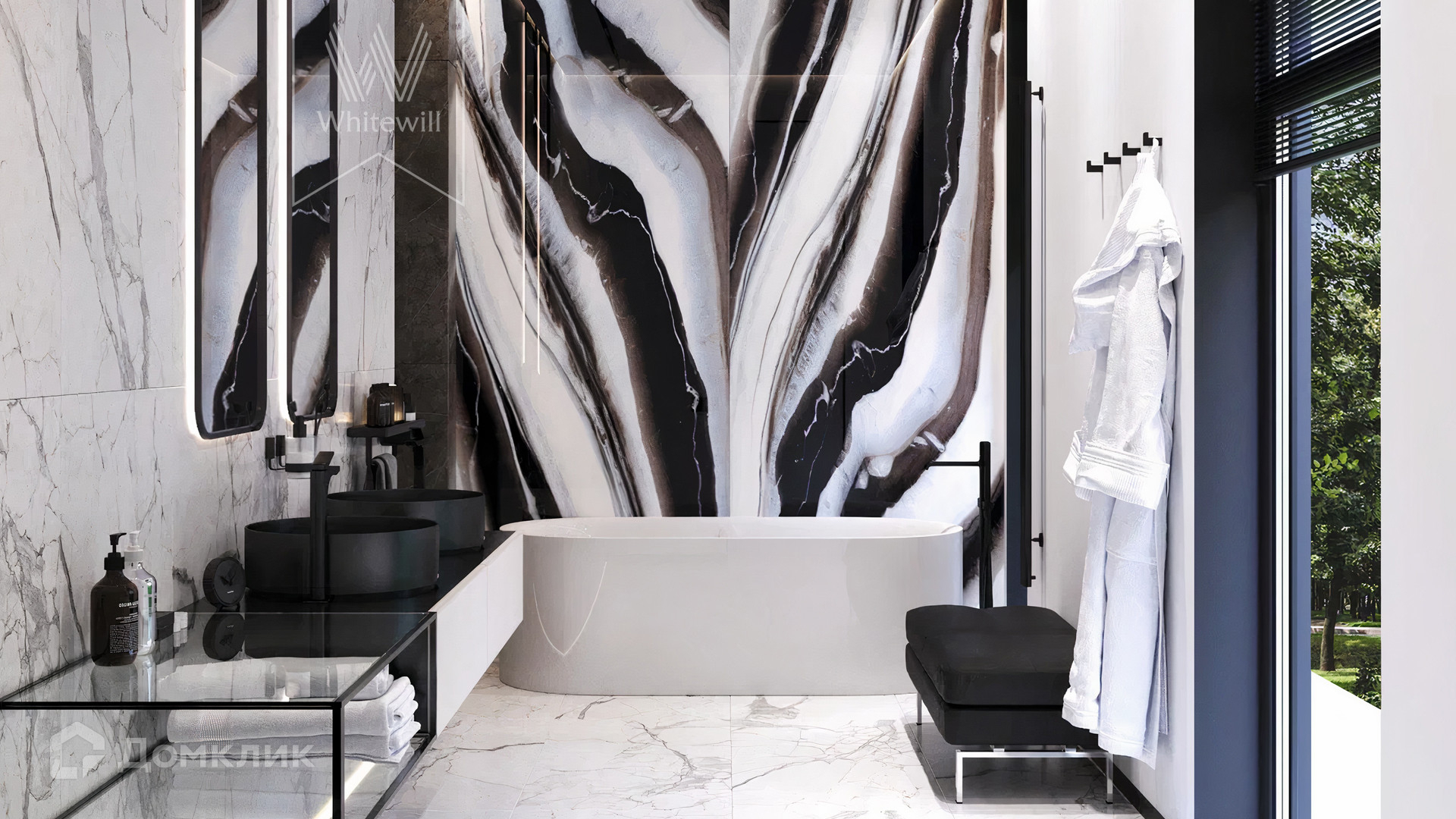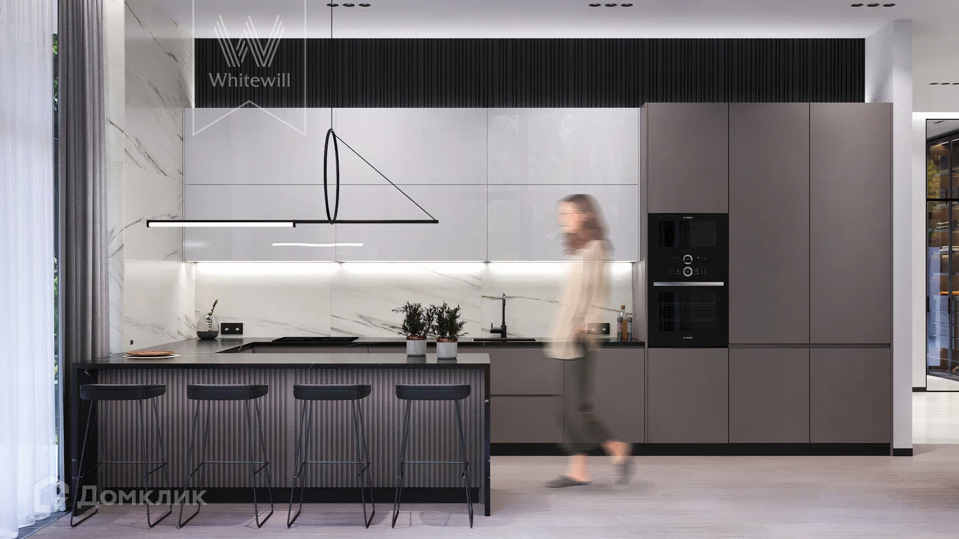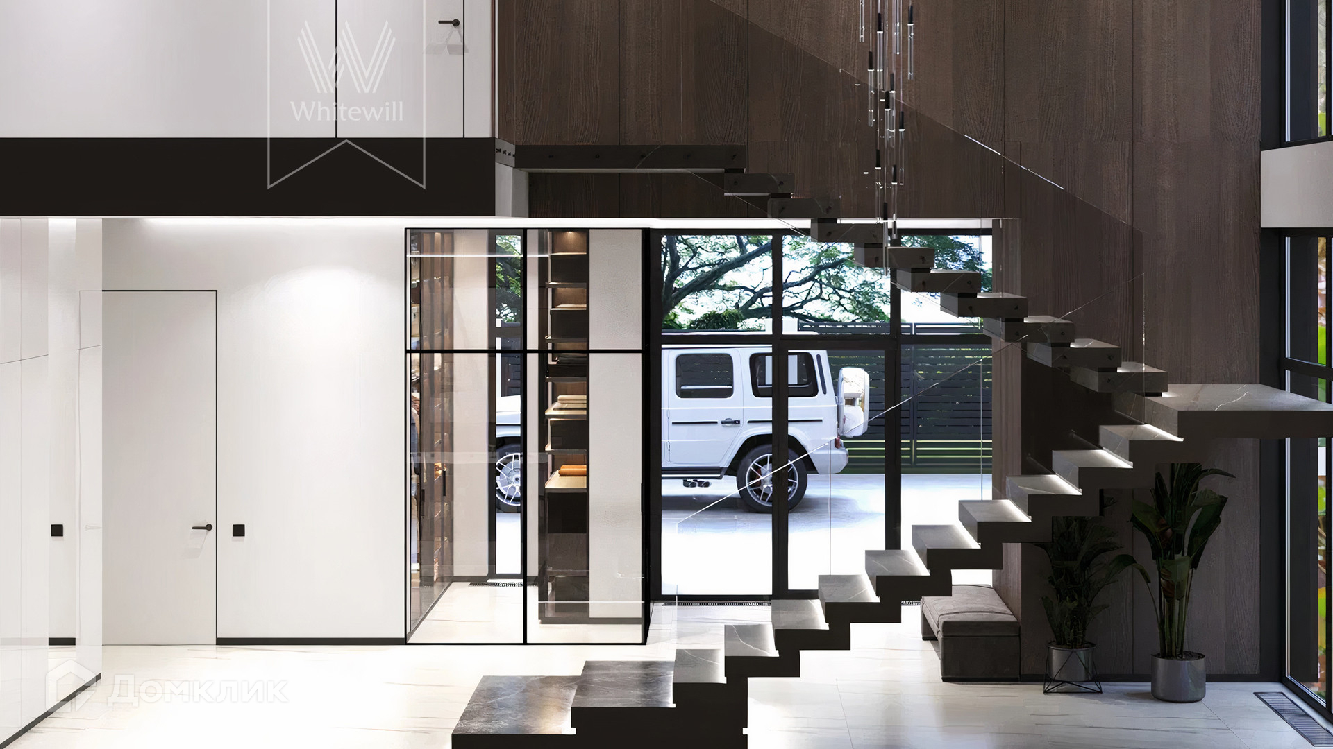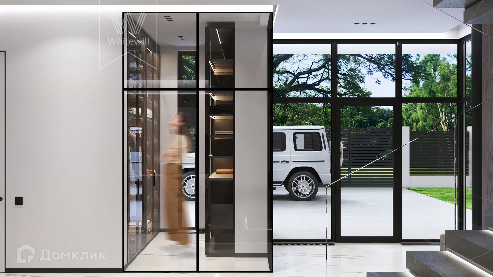 ID 12 105. Прозорово. Загородный дом площадью 309 м² построен на полевом участке 8,5 сотки. Фасад здания с большими окнами выдержан в современном стиле, облицован под светлый камень и декорирован вставками с фактурой дерева. В интерьере с отделкой whitebox осталось лишь выбрать финишные покрытия и установить мебель с бытовой техникой. Планировкой предусмотрены 4 спальни, кухня-столовая и кабинет. На участке вымощены дорожки, засеян газон и растут взрослые деревья.