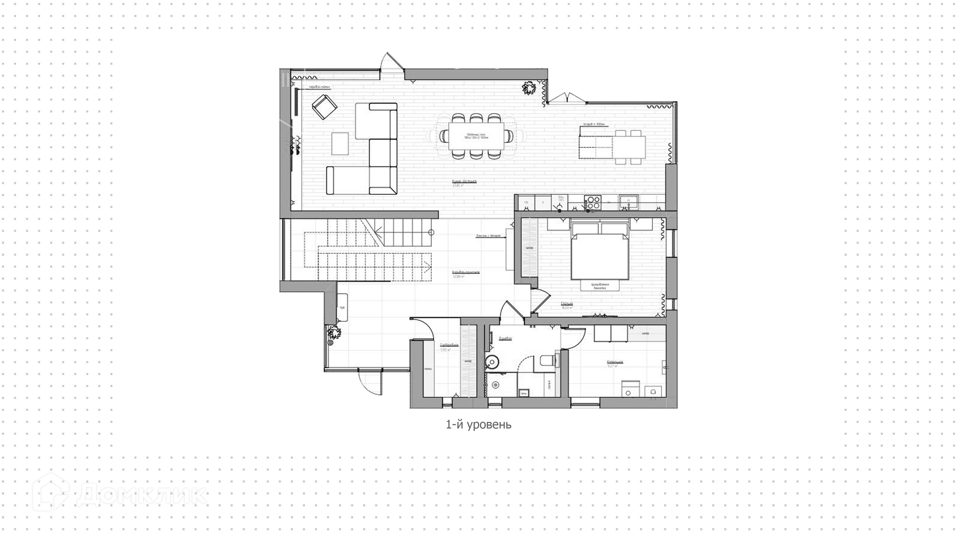 1-й уровень: холл, гардеробная, санузел, котельная, постирочная, гостевая спальня, кухня-столовая.