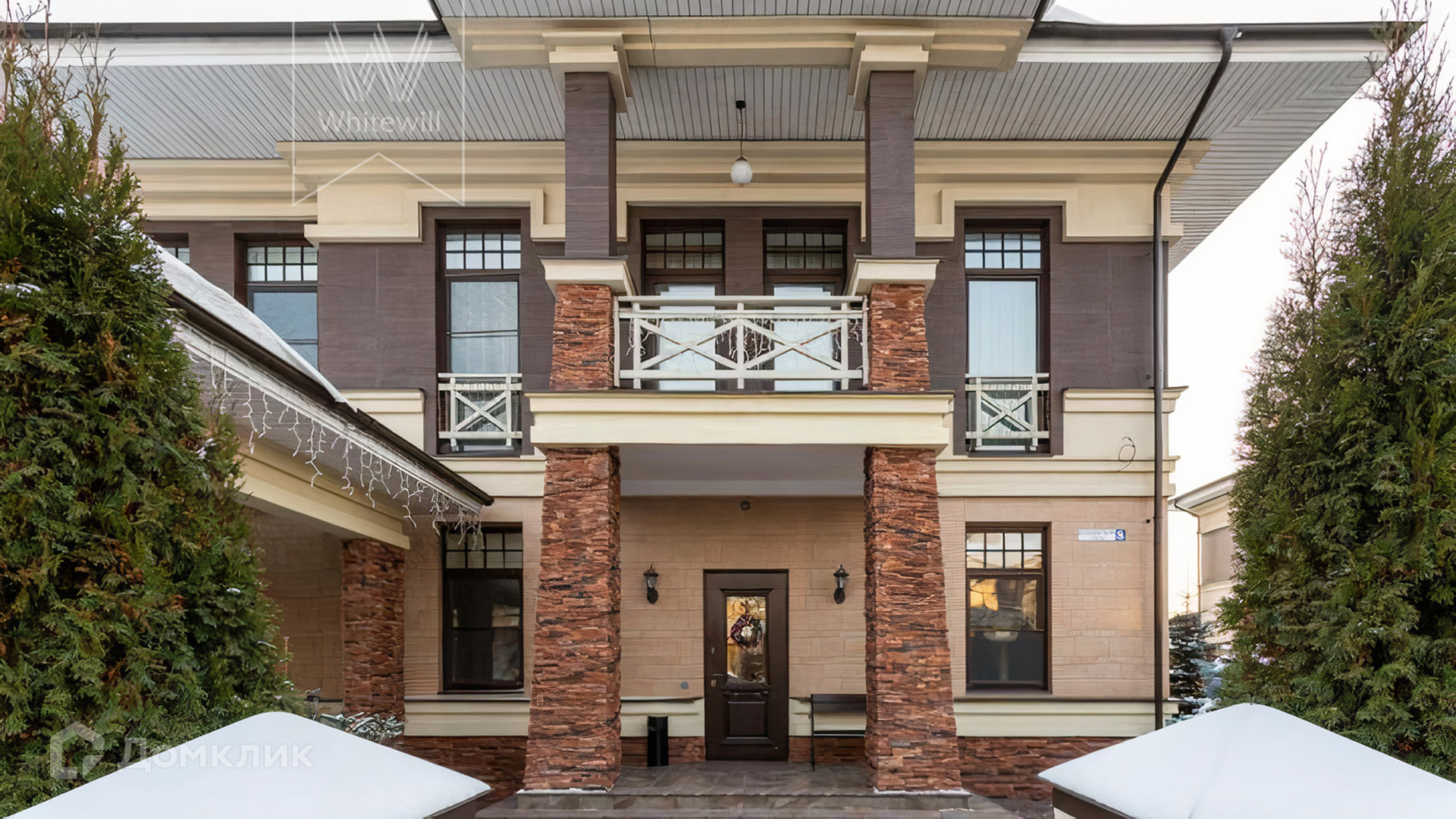 ID 11 280. Прозорово. Уютная резиденция площадью 430 м² расположена на полевом участке 12 соток. Фасад в райтовском стиле облицован бежевым и коричневым камнем. Светлый интерьер с элементами классики оформлен в пастельных тонах. В доме разместили 4 спальни, просторную гостиную с панорамными окнами, камином и выходом на террасу, кухню, кабинет и тренажерный зал. Предусмотрен блок для персонала с кухней, санузлом и отдельным входом, к дому пристроен навес на 2 машины. На участке выполнен ландшафтный дизайн, вымощены дорожки и высажены туи.