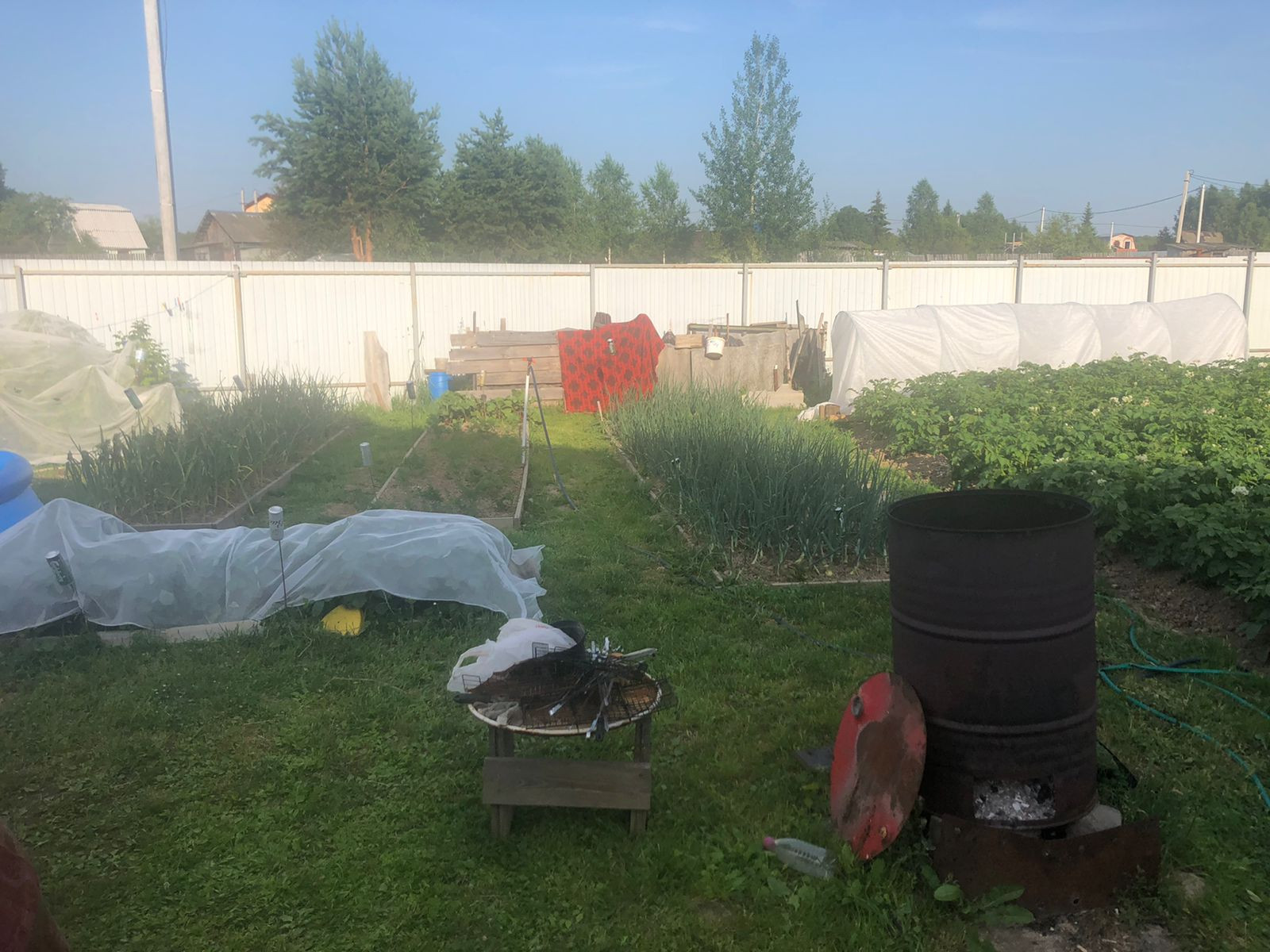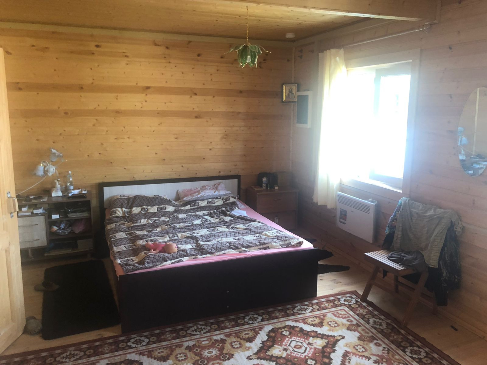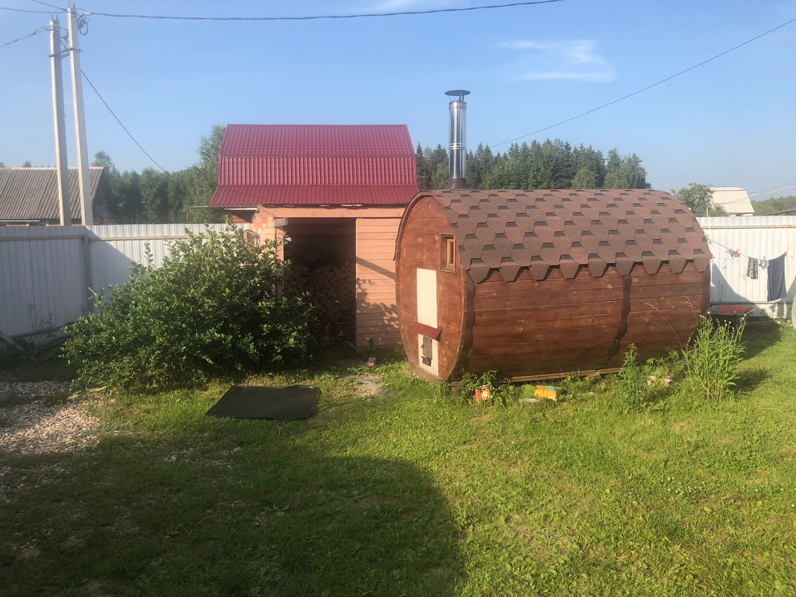 Современный каркасный дом на свайном фундаменте с электрическим отоплением. На первом этаже веранда, кухня (10м) и комната (20м), туалет, подсобное помещение. На мансардном этаже две комнаты (20 и 13м). Также на участке расположена баня "Бочка", хоз. постройки.