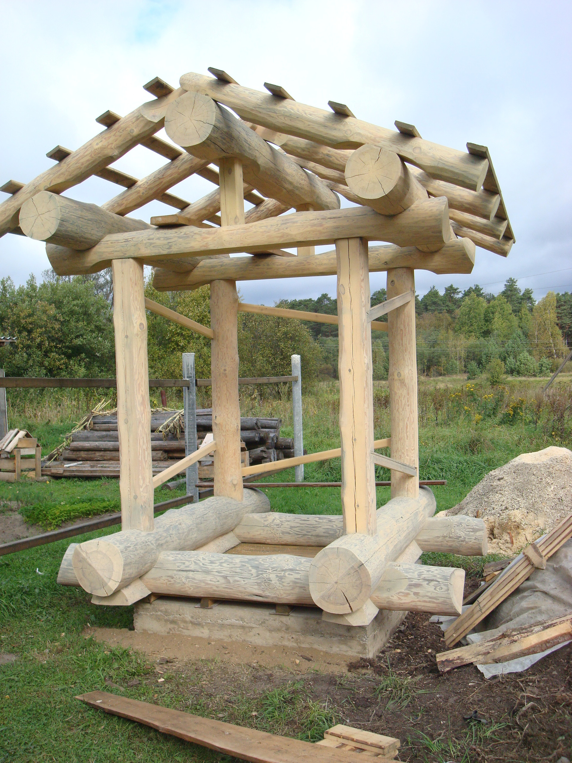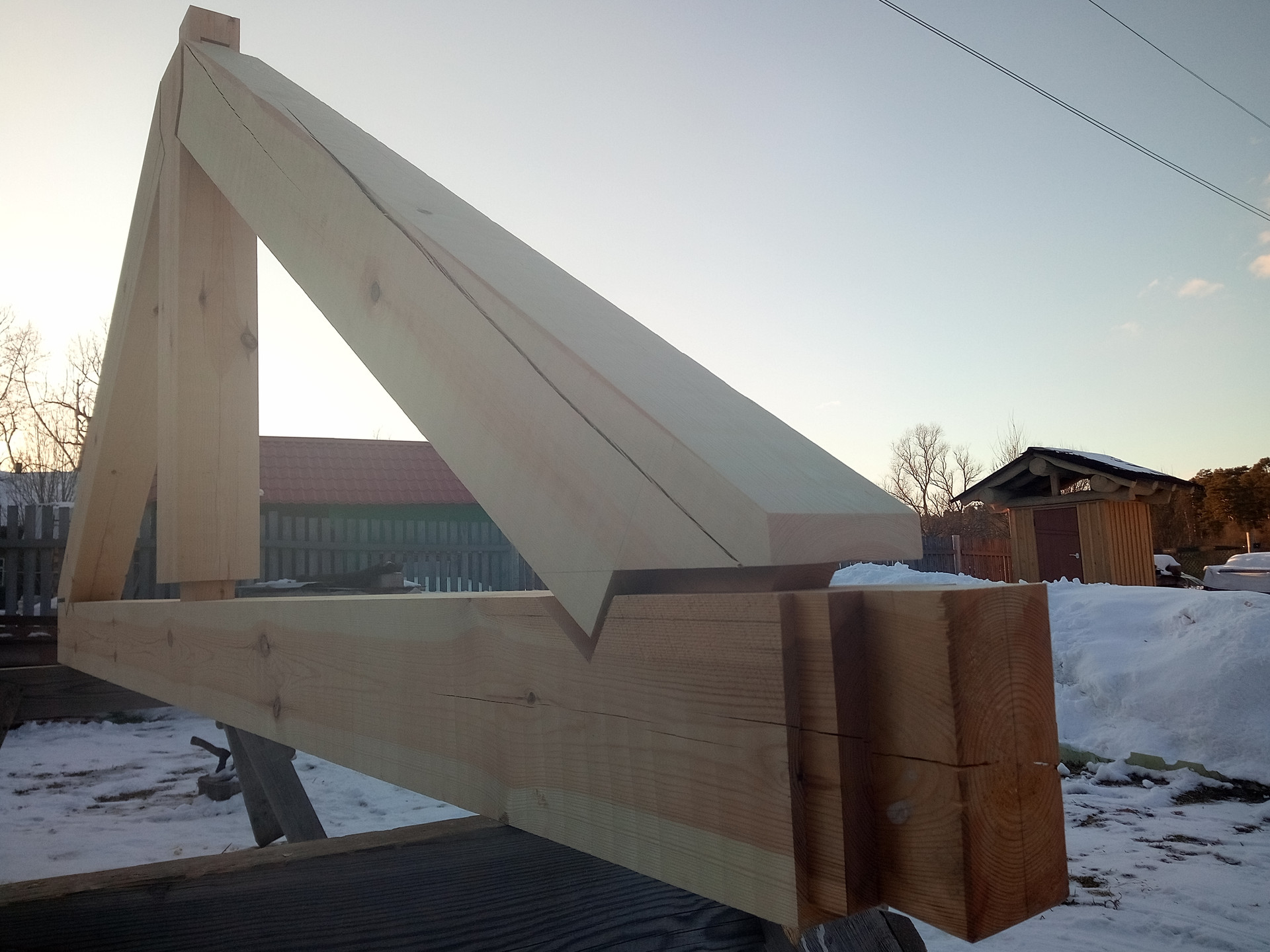 Каркас изготовлен по технологии Timber Frame, из сухой, отлежавшейся сосны. Элементы каркаса соединены по принципу шип-паз, и стянуты нагелем. Каркас обшивается снаружи, и остается видимым внутри. На основе этого каркаса можно построить беседку, летний или зимний домик. Его можно пристроить к уже существующему зданию, или использовать в качестве архитектурного элемента в новом проекте.