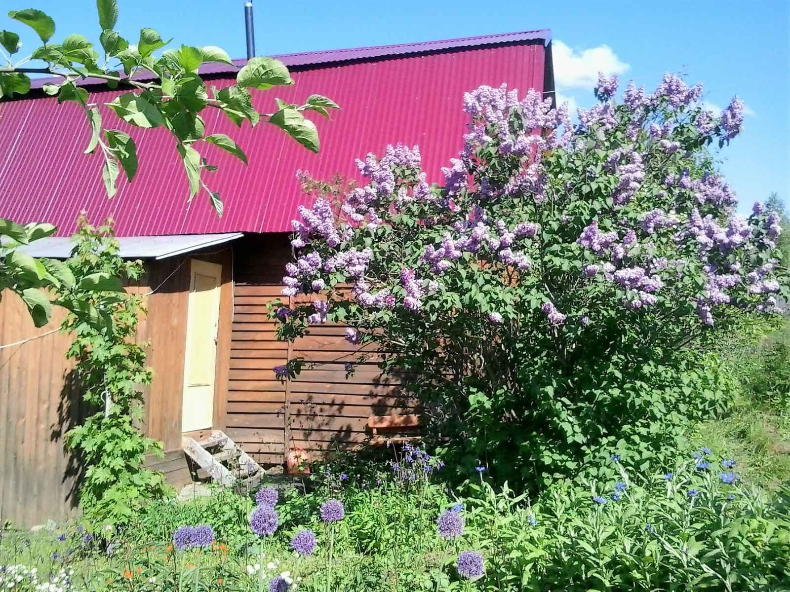На участке много цветов, 3 яблони, 3 вишни, терновник, боярышник, смородина, малина 2 сотки(4 ведра малины),
