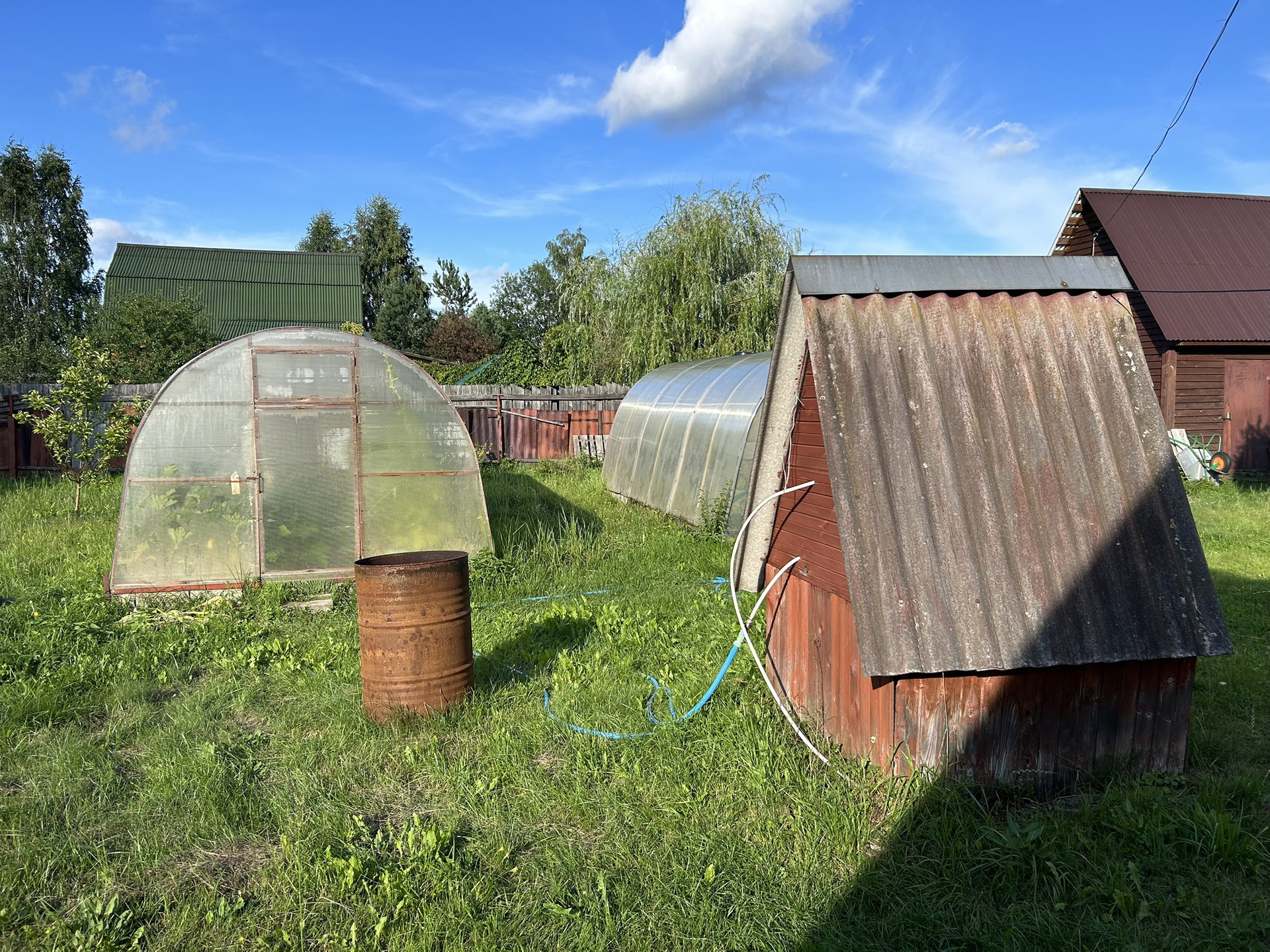 Участок очень высокий, ровный, сухой, имеет заезд с тихого проулка. Посажены туи, есть теплица, также растет клубника, плодовые деревья и кустарники.
