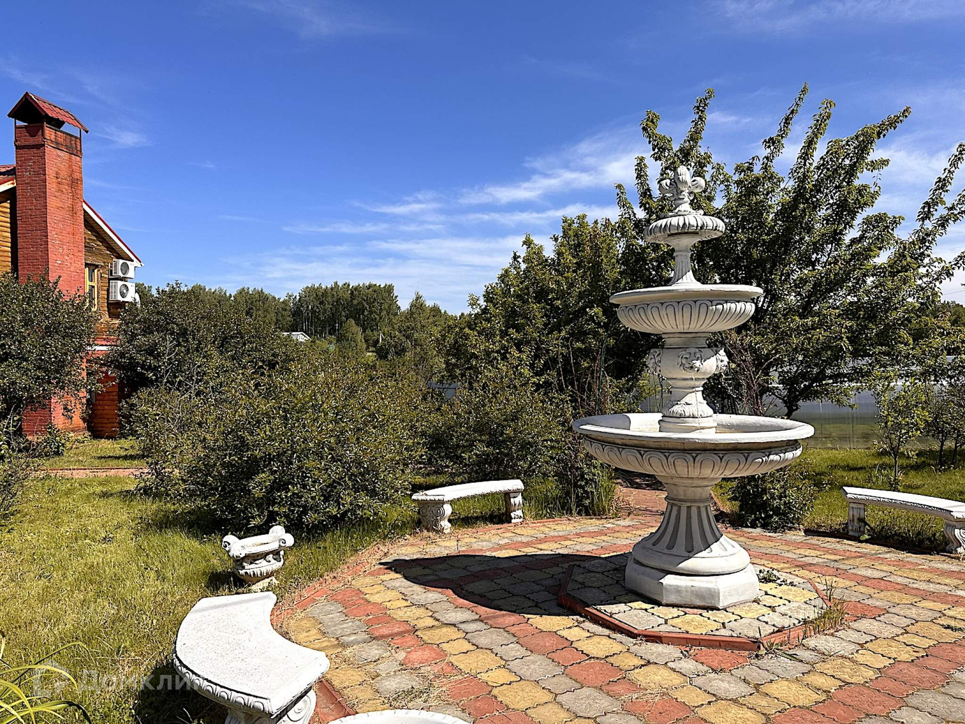 Фонтан с мраморными скамьями и вазонами