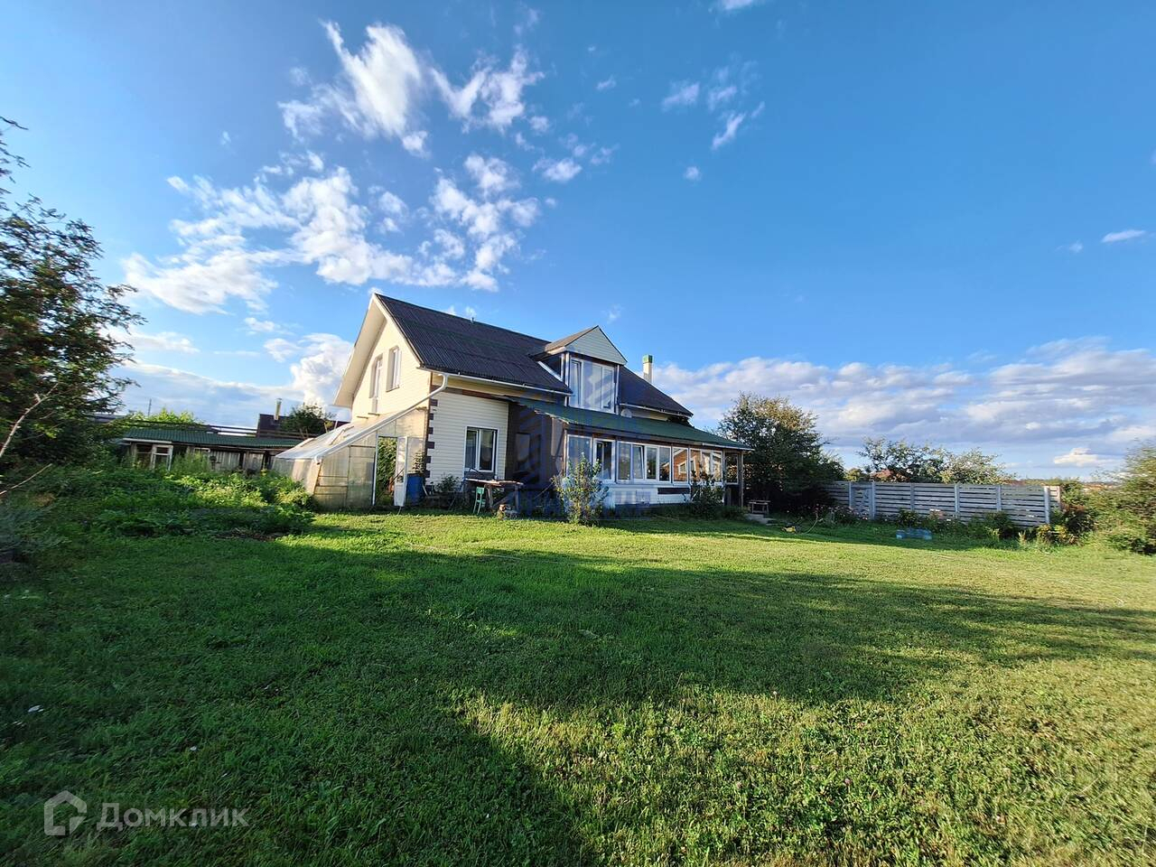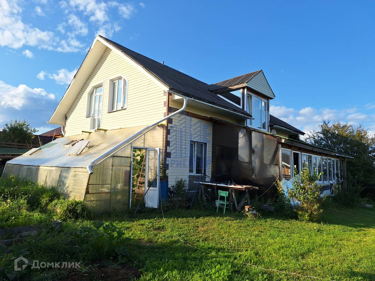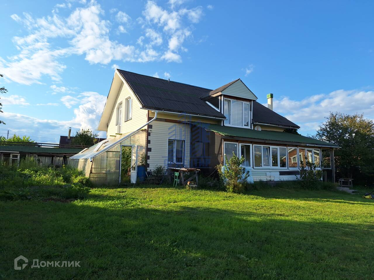 На территории участка много декоративных кустарников и цветов, рядом с домом небольшой огород ,установлена теплица.