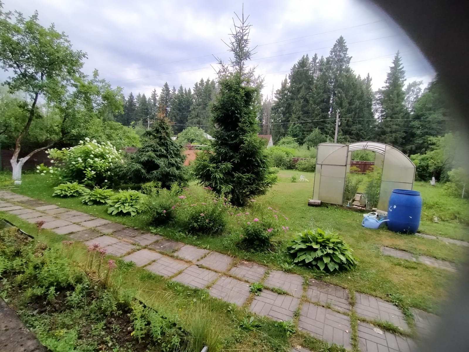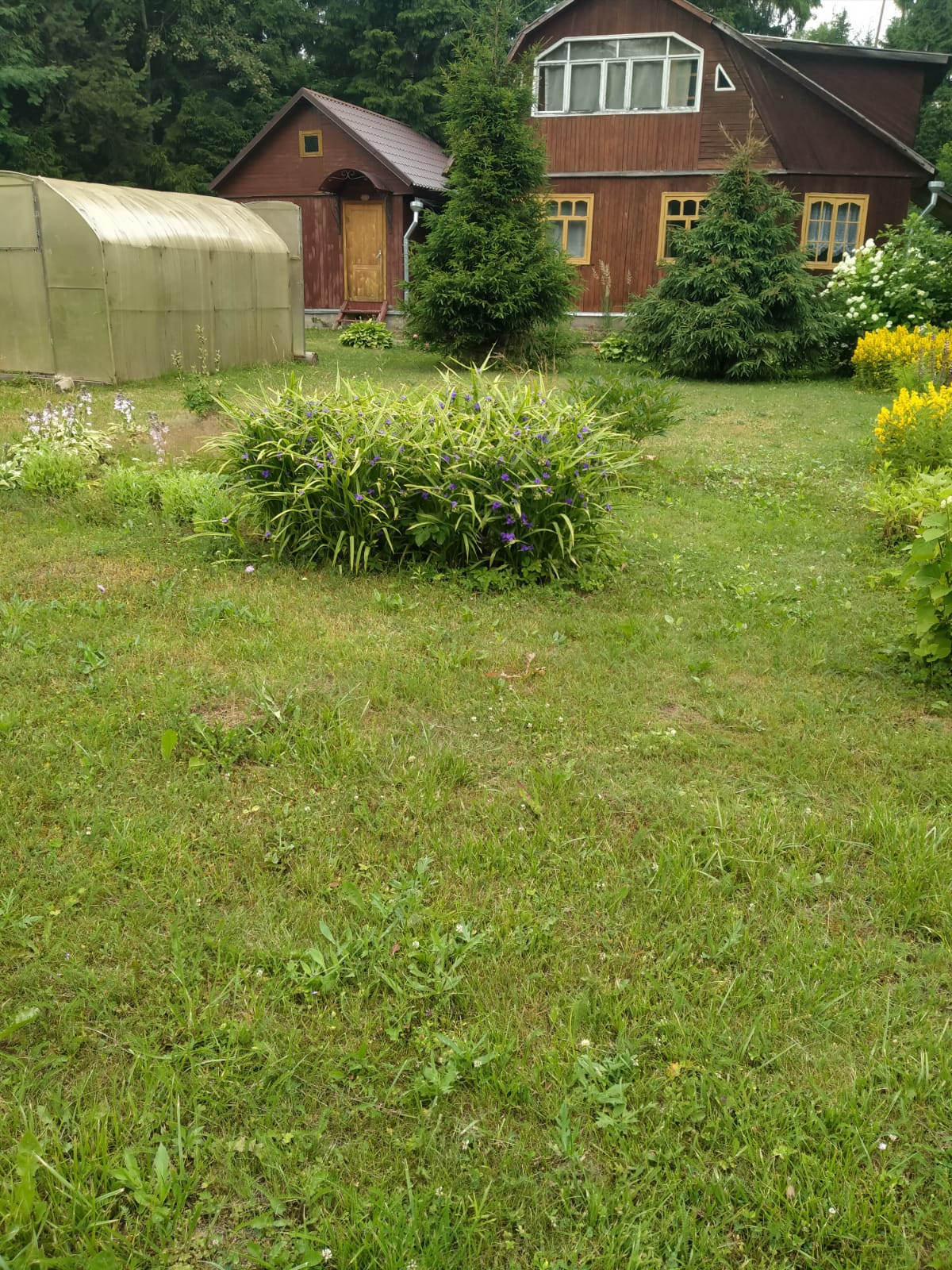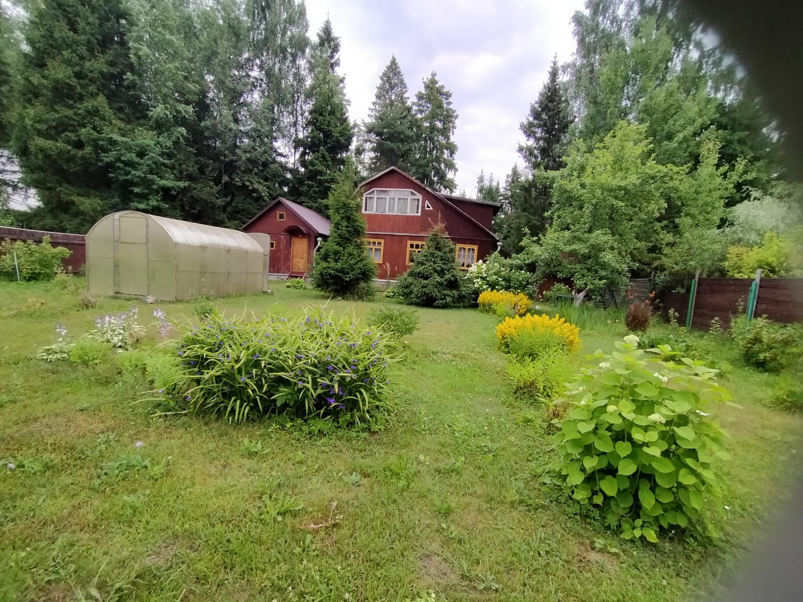 ► На участке растёт : аккуратный газон, яблоня, малина, смородина, клубника, хвойные растения, клумбы с цветами.