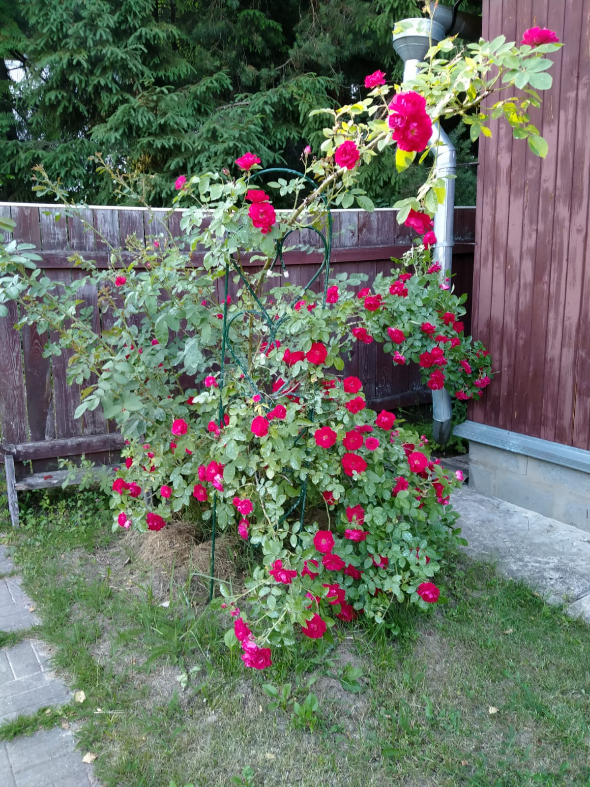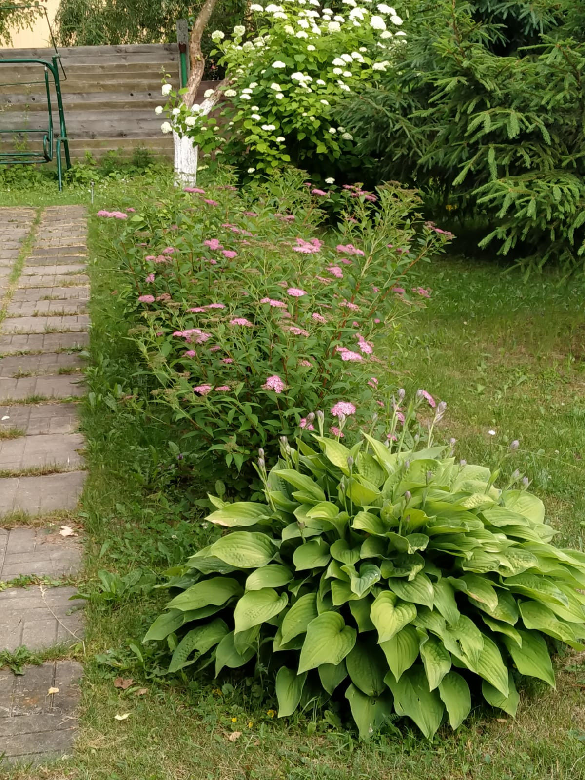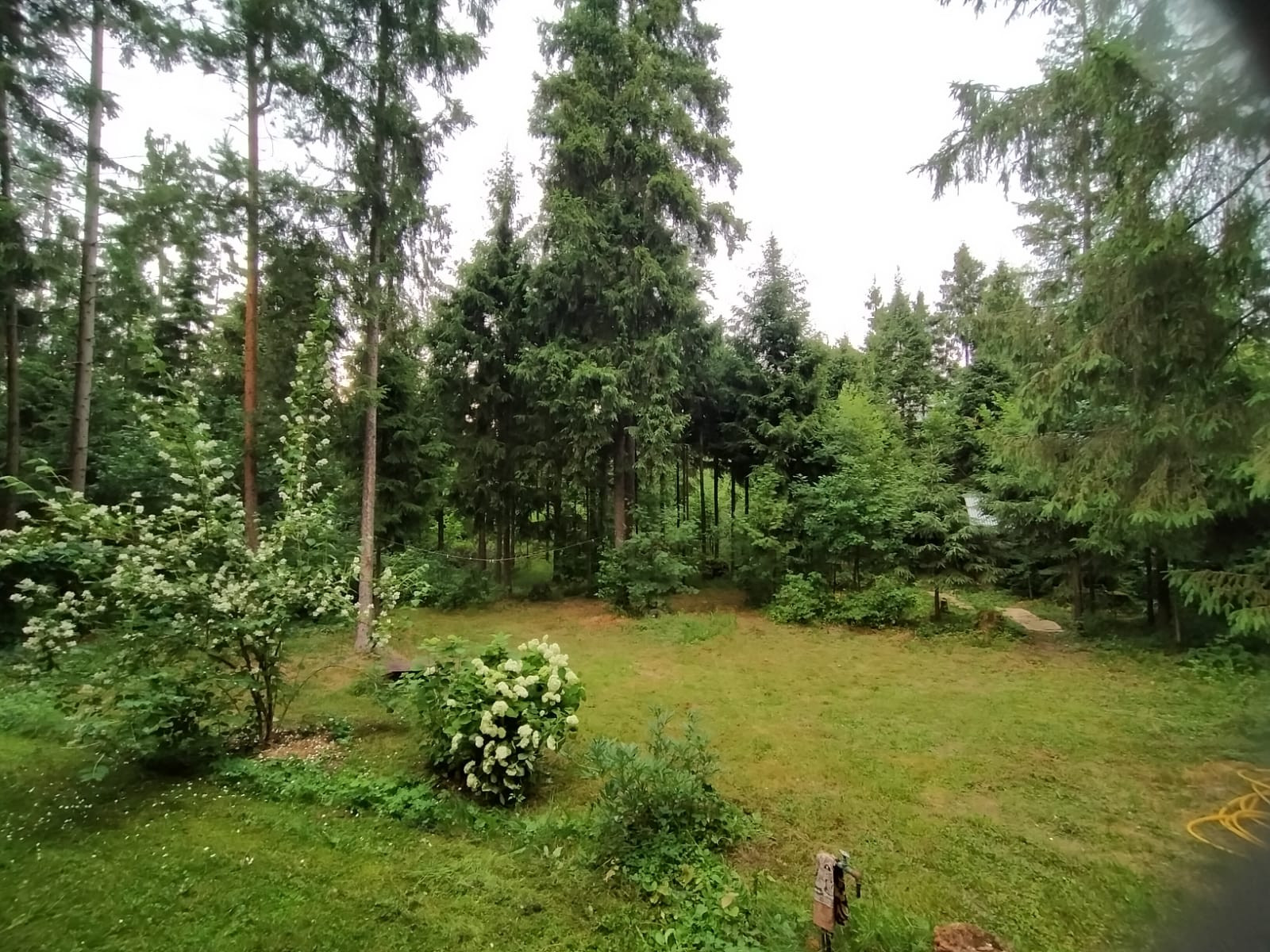 ► На участке растёт : аккуратный газон, яблоня, малина, смородина, клубника, хвойные растения, клумбы с цветами.