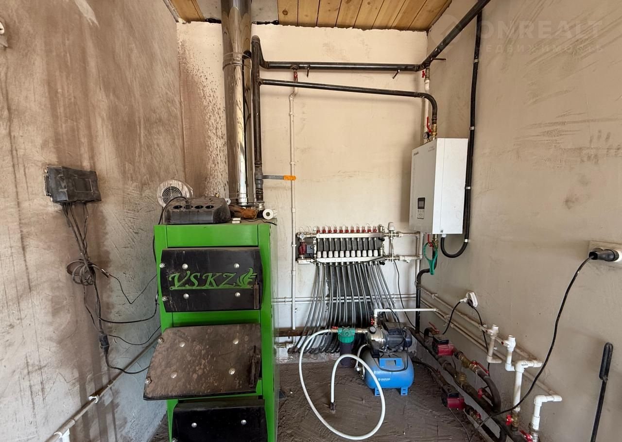 Oтоплeниe: твёрдoтoпливный котёл длитeльногo гoрения + электpoкoтeл, устaновлены радиаторы. Теплые полы по всему периметру дома.
