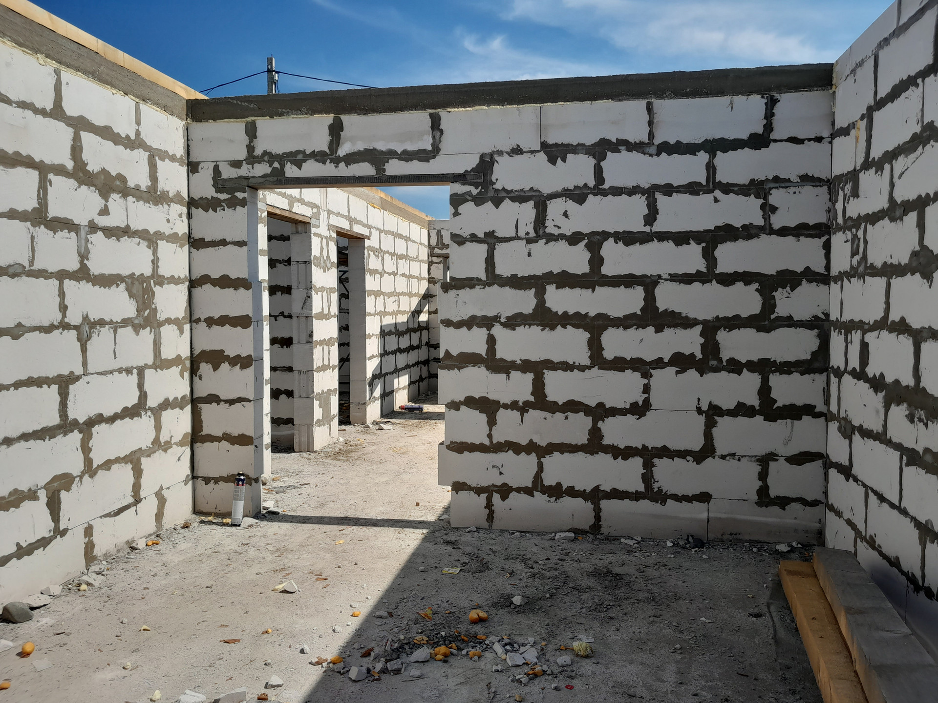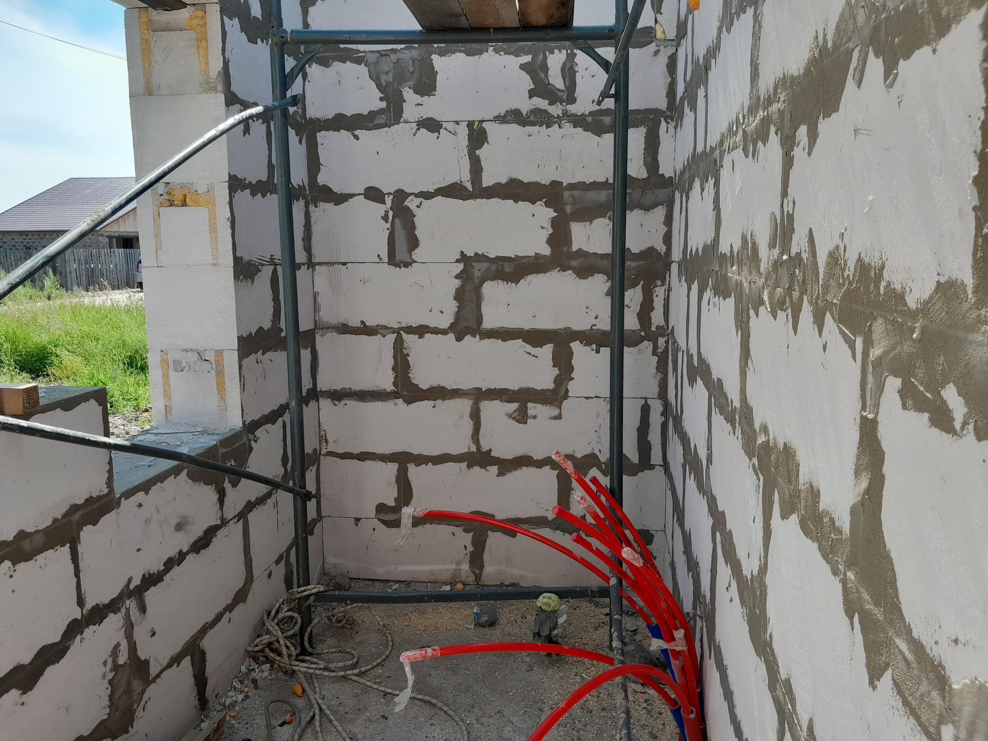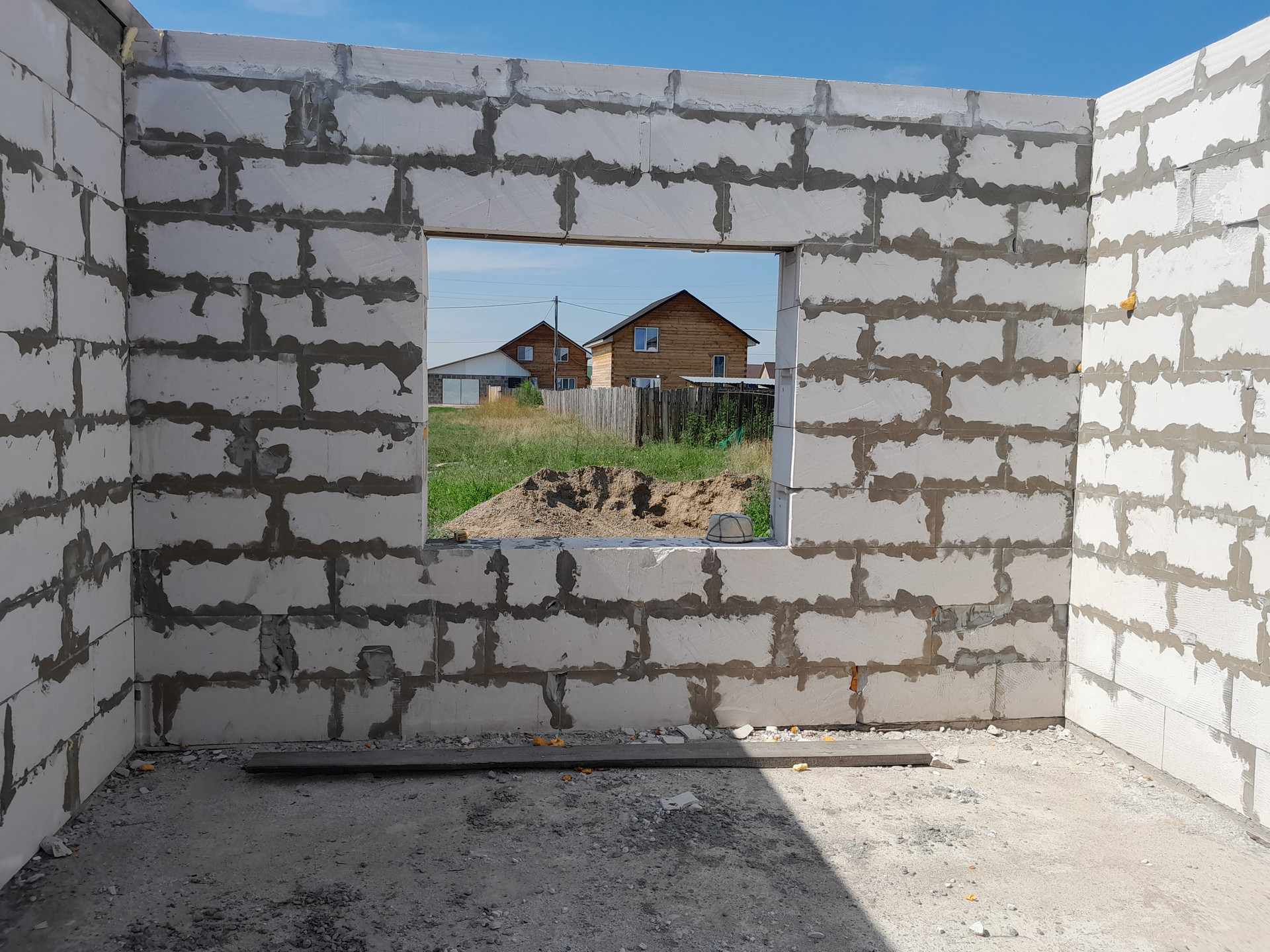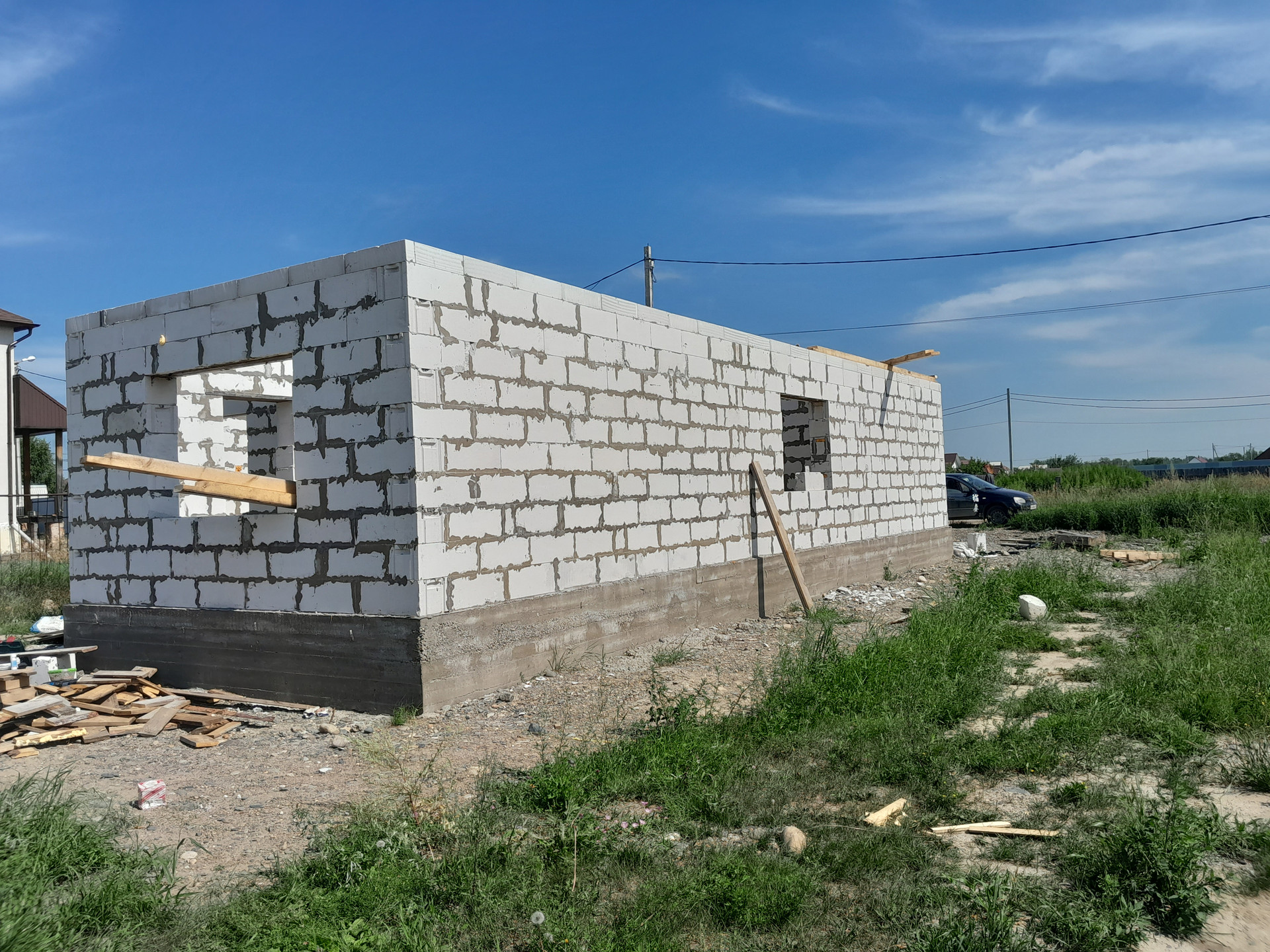 Ориентировочно через месяц дом будет готов к сдаче в эксплуатацию. Кровля  из ондулина. Снаружи дома будет штукатурка короед  или под кирпич (обсуждается) , внутри стены будут готовы под обои.