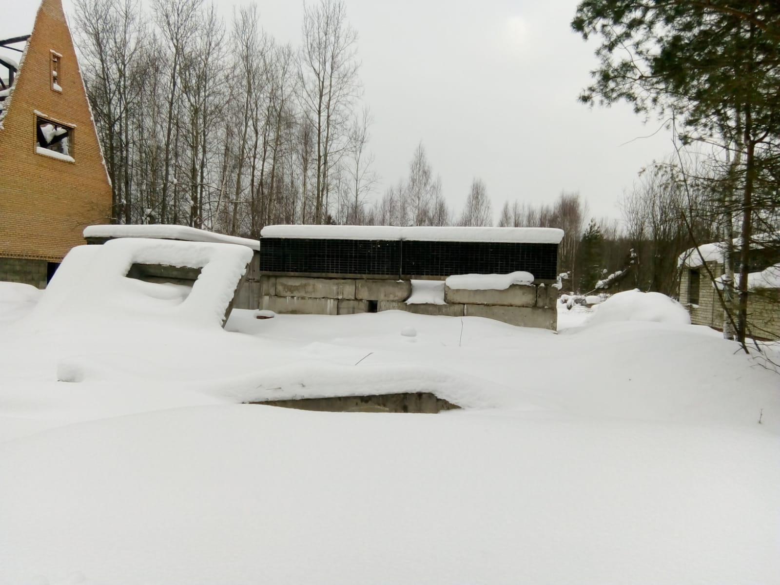 На участке фундамент из бетонных блоков, гараж из железо-бетонных блоков.
