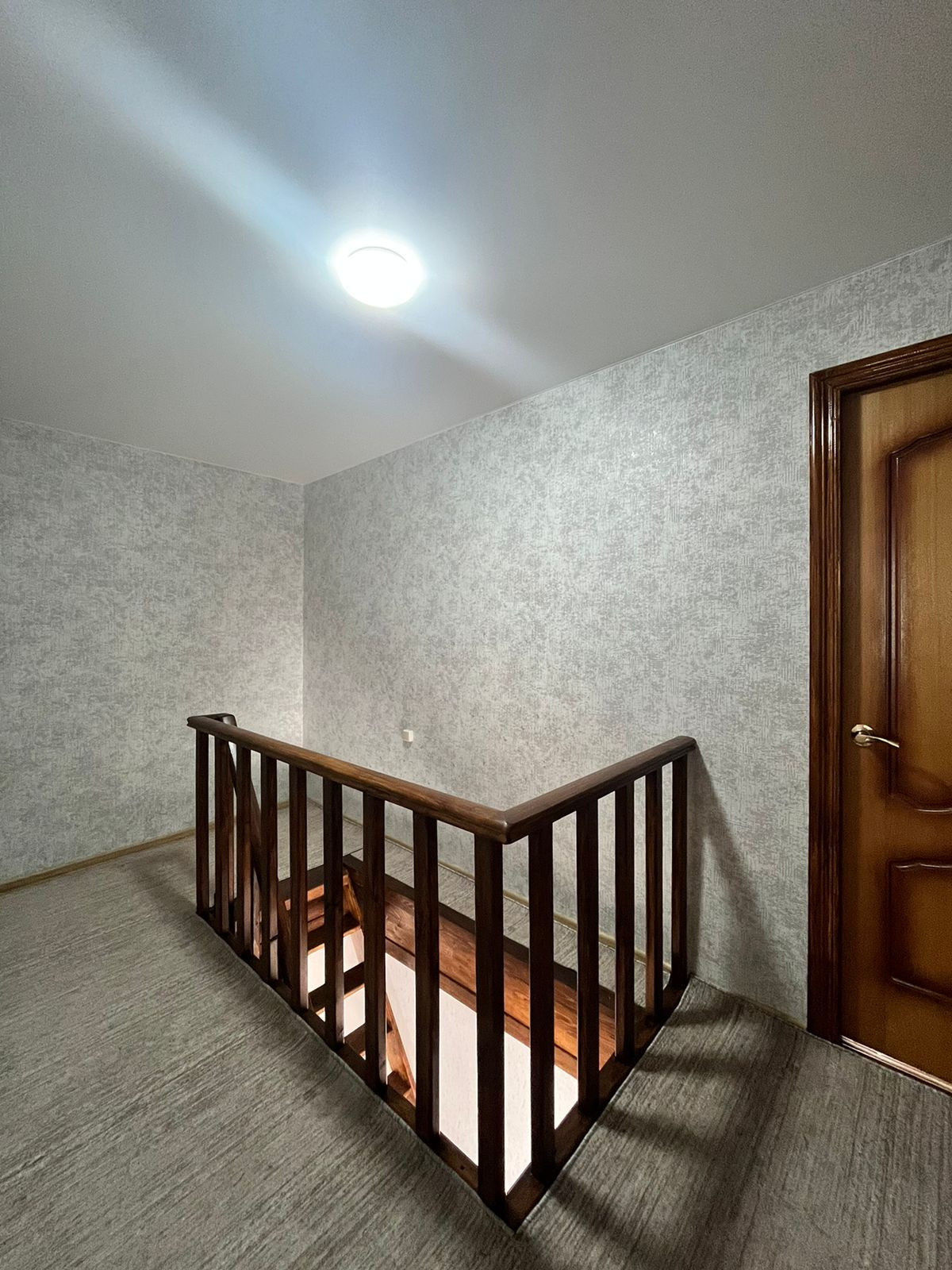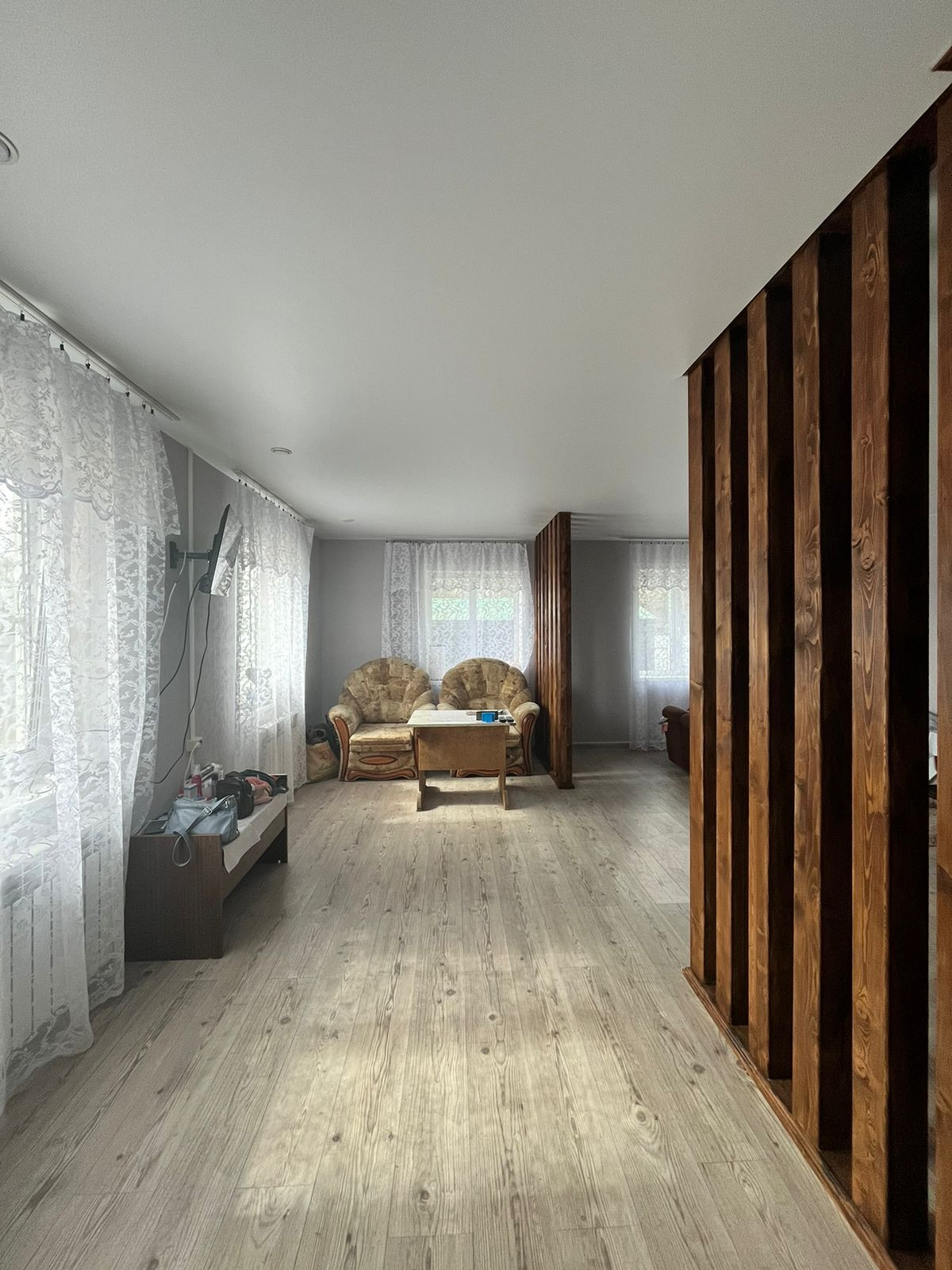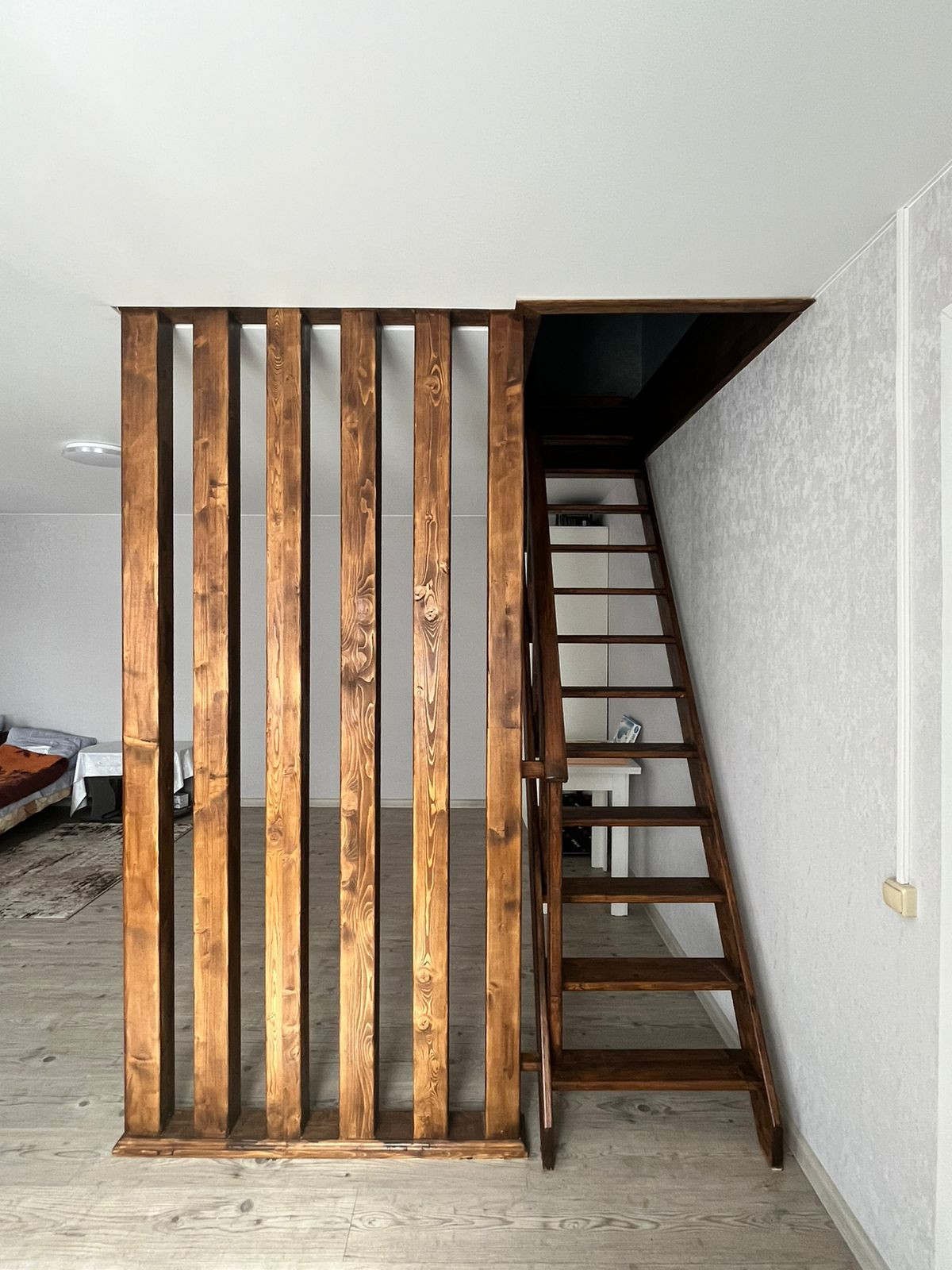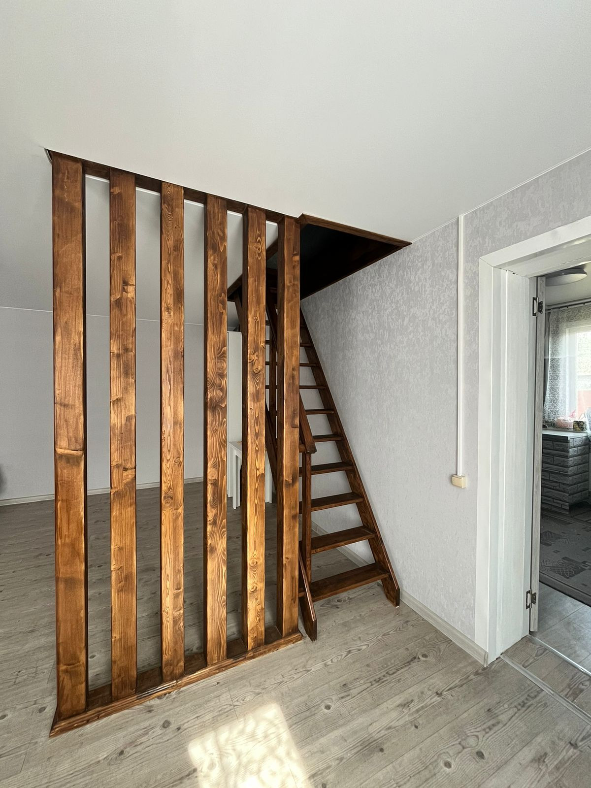 Пол – ламинат, с подогревом по всему первому этажу. В гостиной пространство разделено на зоны (спальную и гостевую) декоративными деревянными перегородками ручной работы. На втором этаже две большие светлые спальни с прекрасными видами из окон. Отделка стен – обои. Во всем доме – натяжные потолки.