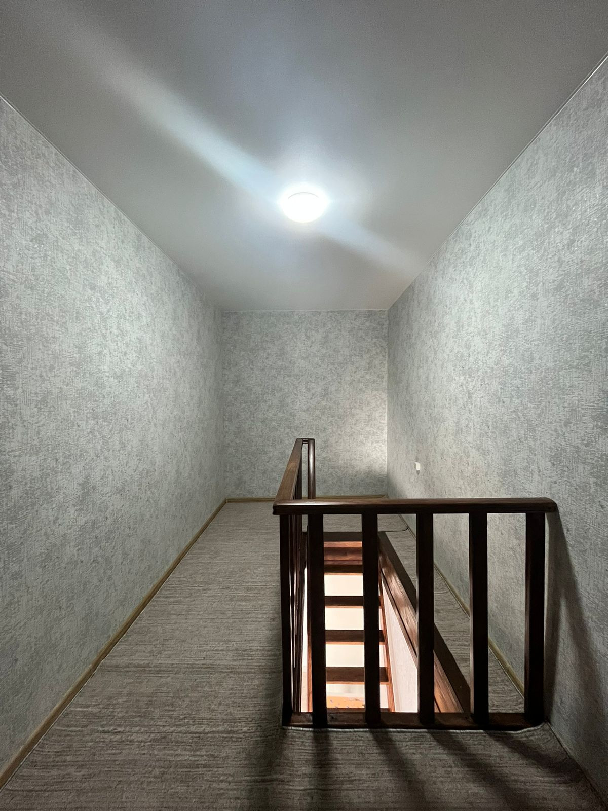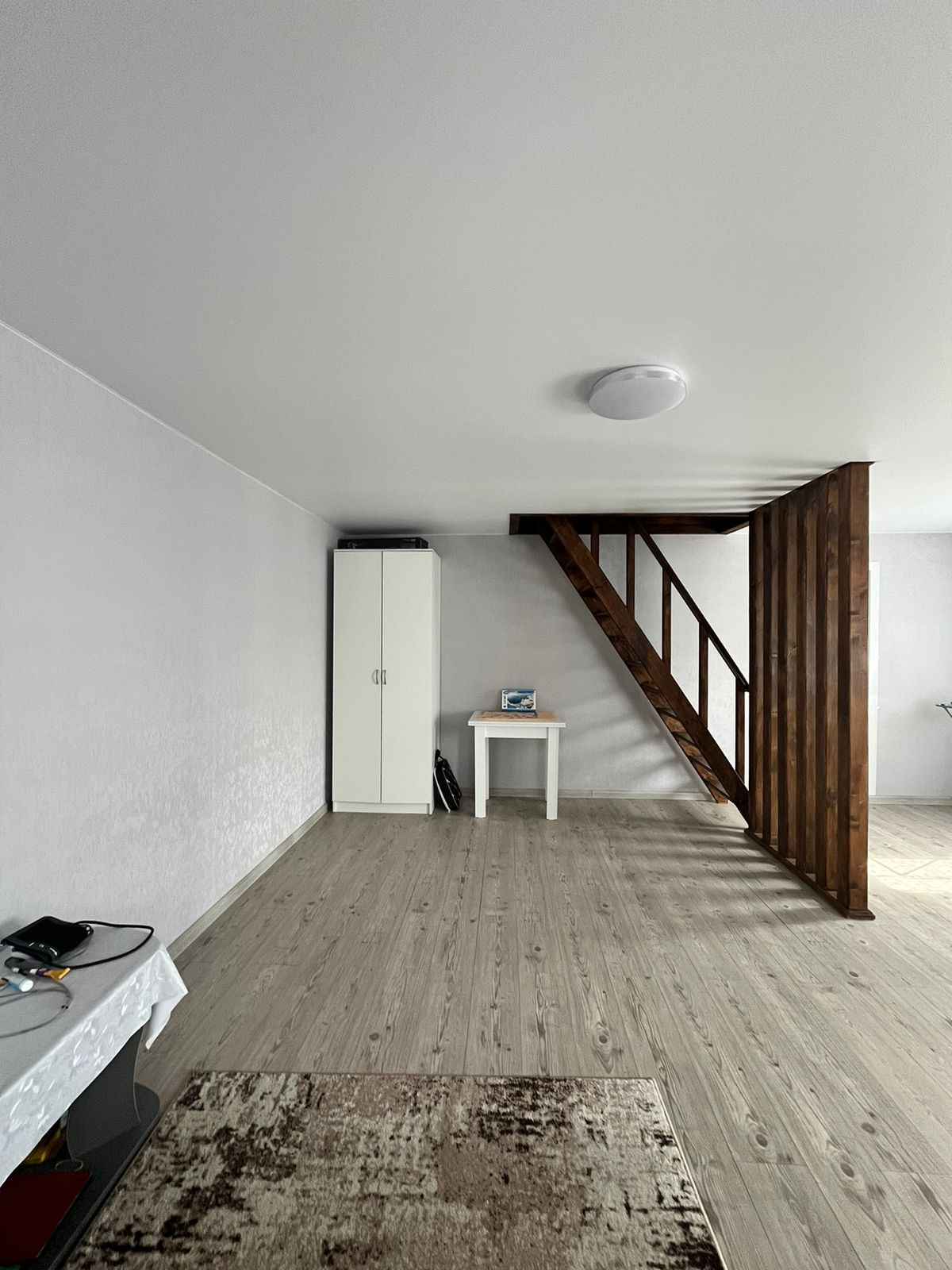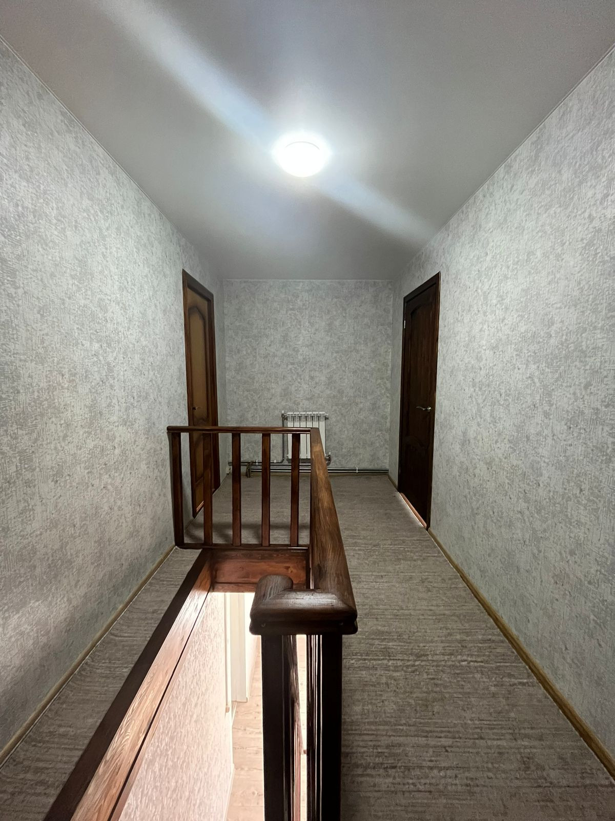 Пол – ламинат, с подогревом по всему первому этажу. В гостиной пространство разделено на зоны (спальную и гостевую) декоративными деревянными перегородками ручной работы. На втором этаже две большие светлые спальни с прекрасными видами из окон. Отделка стен – обои. Во всем доме – натяжные потолки.