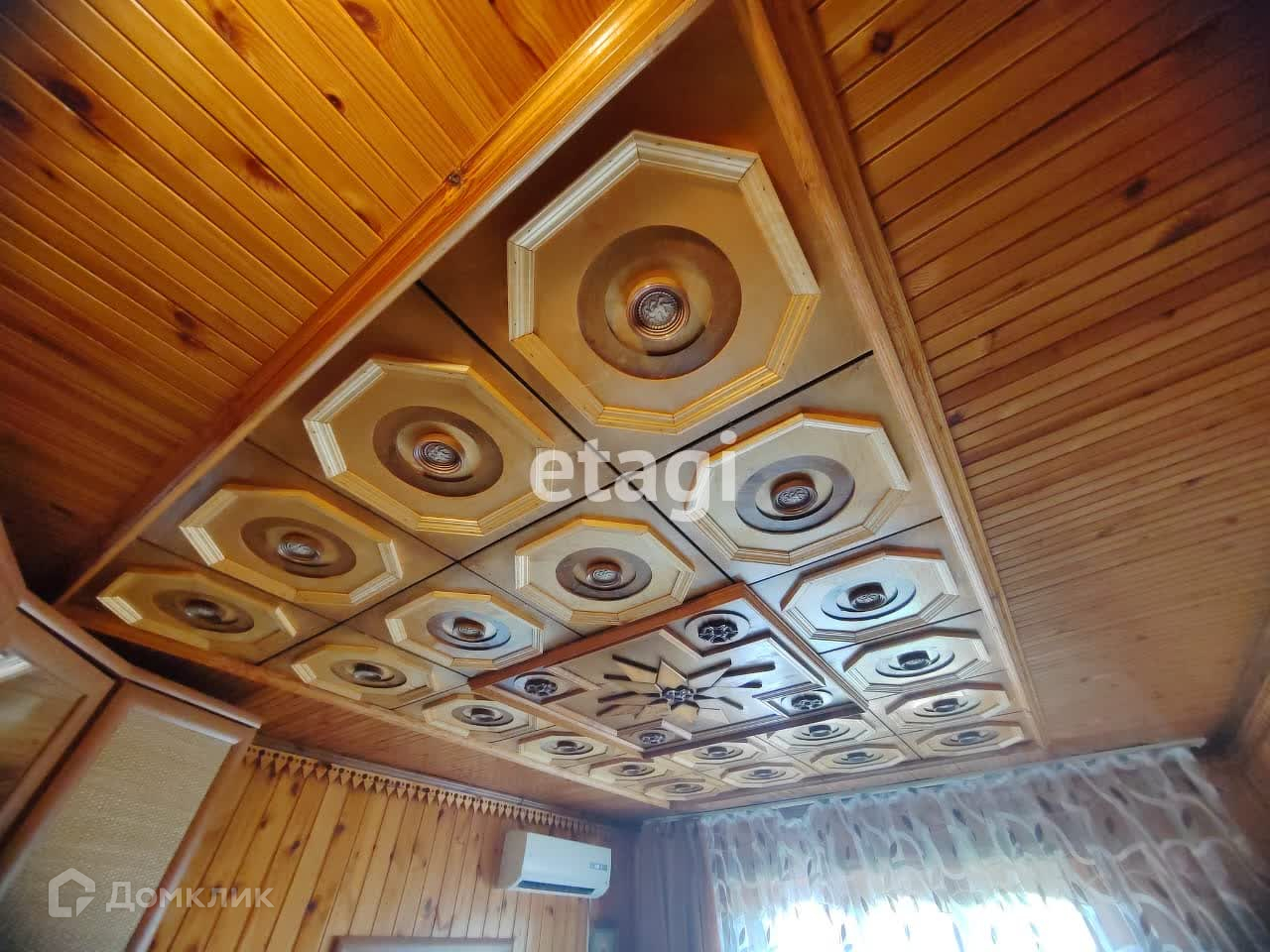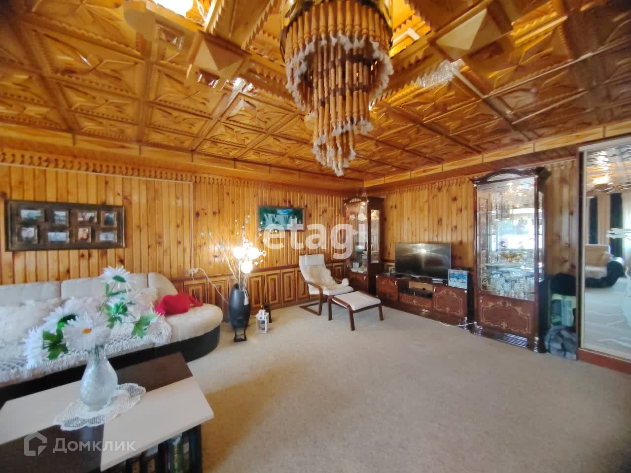 Дом состоит из трех этажей. Стоит заметить, что весь интерьер дома не имеет аналогов. На первом этаже в каждой комнате установлены деревянные резные потолки ручной работы и добротные деревянные окна. Прихожая обшита евровагонкой, на полу ламинат. В гостинной на полу устелен ковролин, стены обшиты деревом. Главное украшение гостинной - авторский камин ручной работы. Может служить и в качестве отопительного прибора (но это ни к чему, так как в дом заведено газовое отопление), и в качестве атрибута для создания уютной обстановки для проведения зимних долгих вечеров.