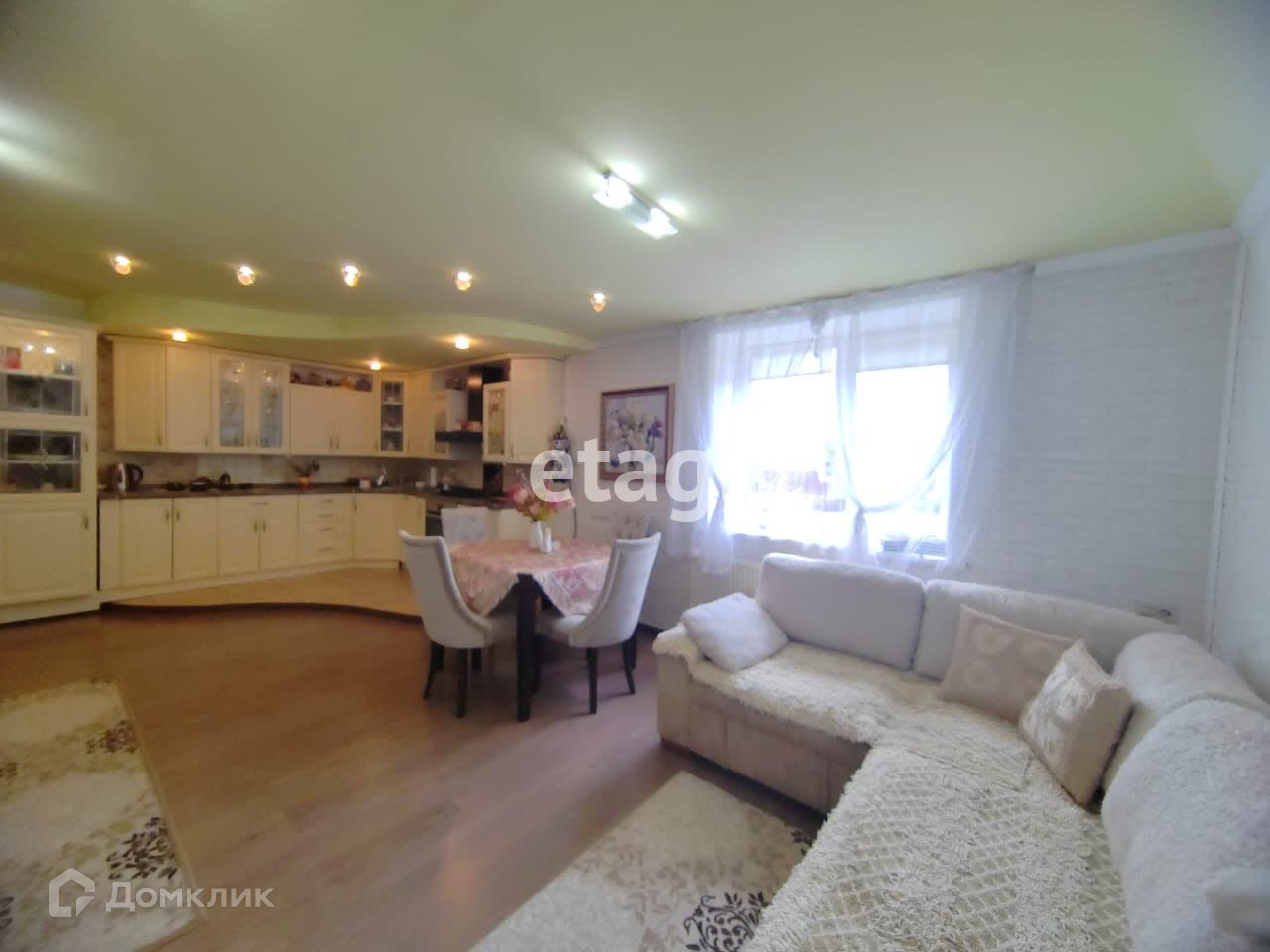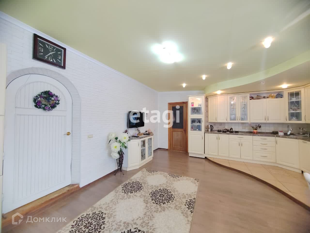 Большая светлая просторная кухня - мечта любой хозяйки остается при продаже. Из кухни так же есть удобный выход в огород. Еще один из плюсов данного дома - сауна! Она располагается на первом этаже и остается при продаже. Так же на первом этаже расположены санузел с просторной душевой кабиной и спальня.